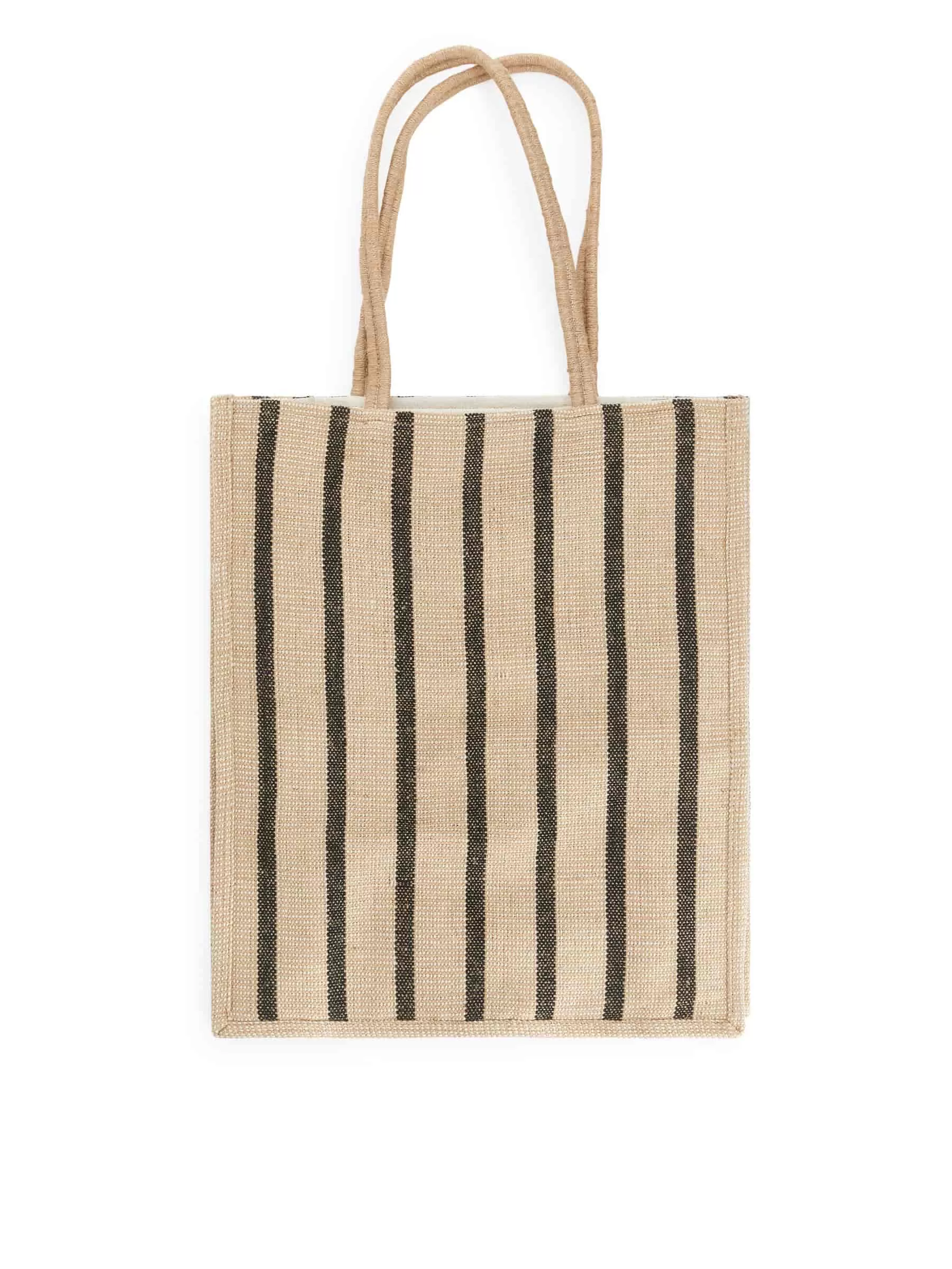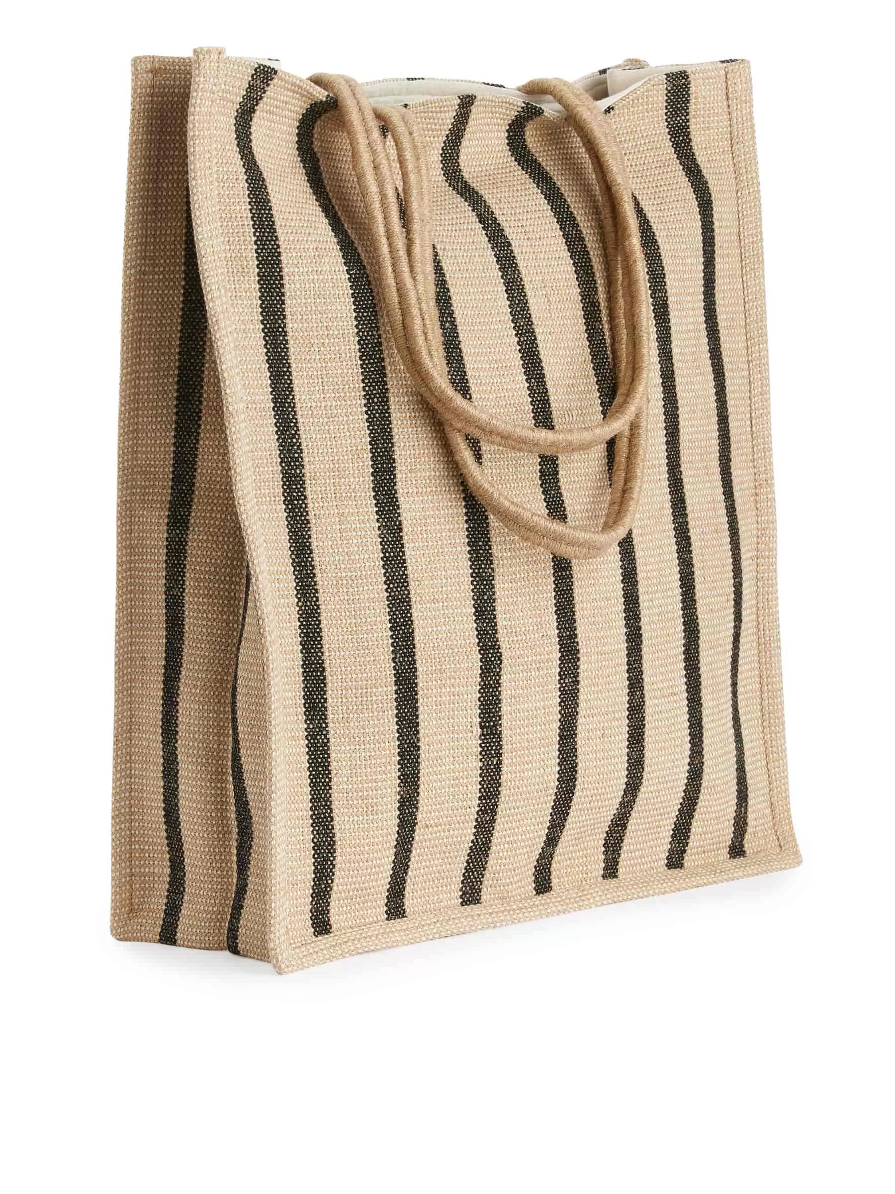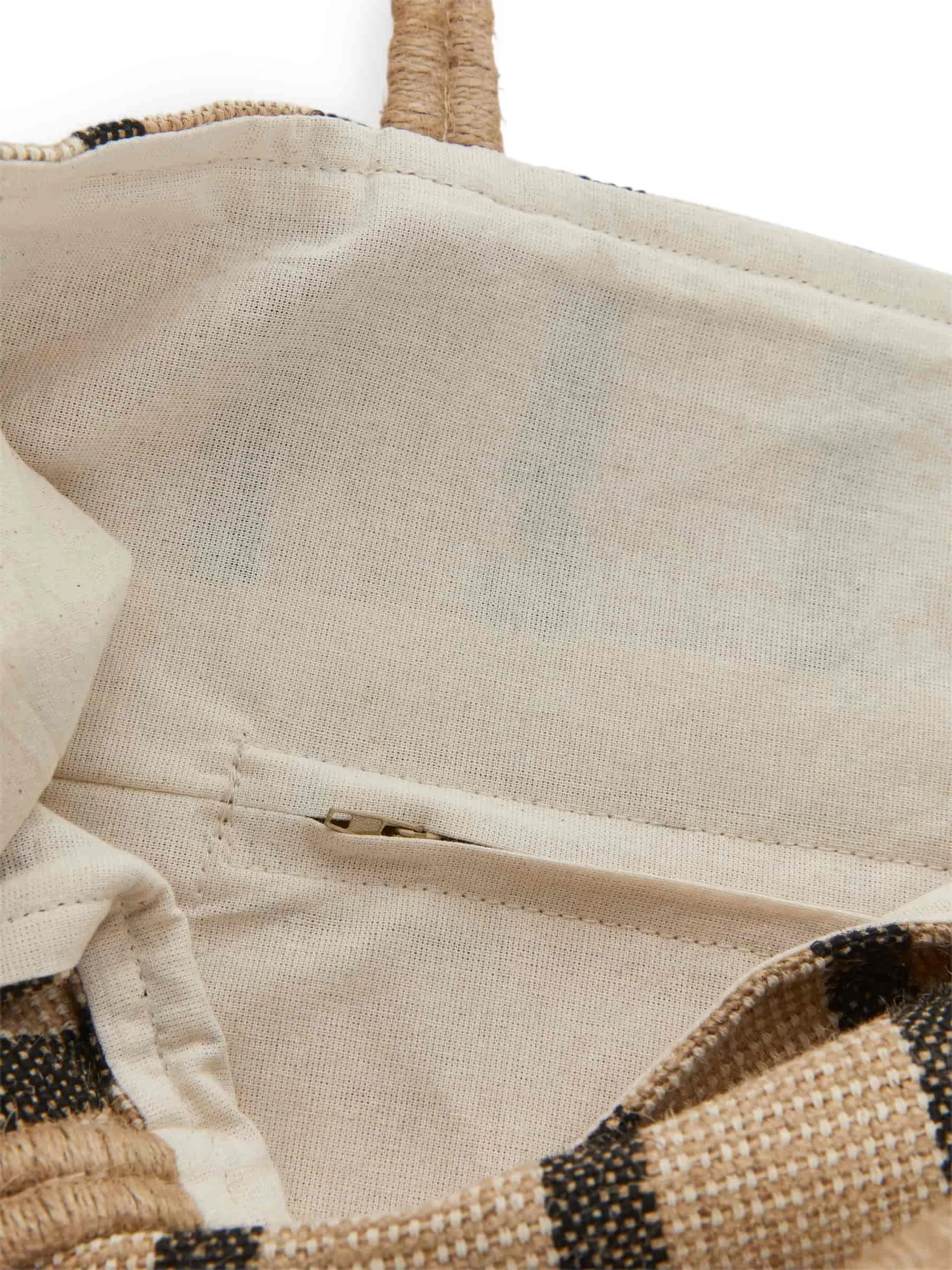Bolso tote tejido confeccionado en yute. Diseñado con asas dobles y un patrón de rayas. Forro de algodón y pequeño bolsillo interior con cierre de cremallera. Dimensiones 48 cm x 40 cm.