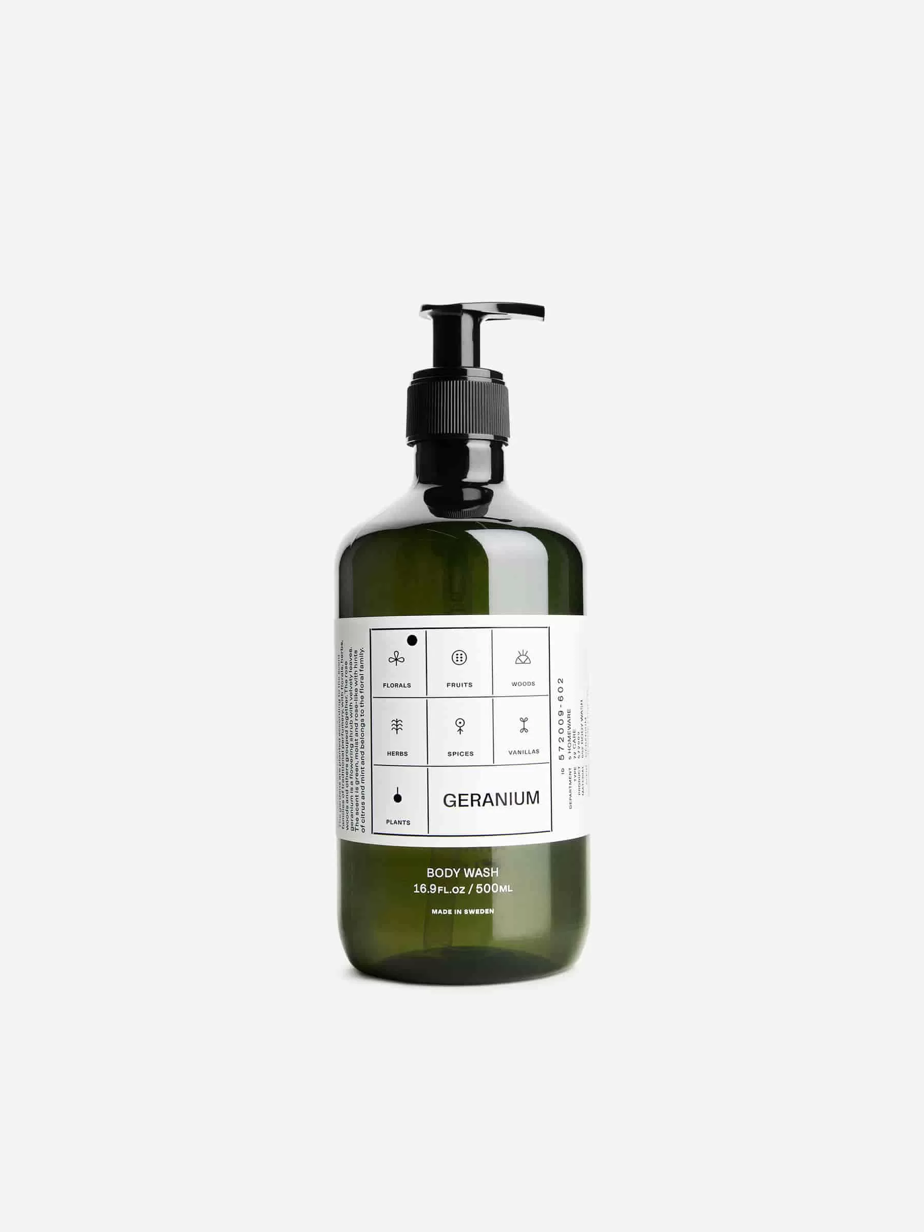 Lavado corporal líquido elaborado en Suecia con ingredientes inspirados en la flora nórdica. Forma una espuma cremosa que limpia suavemente la piel y la deja fresca, hidratada y ligeramente perfumada. El geranio tiene un aroma verde y rosado con toques cítricos y de menta. 500ml.