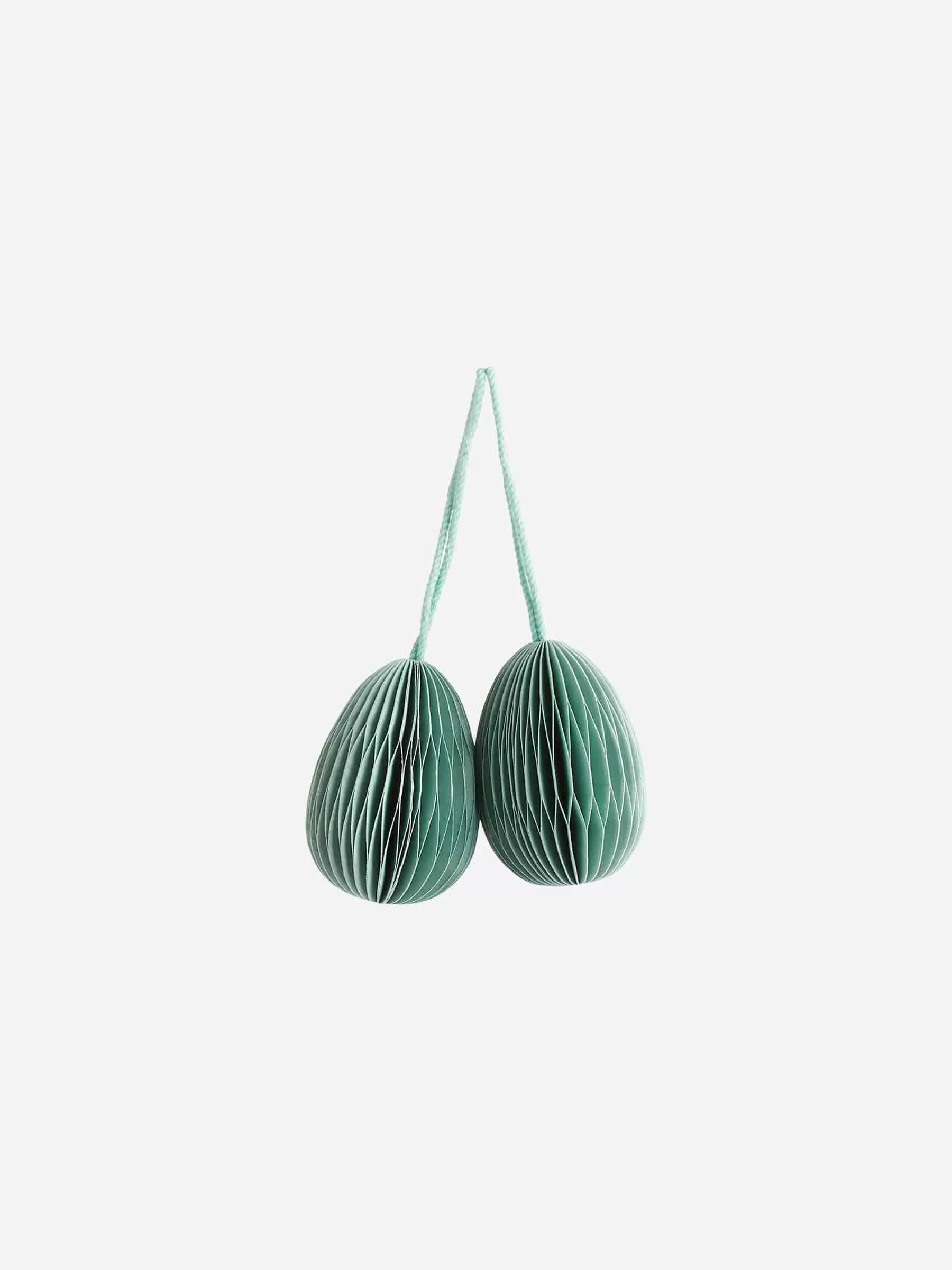 Adornos hechos de papel resistente y una cinta de algodón para colgarlos fácilmente. Alto del huevo 4,8 cm. Ancho 3,4 cm. Cinta de 6 cm. Paquete de dos.