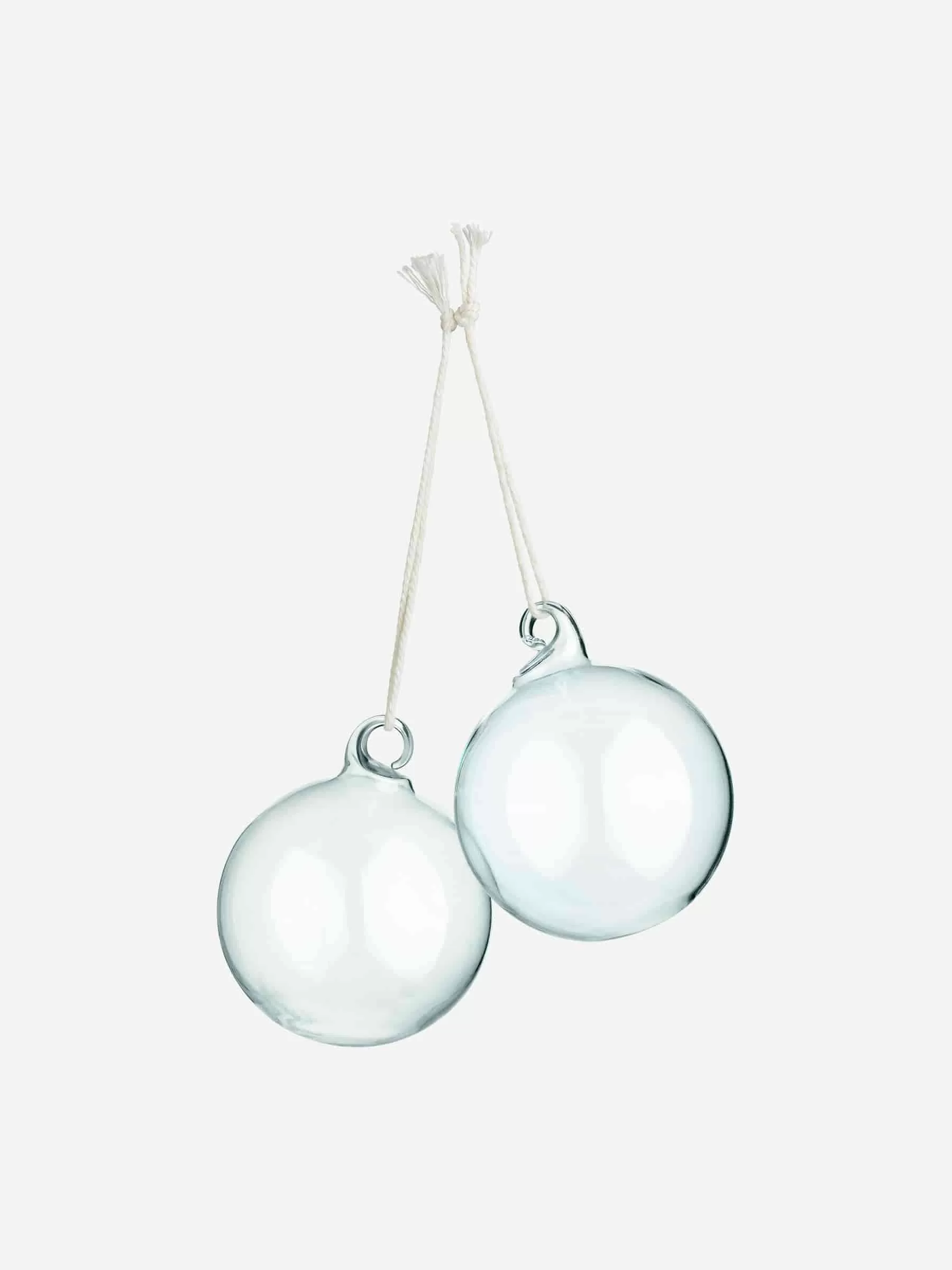 Delicados adornos de cristal. Diámetro 6 cm. Hilo de algodón 8,5 cm. Se vende en juegos de dos.