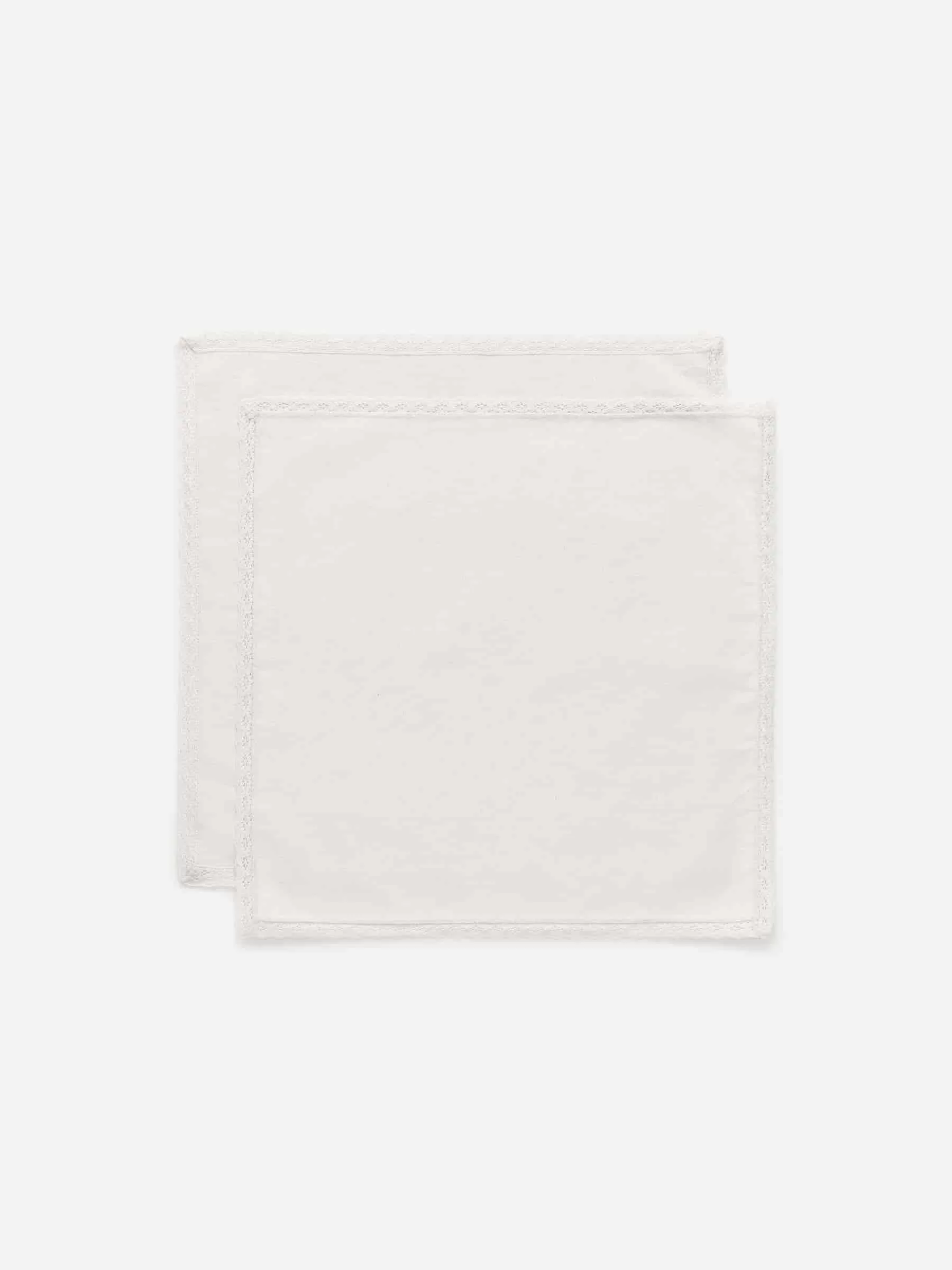 Servilletas con bordes de encaje confeccionadas en una mezcla de algodón y lino. Medidas 45 x 45 cm. Se vende en un juego de dos.