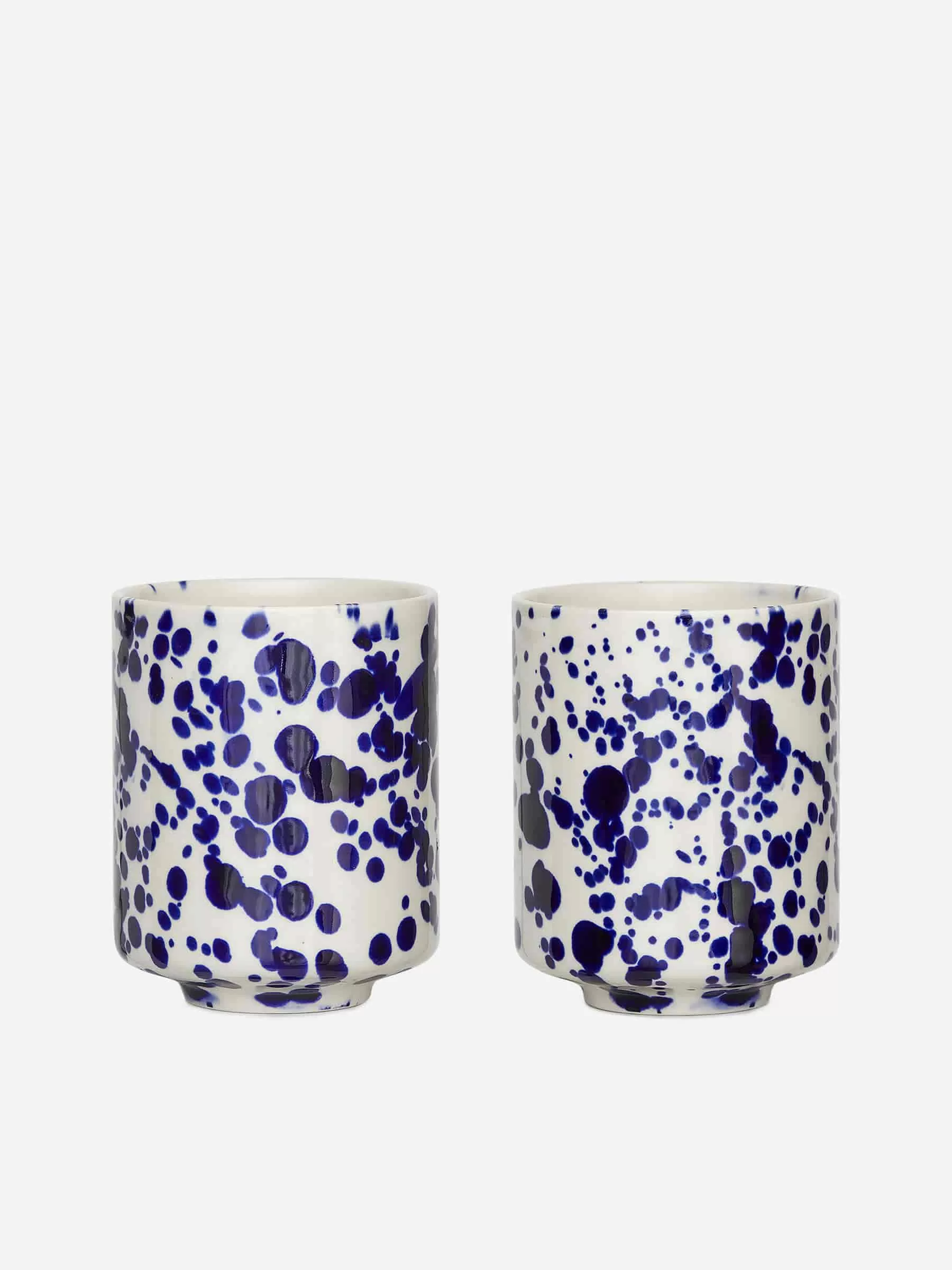 Tazas fabricadas en gres totalmente esmaltado. Cada producto tiene un acabado único ya que el proceso de fabricación se realiza en parte a mano. Alto 10 cm, diámetro 7,7 cm. Se vende como juego de dos. Apto para lavavajillas.