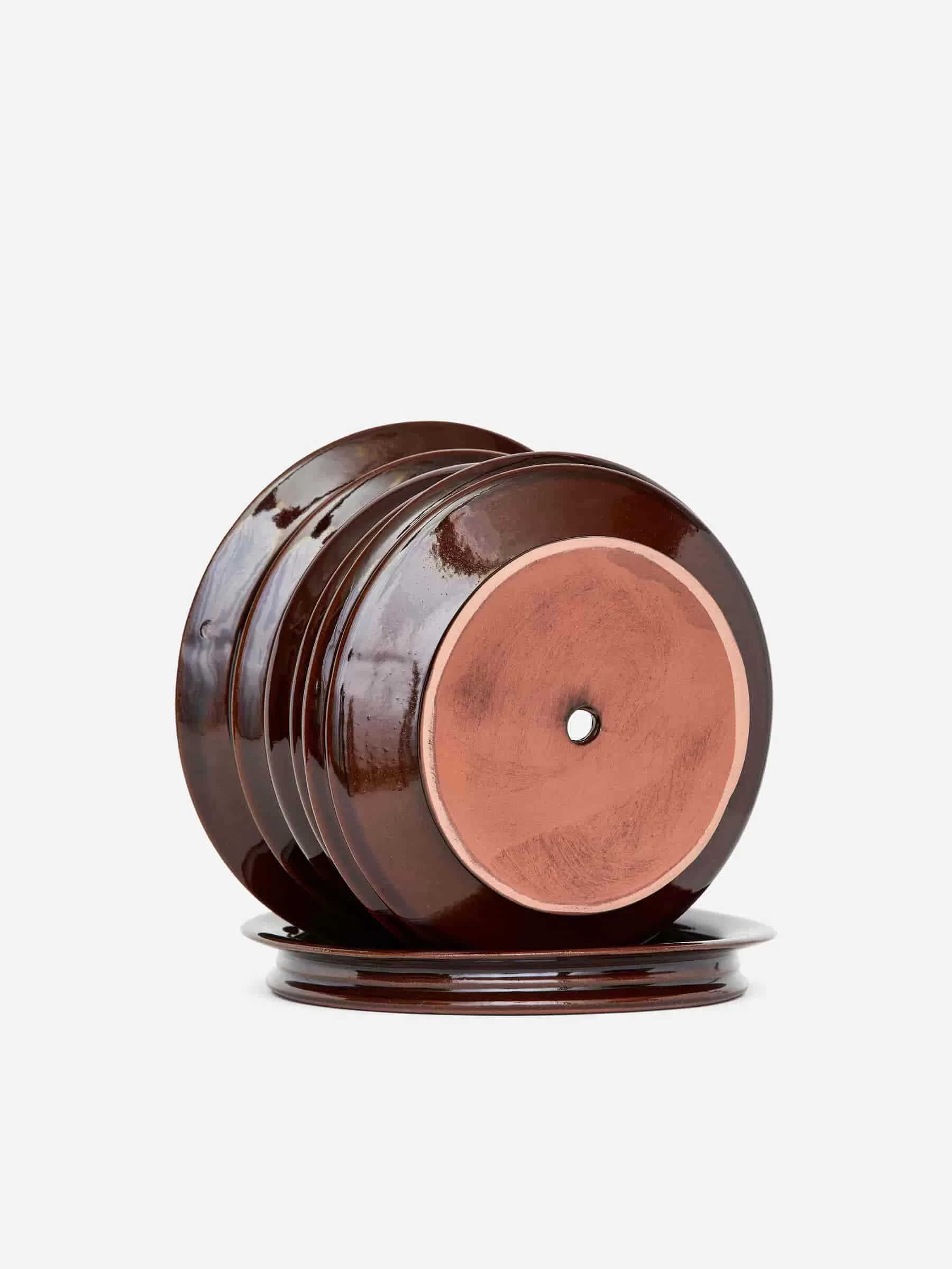 Maceta de cerámica con superficie esmaltada. La maceta tiene un orificio de drenaje en el fondo y un platillo separado para recoger el exceso de agua. Ancho 22 cm, alto 15,5 cm.