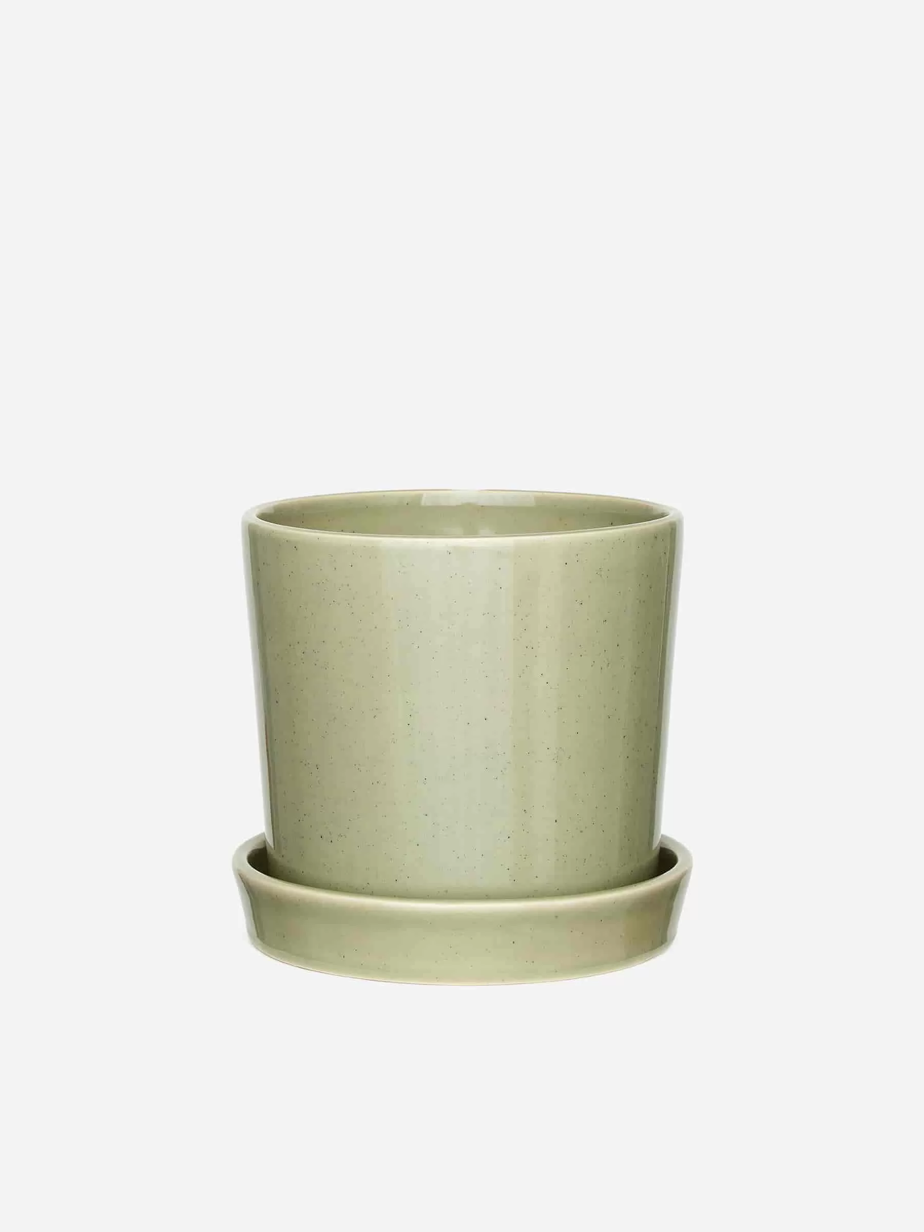 Una maceta hecha de gres esmaltado con un platillo a juego. Agujero en el fondo y platillo de borde alto que recoge el exceso de agua. Maceta: altura 170 mm, diámetro 180 mm. Platillo: altura 35 mm, diámetro 185 mm.