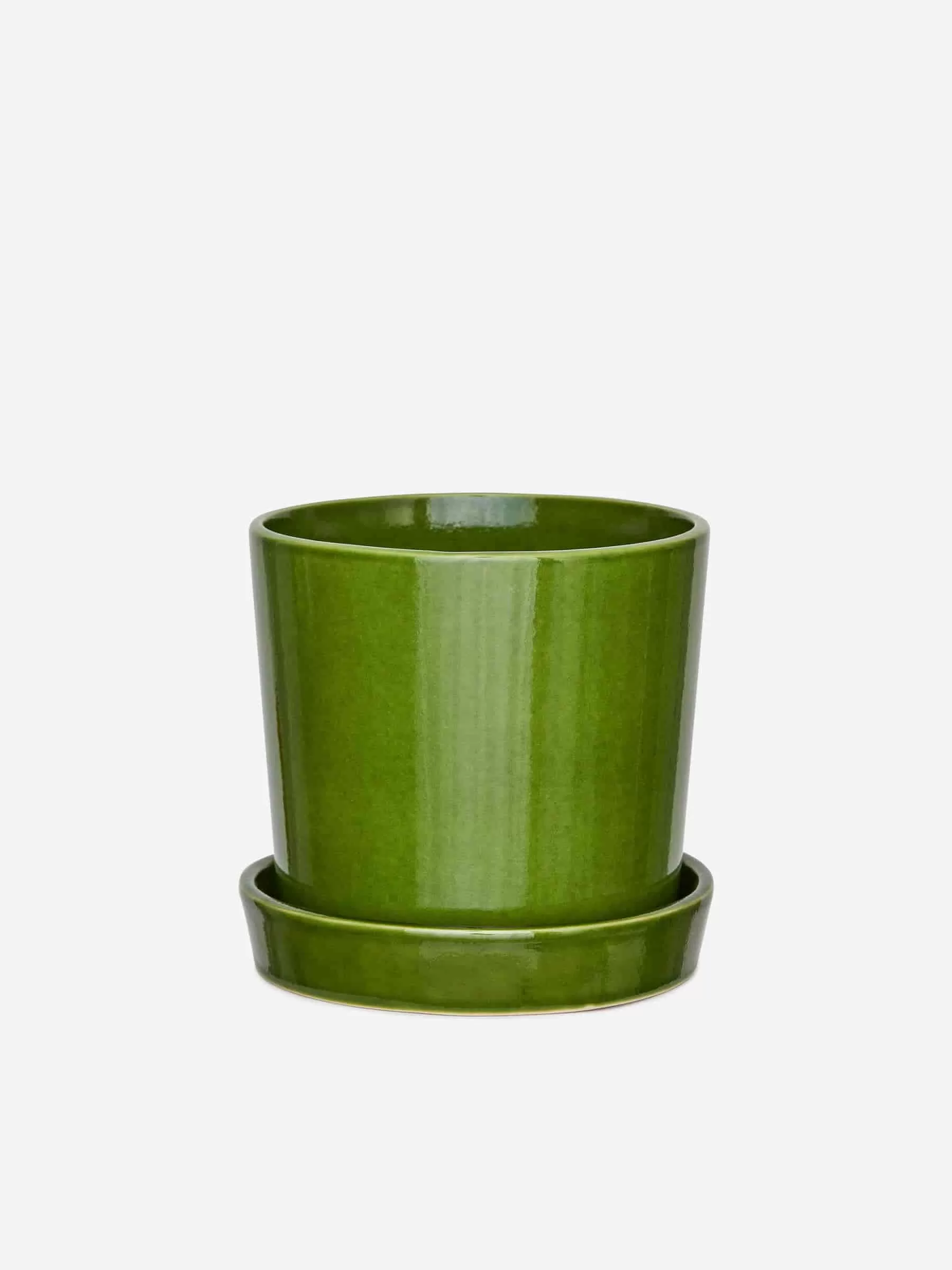 Una maceta hecha de gres esmaltado con un platillo a juego. Agujero en el fondo y platillo de borde alto que recoge el exceso de agua. Maceta: altura 170 mm, diámetro 180 mm. Platillo: altura 35 mm, diámetro 185 mm.