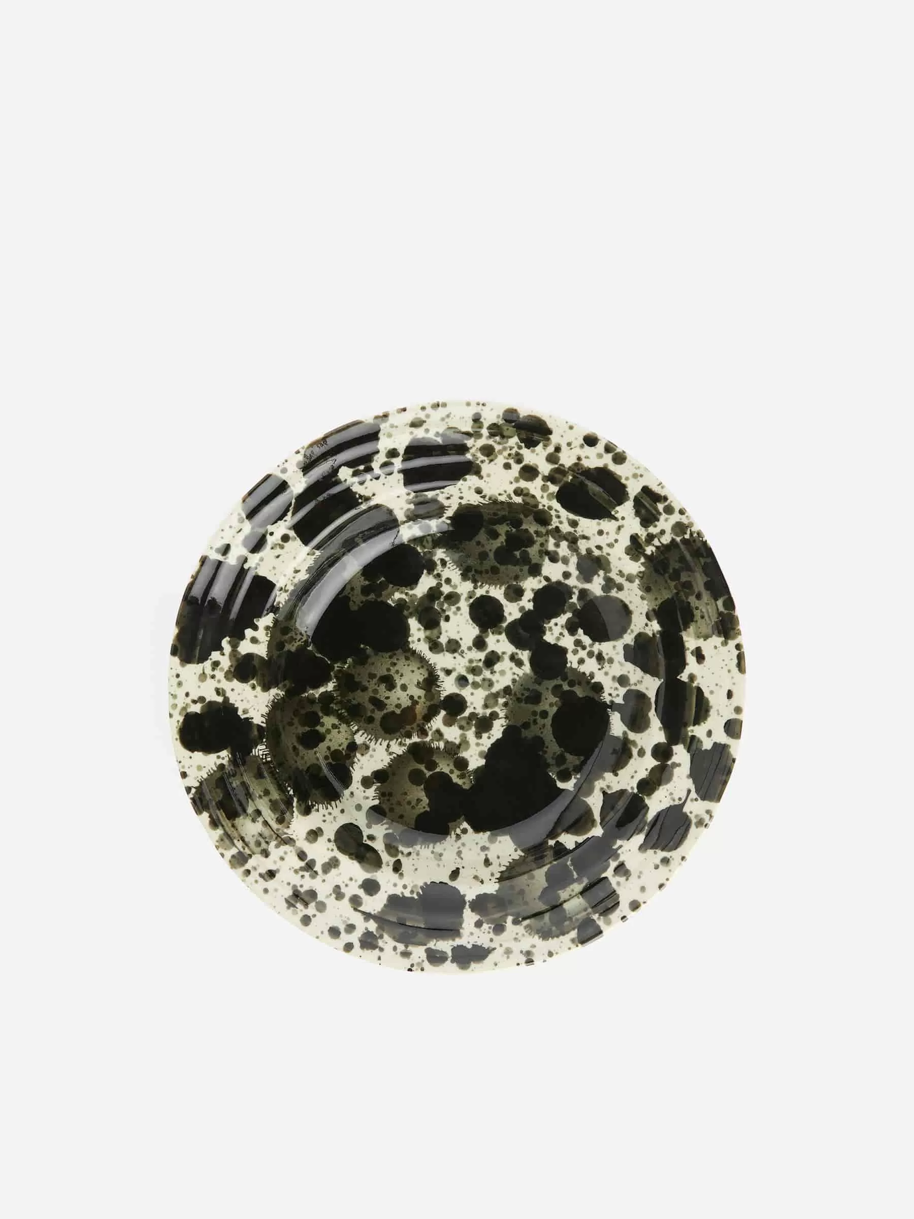Plato hondo para comer y servir. El plato está hecho de gres, presenta una forma ligeramente irregular y un patrón de salpicaduras pintado a mano. Cada pieza tiene un acabado único. Diámetro 21,5 cm, altura 3 cm.