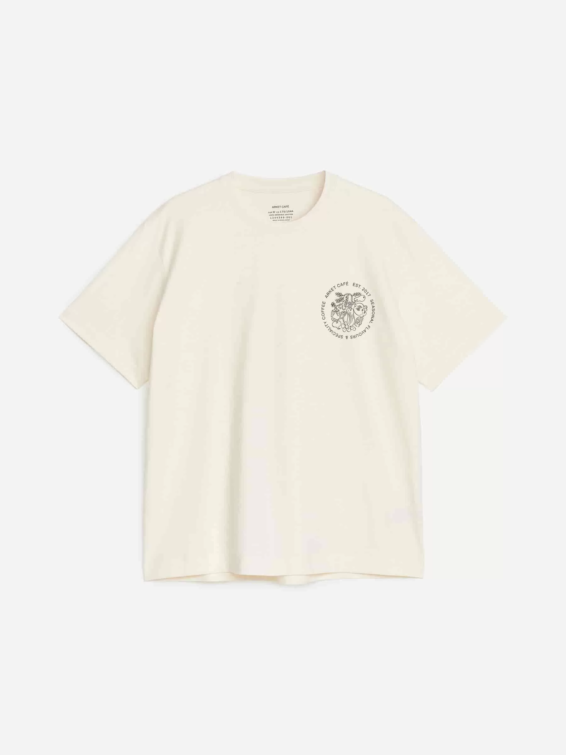 Camiseta unisex con motivo estampado en la parte delantera. Un estilo de manga corta confeccionado con un punto sencillo de algodón de peso medio de 220 GSM. Corte para un ajuste generoso. Este producto forma parte de la colección ARKET CAFÉ con ilustraciones de Olga Prader.