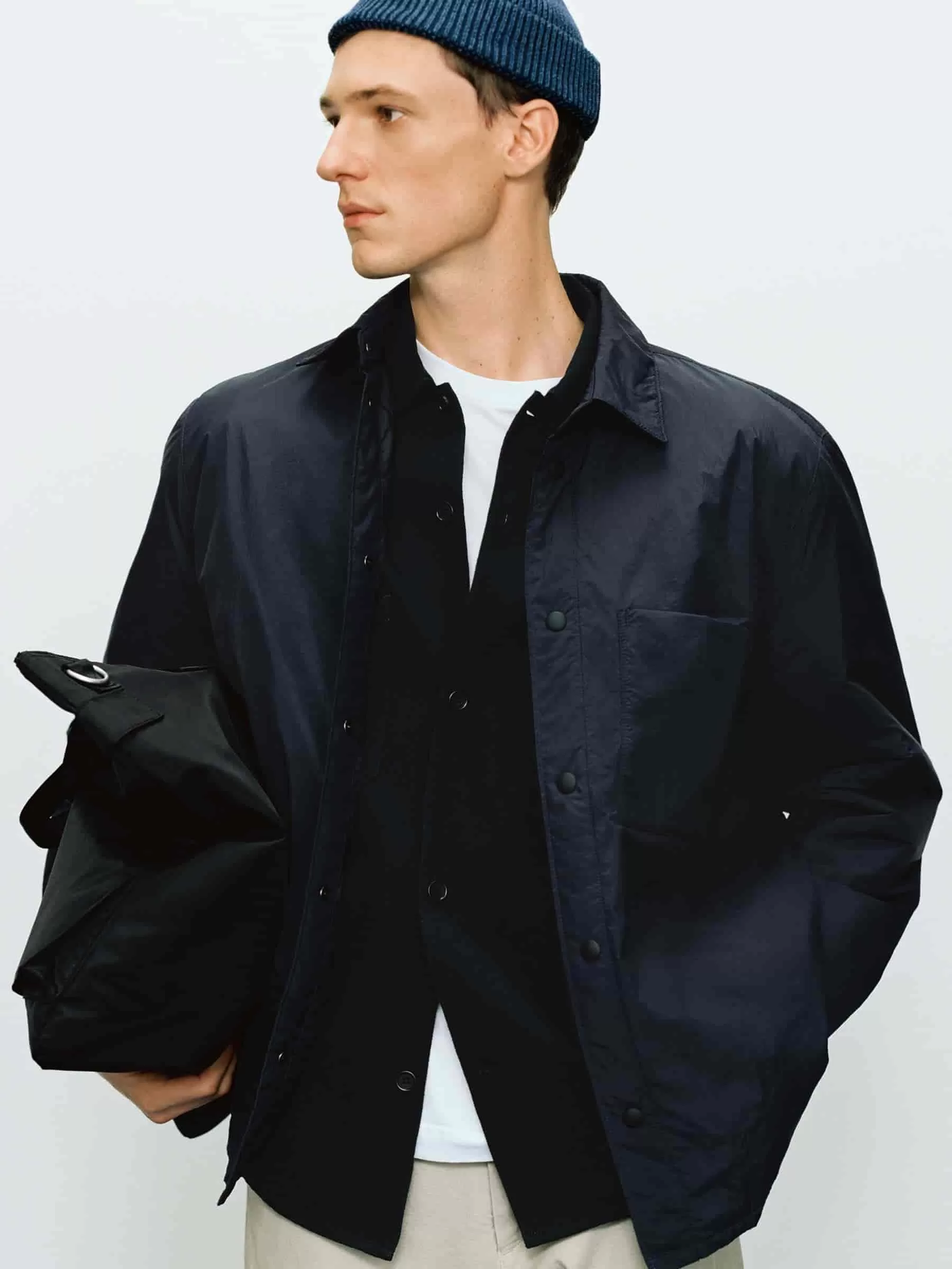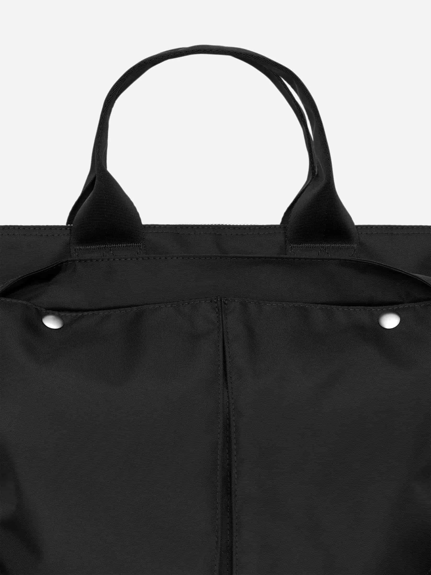 Bolsa espaciosa, desarrollada a partir de una bolsa para casco de aviador original de los años 60. Con forro acolchado y dos grandes bolsillos exteriores con cierre de botón a presión oculto. Dos asas de cincha resistentes y una correa para el hombro desmontable. Cierre con cremallera y bolsillo interior con cremallera. Medidas 47 cm x 46 cm.