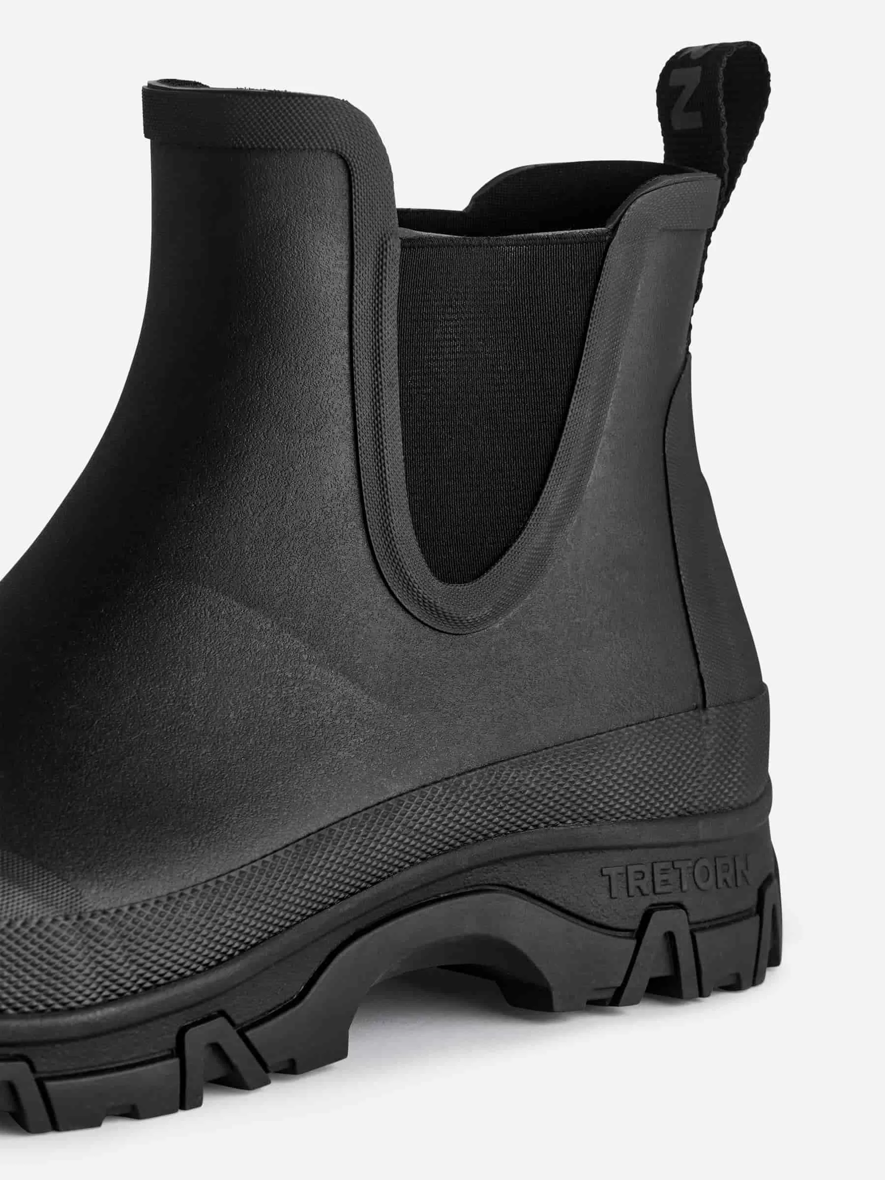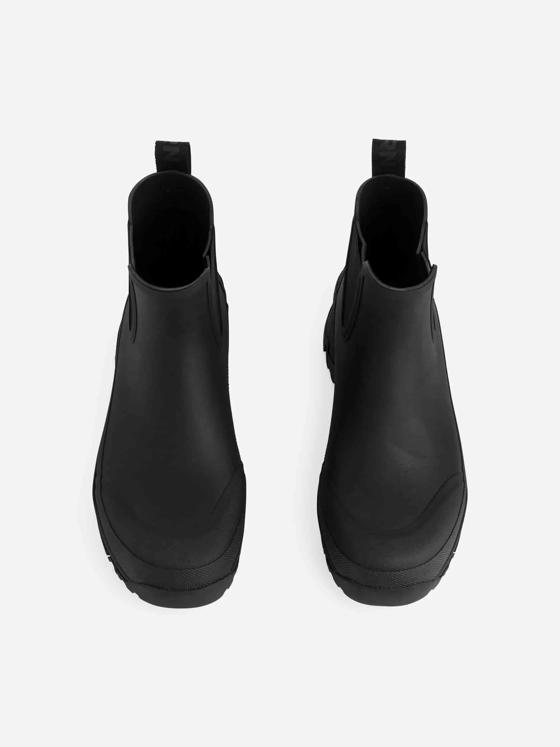 Bota híbrida impermeable fabricada con caucho natural certificado FSC y forro de malla de aire de secado rápido. Tiradores para vestirse fácilmente. Vástago de metal en la entresuela y patrón de suela resistente para una gran estabilidad.