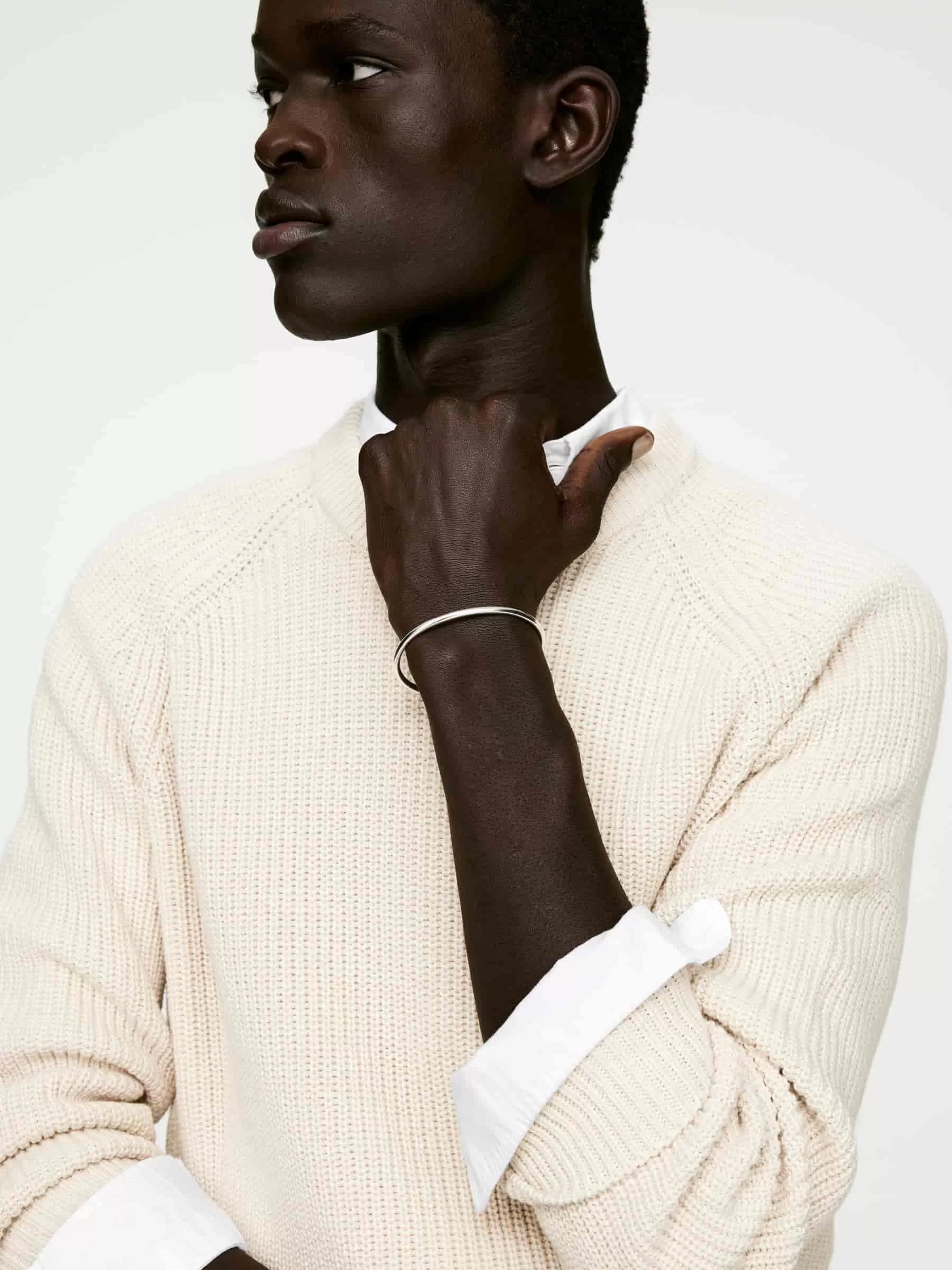 Pulsera tipo puño fino con forma redondeada en plata de primera ley maciza. La plata no está chapada, lo que facilita su pulido con cualquier paño para pulir plata.