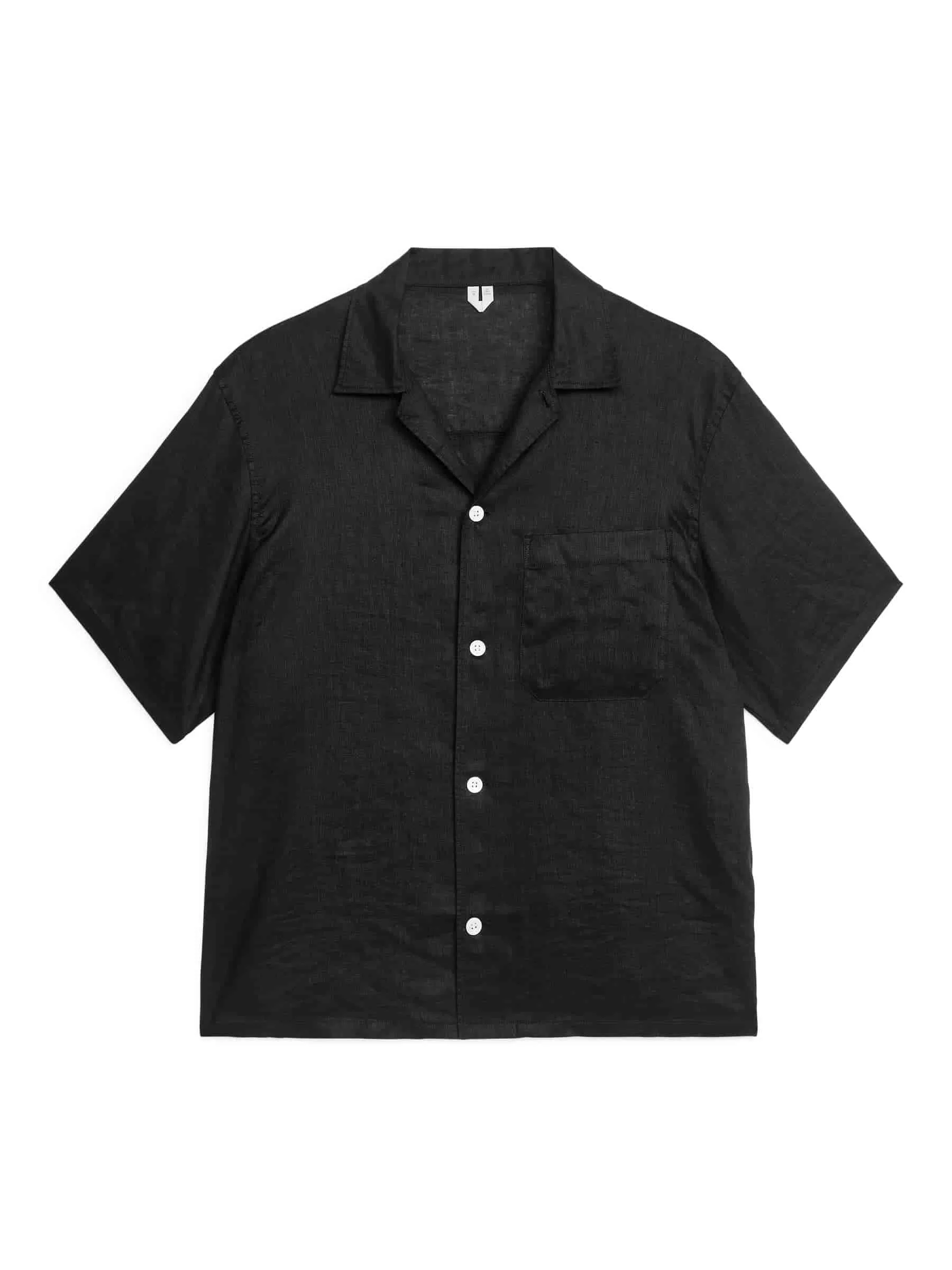 Esta camisa de manga corta, con un corte cómodo y holgado, está confeccionada con un tejido de lino ligero y transpirable. Diseñado con cuello resort, botones delanteros y un solo bolsillo en el pecho.