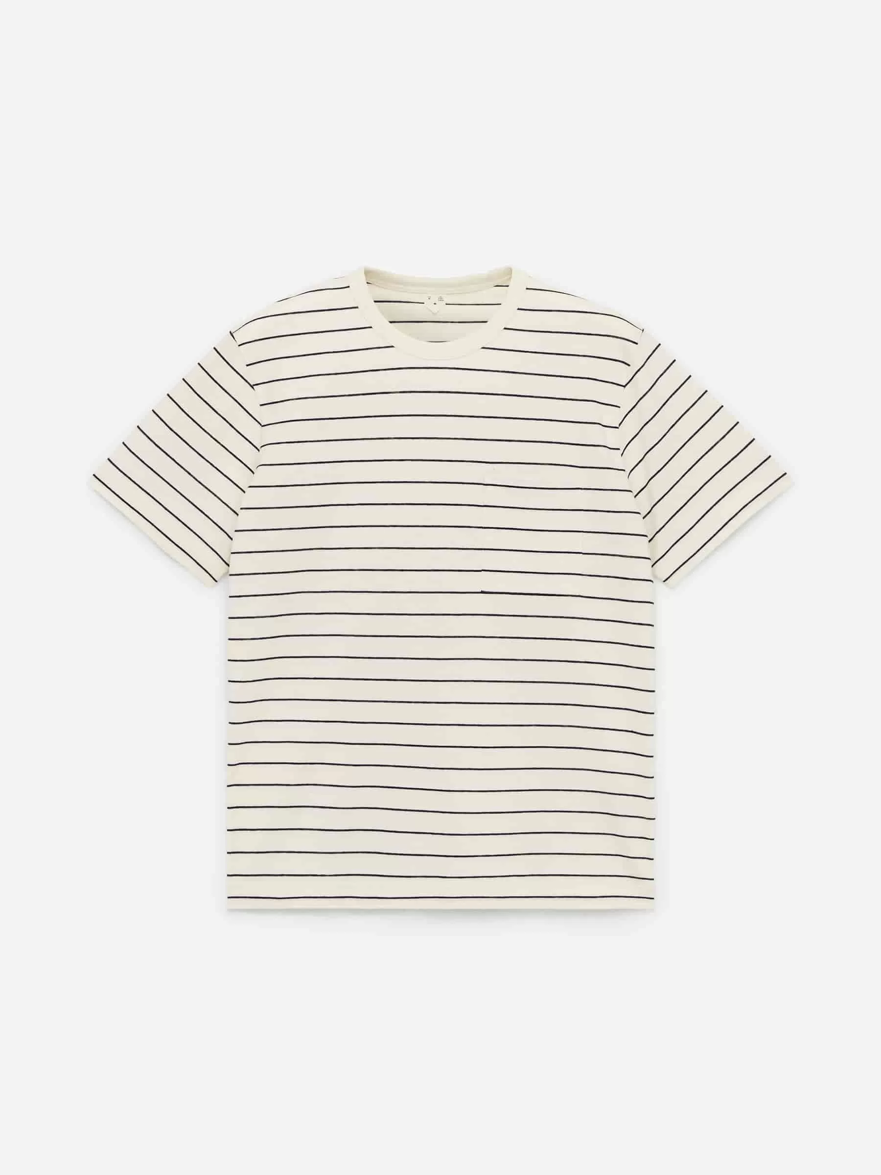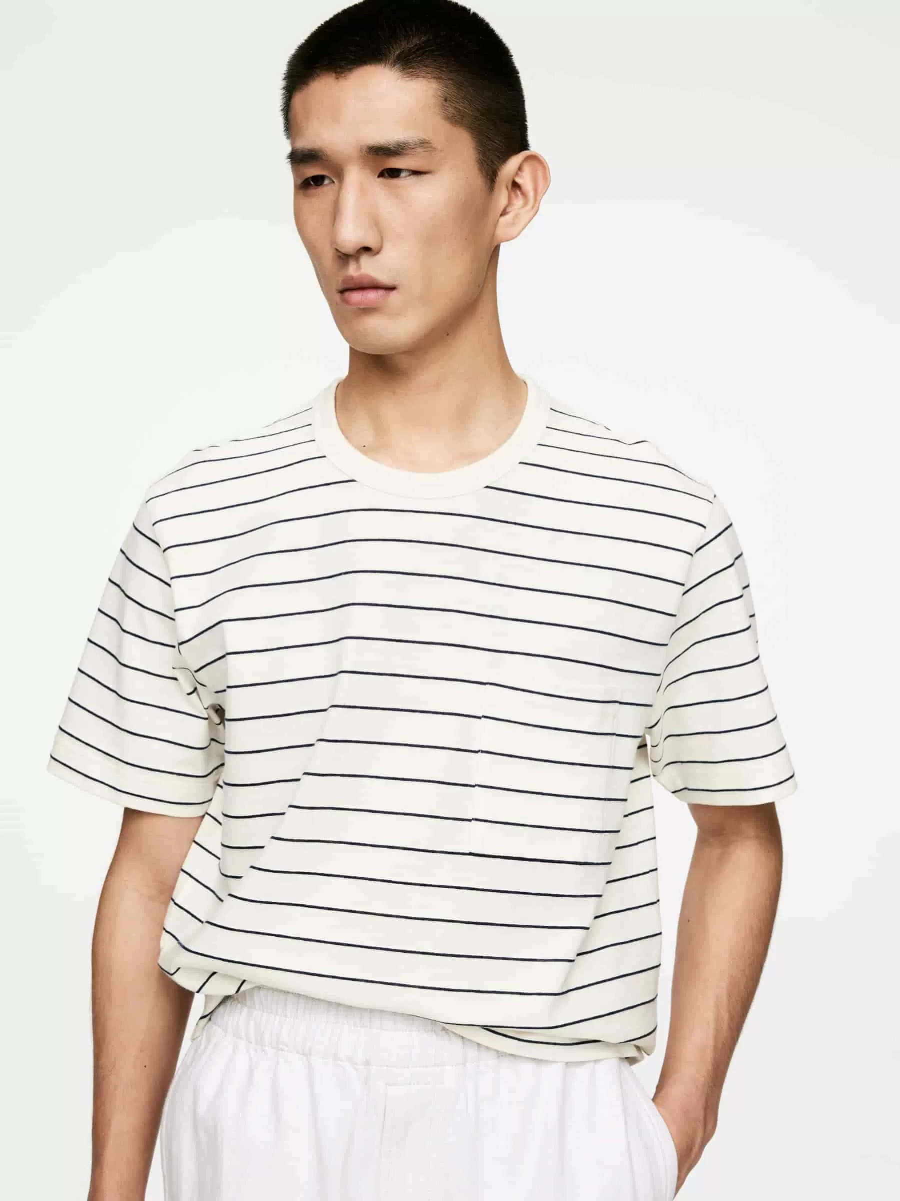 Camiseta de manga corta confeccionada en mezcla de algodón y lino. Corte regular fit y estilo con cuello redondo y bolsillo en el pecho.