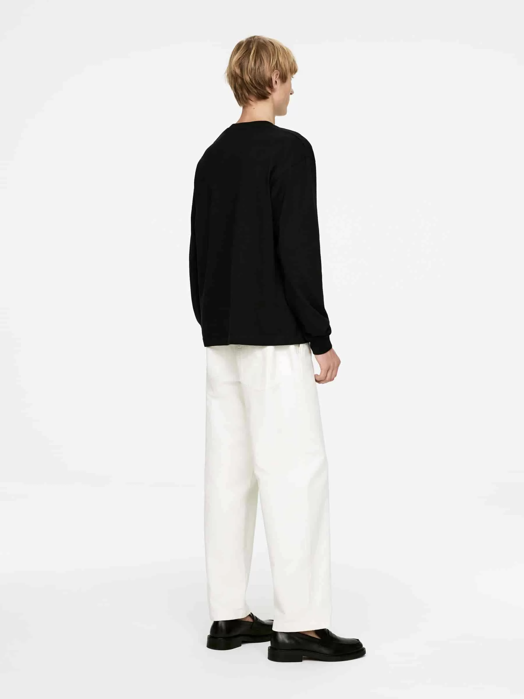Camiseta de algodón de manga larga, corte holgado y hombros caídos. Canalé en puños y cuello.