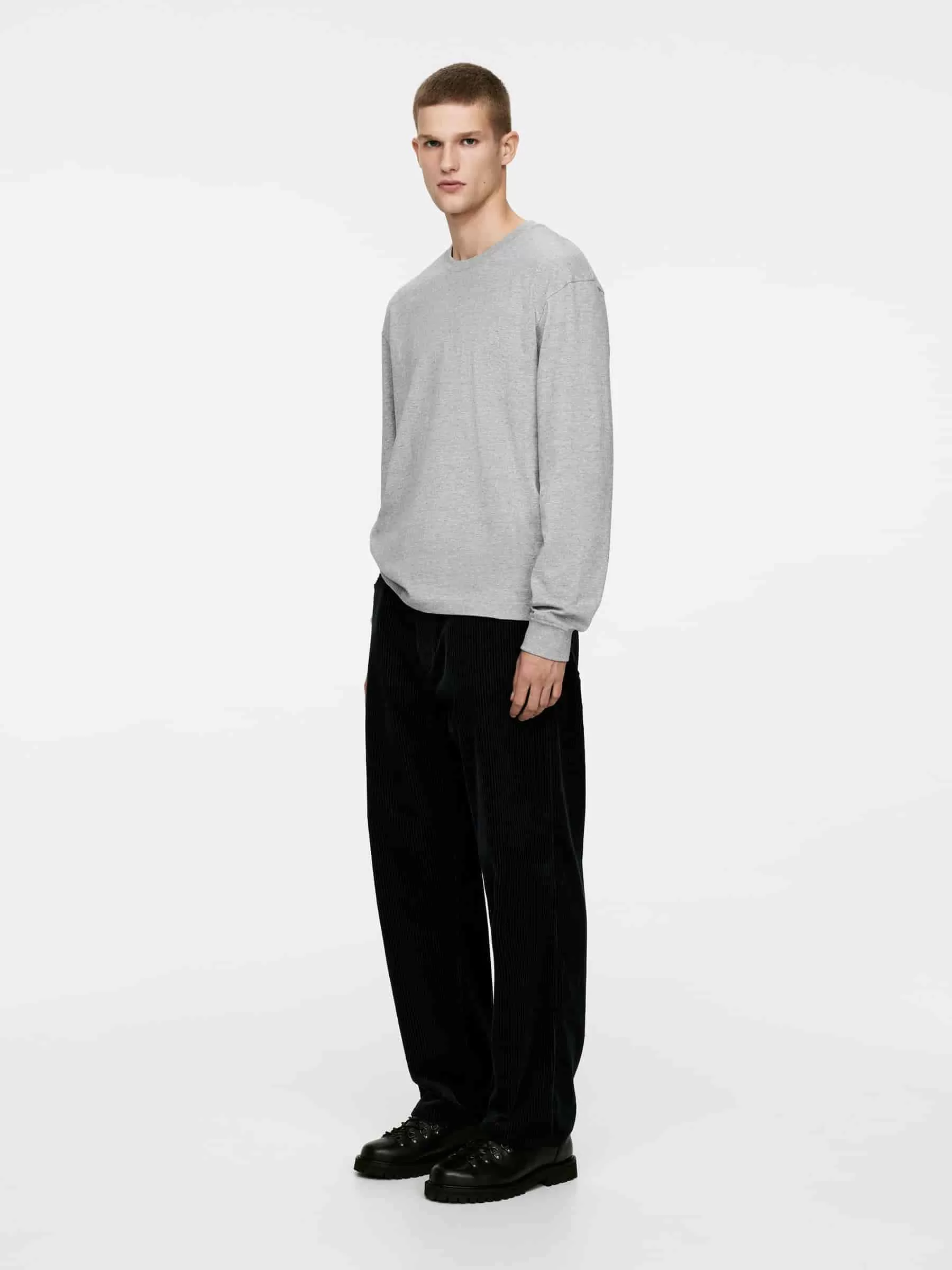 Camiseta de algodón de manga larga, corte holgado y hombros caídos. Canalé en puños y cuello.