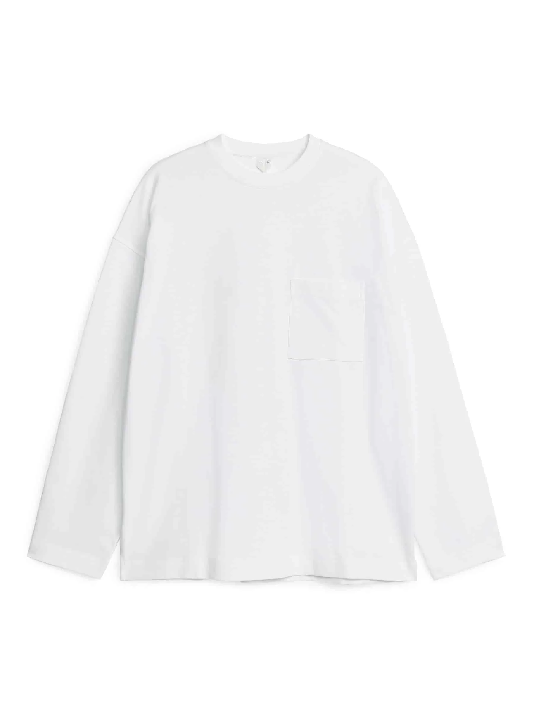 Camiseta de manga larga en calidad algodón mercerizado. Este modelo tiene un ajuste relajado y hombros ligeramente caídos. Bolsillo único en el pecho.