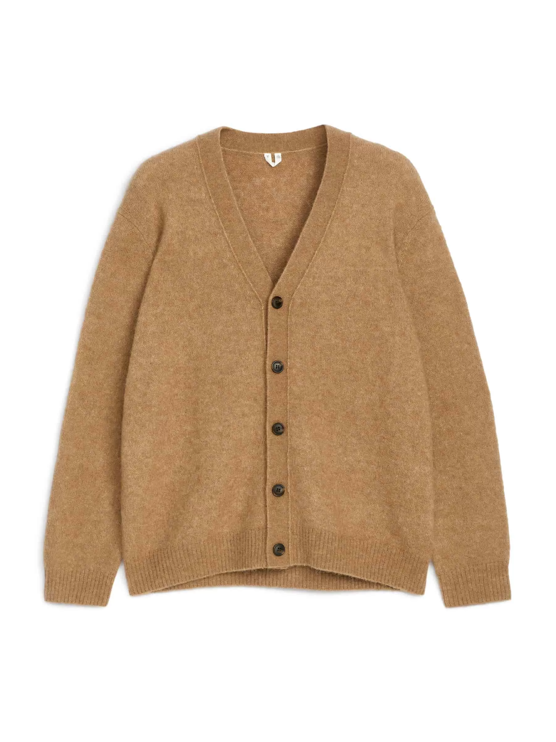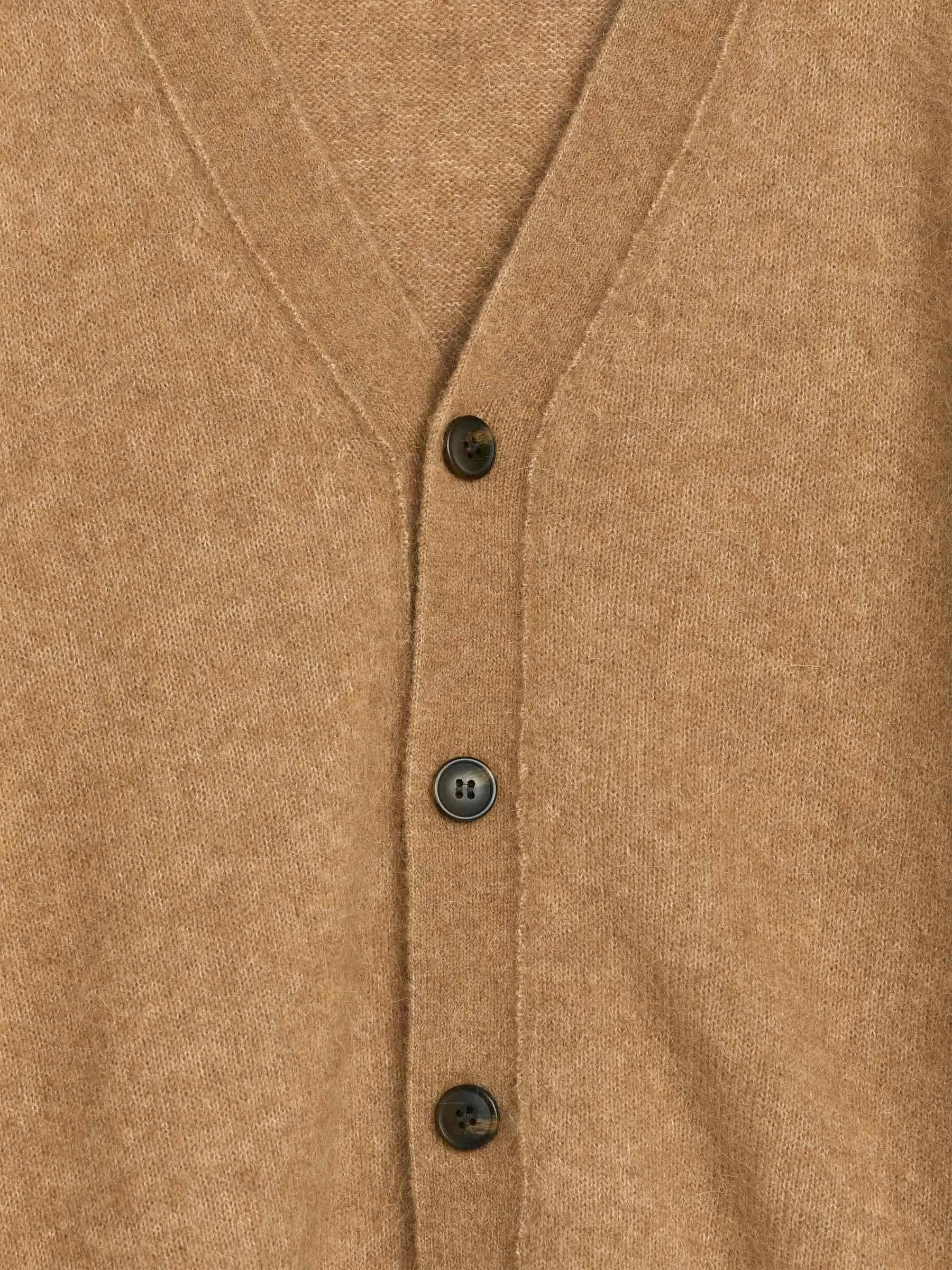 Cárdigan relajado confeccionado en una mezcla de lana y alpaca con un acabado peludo. Modelo con cuello en V, cierre de botones y canalé en puños y dobladillo inferior. Este estilo contiene 34% RAS Alpaca y 36% lana RWS (TE-00047206). Los productos certificados según el Estándar de lana responsable (RWS) y el Estándar de alpaca responsable (RAS) contienen lana y fibra de alpaca de granjas certificadas de forma independiente según los requisitos de bienestar animal y gestión de la tierra.