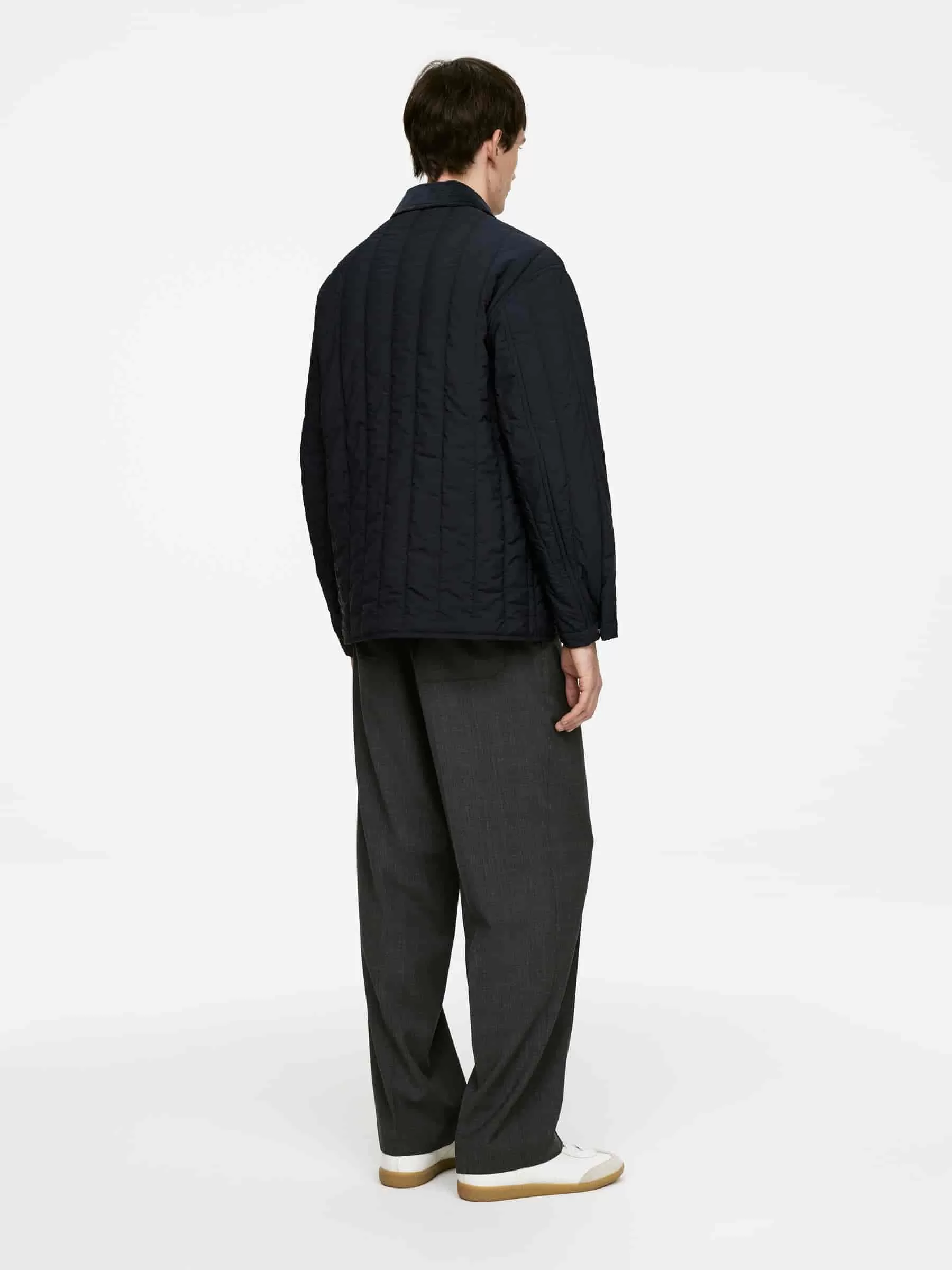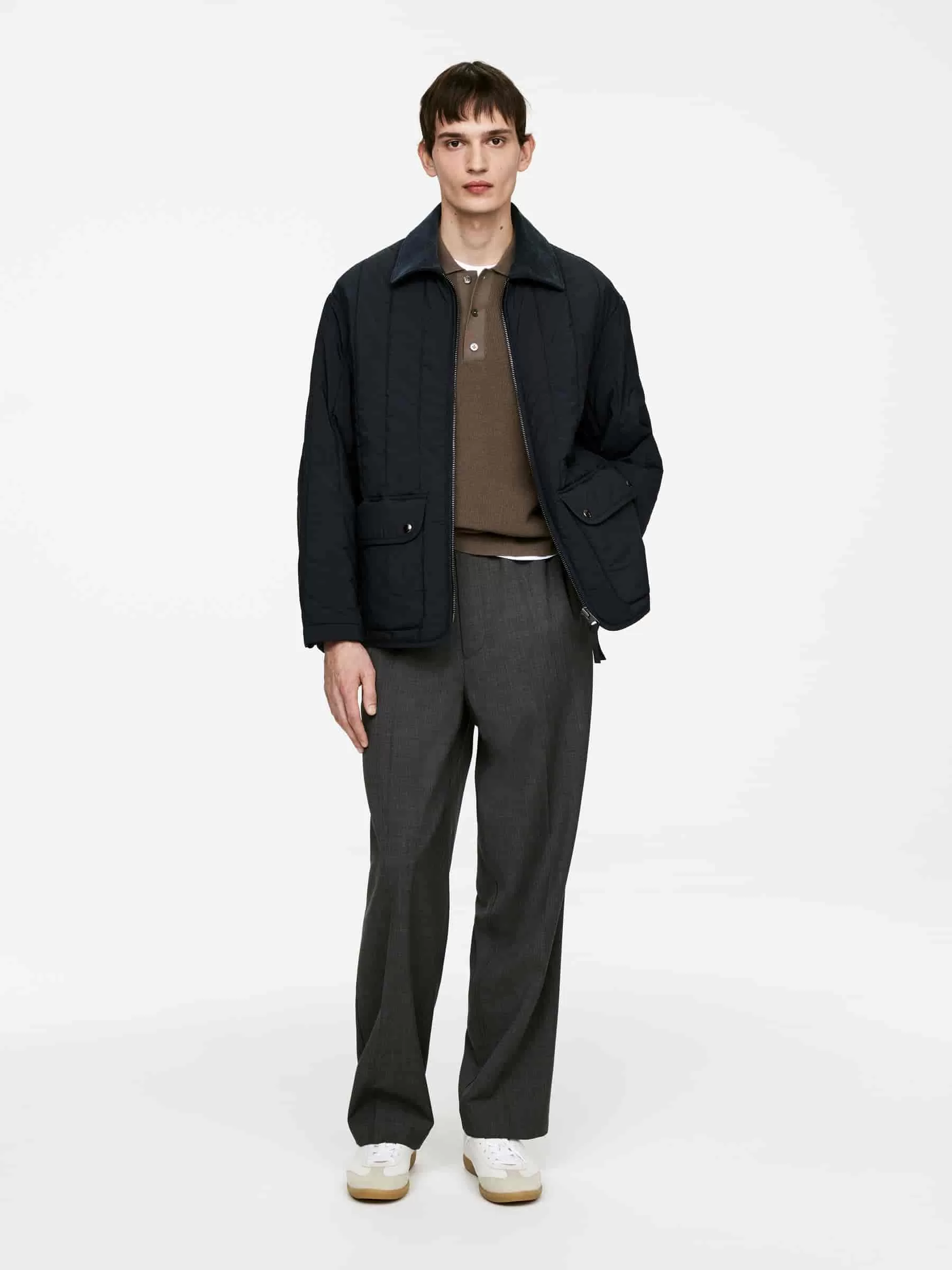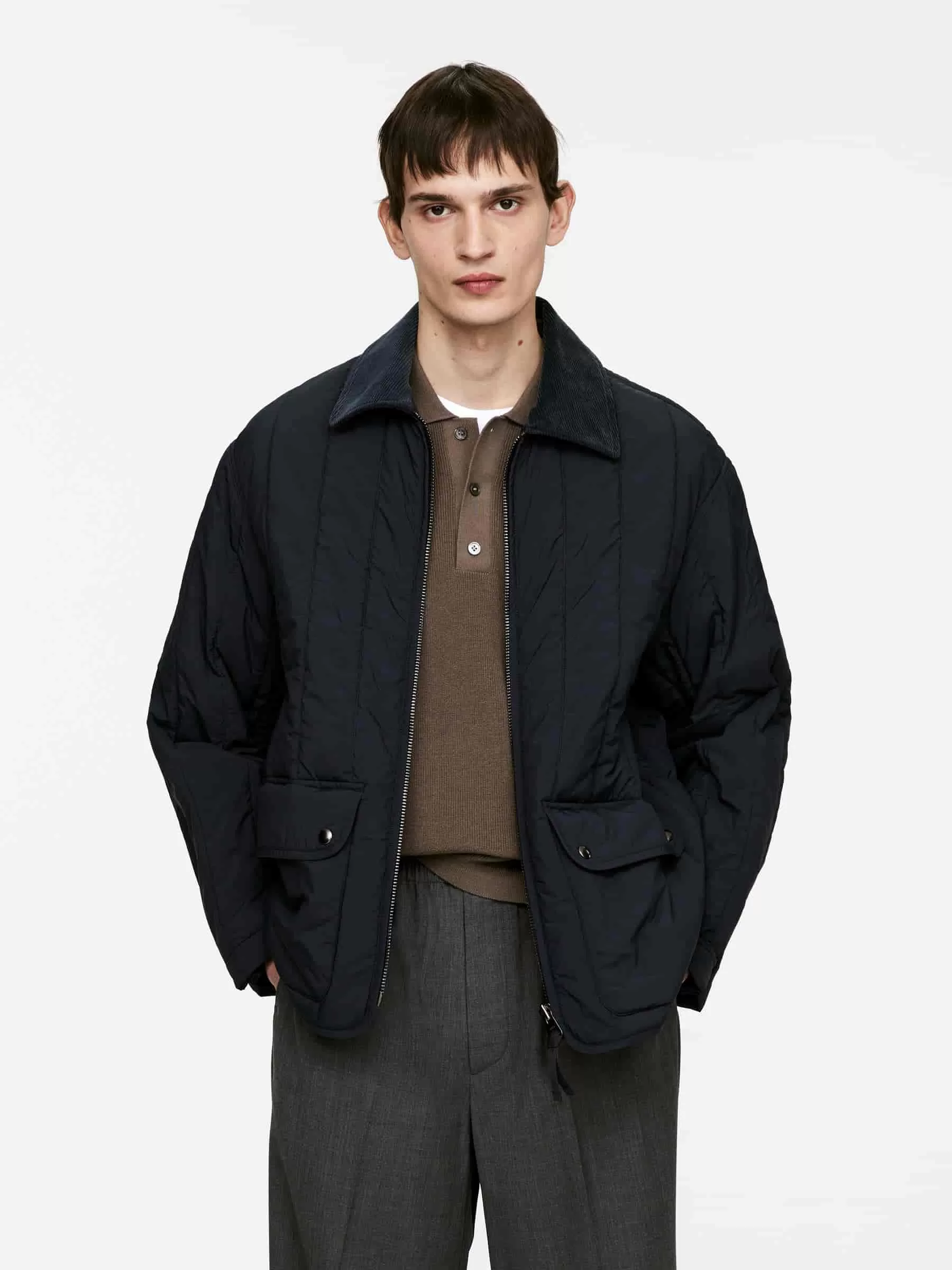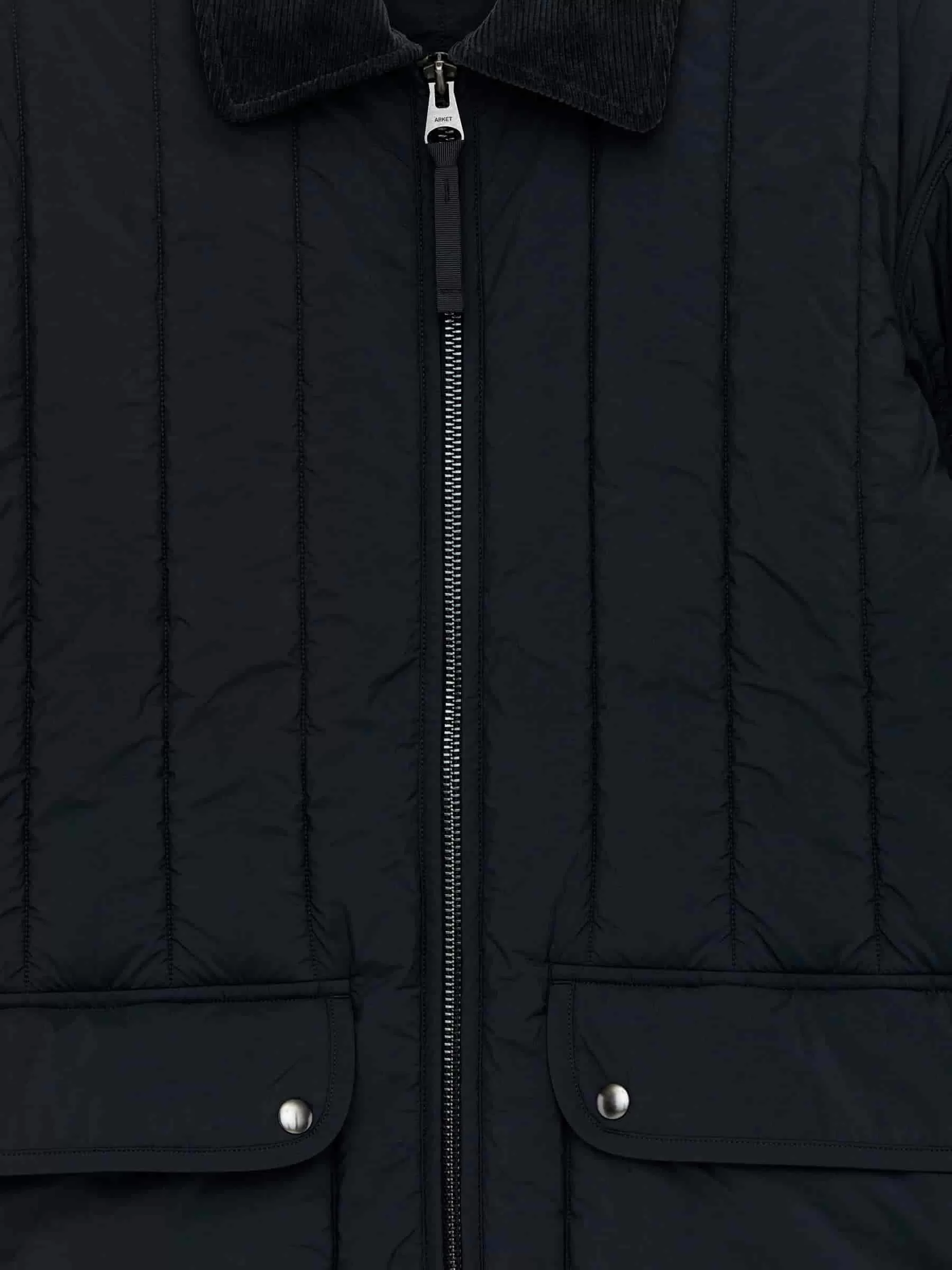 Chaqueta interior acolchada con cuello de pana. Un modelo corto con cierre de cremallera y bolsillos de parche con solapa. Ajuste regular.