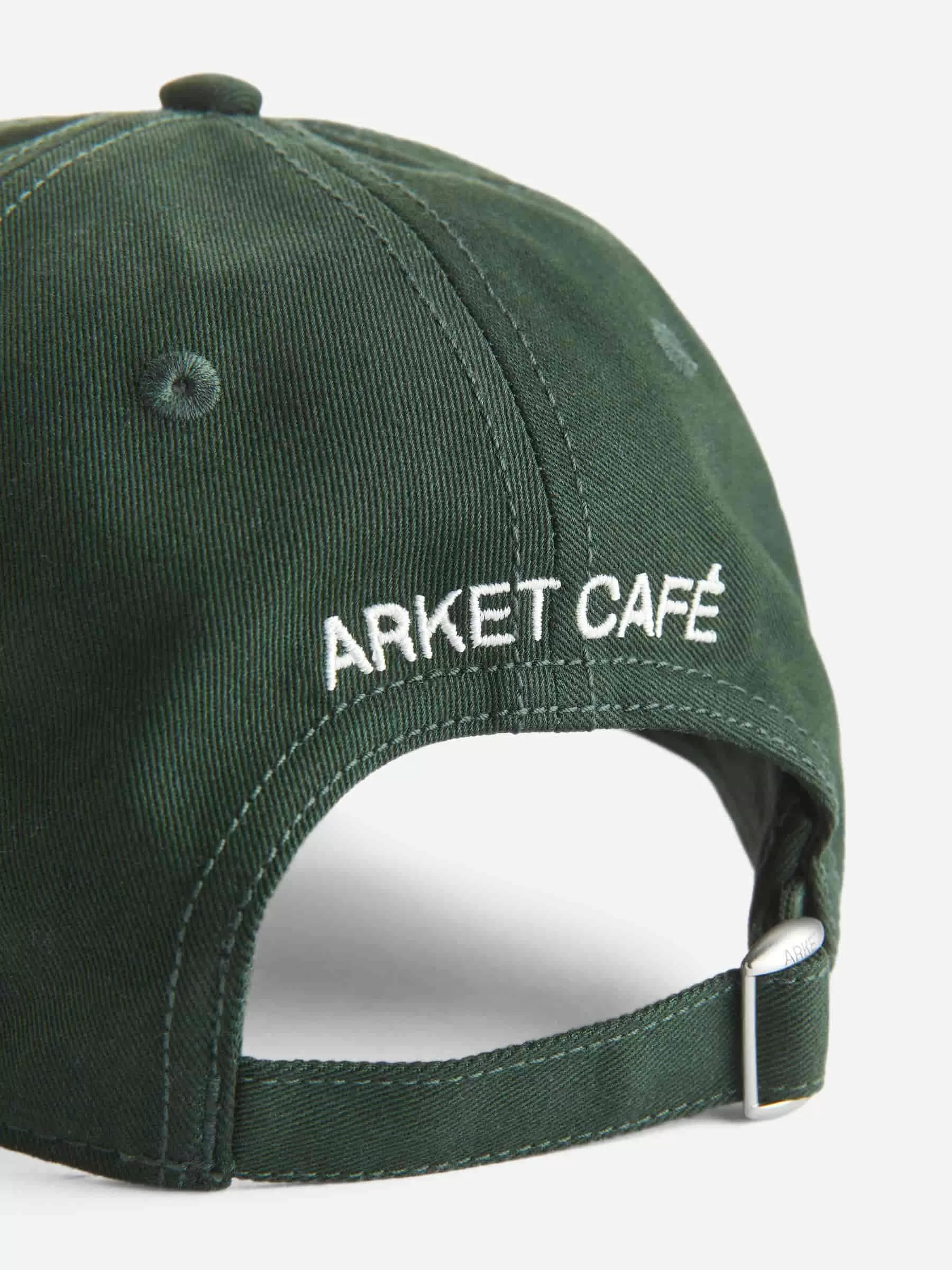 Gorra de algodón de seis paneles con bordado en la parte delantera y trasera. Tira con hebilla metálica en la parte trasera, para ajustar talla. Este producto forma parte de la colección ARKET CAFÉ con ilustraciones de Olga Prader.