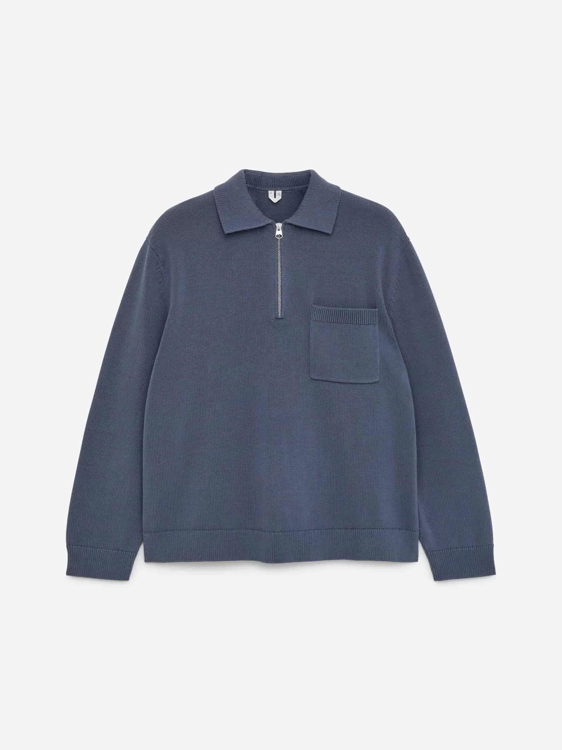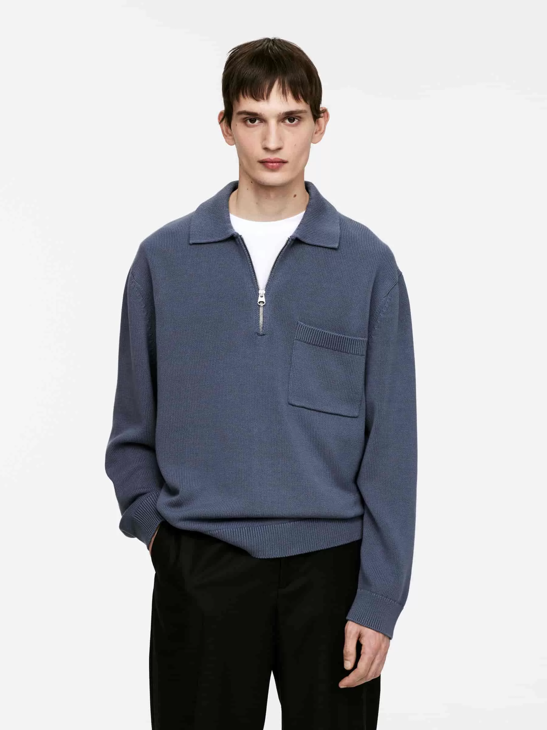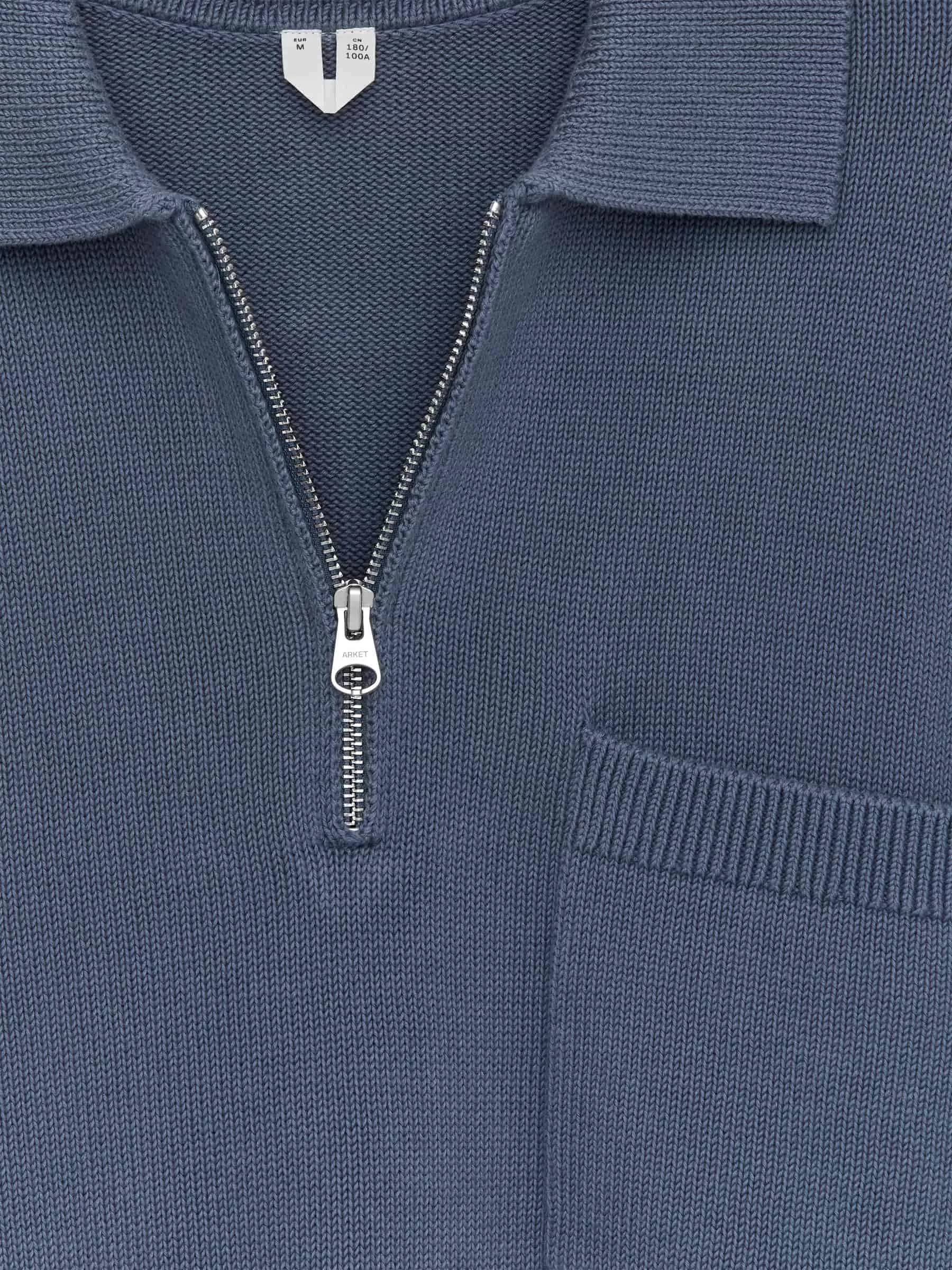 Jersey de punto plano de algodón con media cremallera. Cuello de punto acanalado y un único bolsillo en el pecho. Pasamanería de canalé.