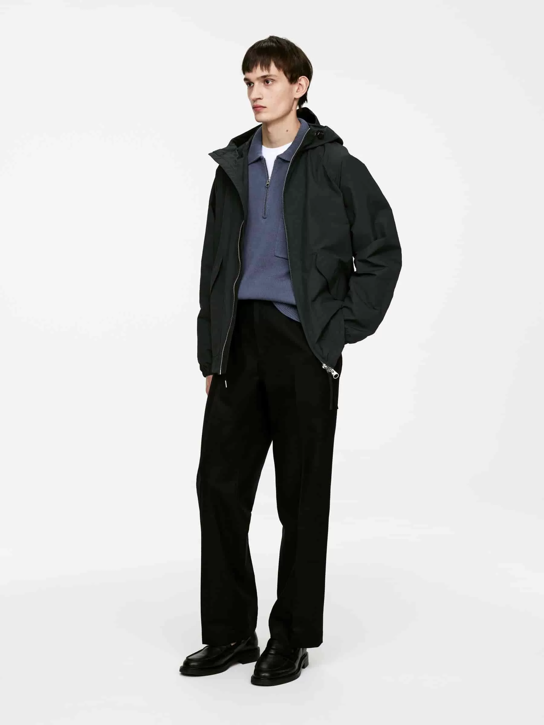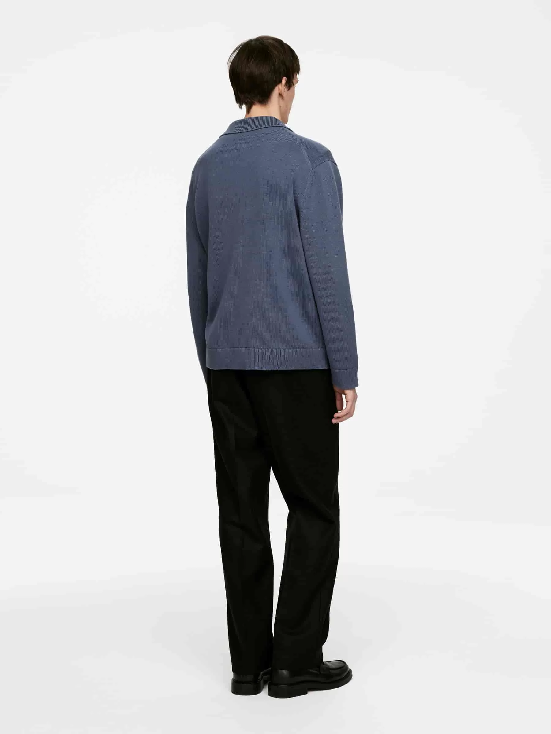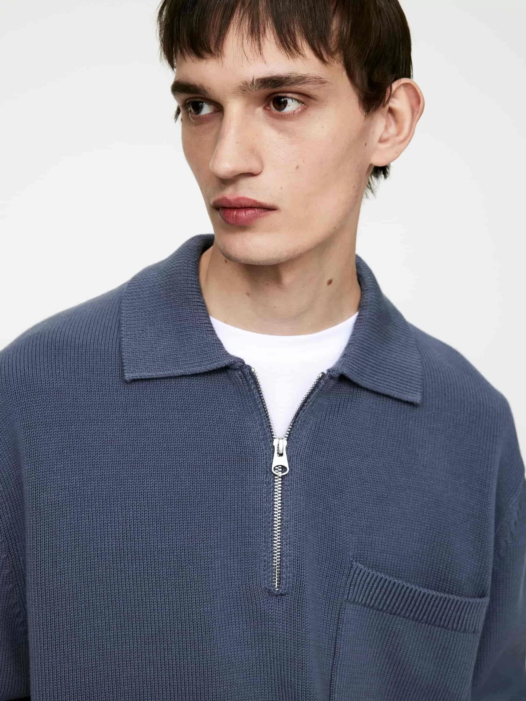 Jersey de punto plano de algodón con media cremallera. Cuello de punto acanalado y un único bolsillo en el pecho. Pasamanería de canalé.