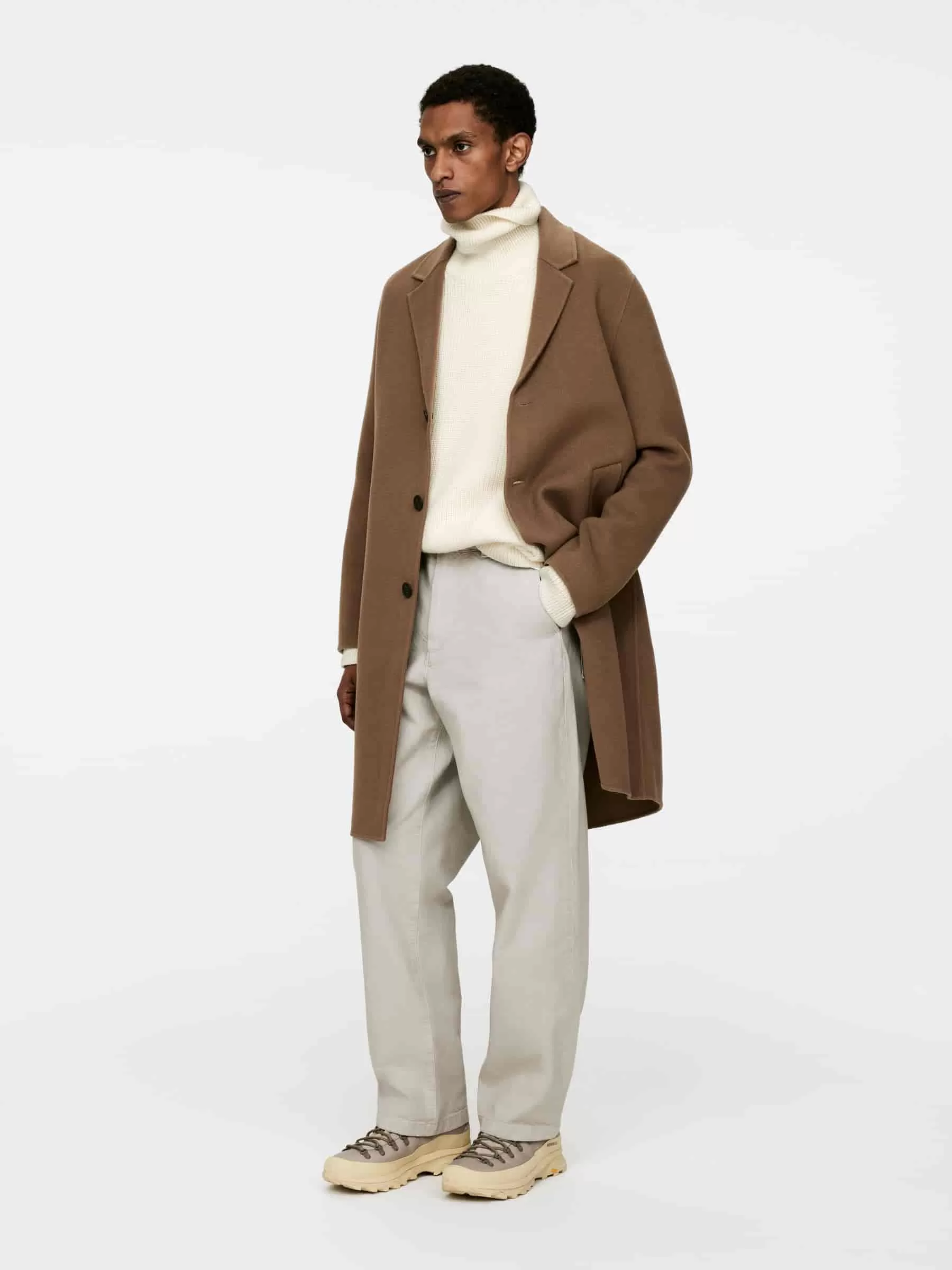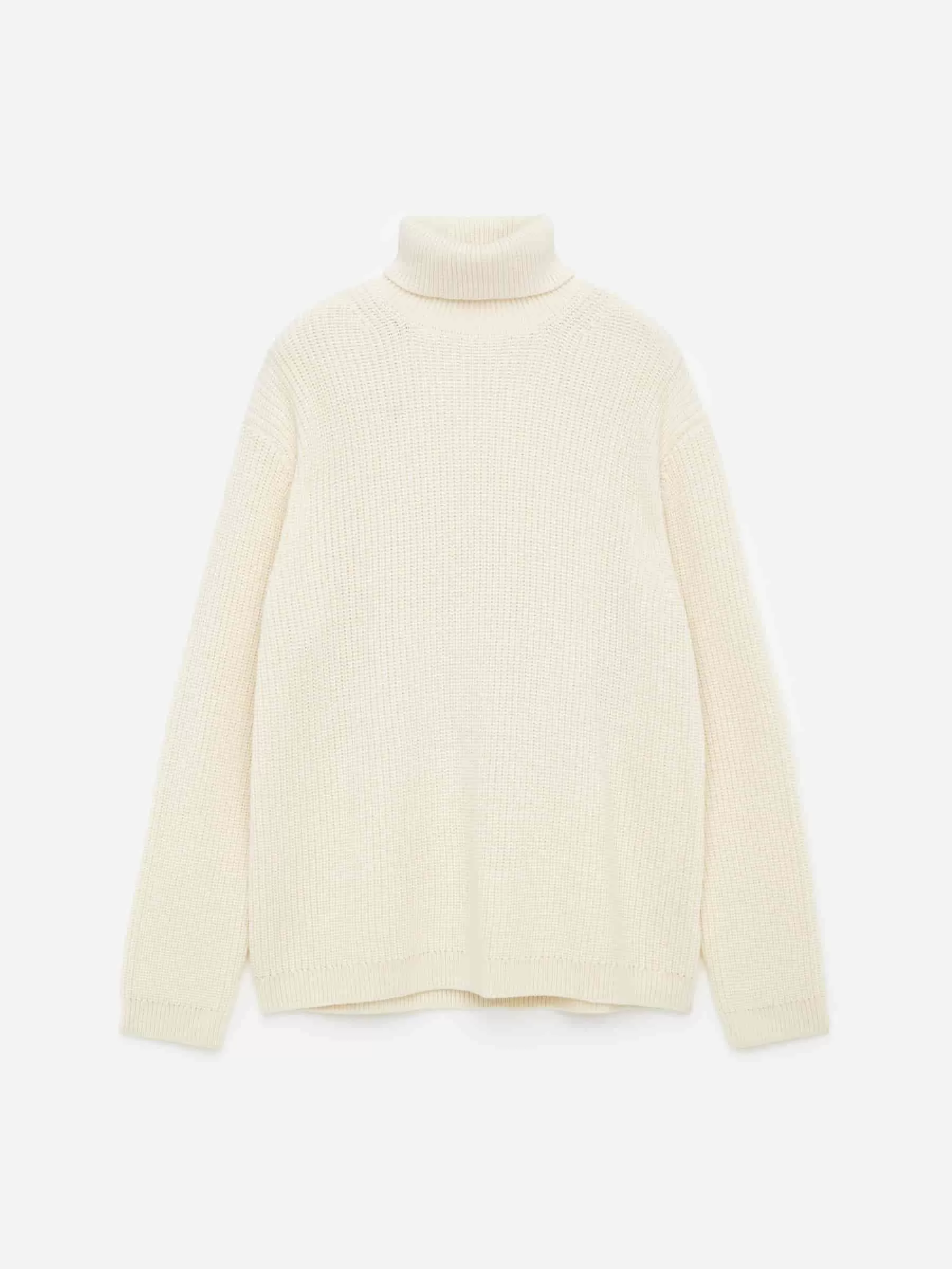 Jersey de cuello vuelto confeccionado en mezcla de lana. Se trata de un tejido pesado de primera calidad con un corte relajado y hombros caídos. Este jersey contiene un 69 % de lana RWS, certificada por el sindicato de control 815571. Los productos certificados según el Estándar de lana responsable (RWS) contienen fibra de lana de granjas certificadas de forma independiente según los requisitos de bienestar animal y gestión de la tierra.
