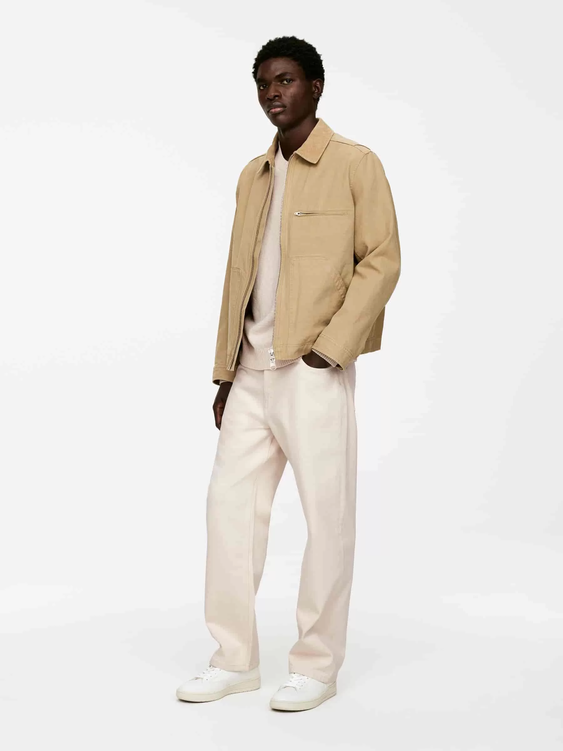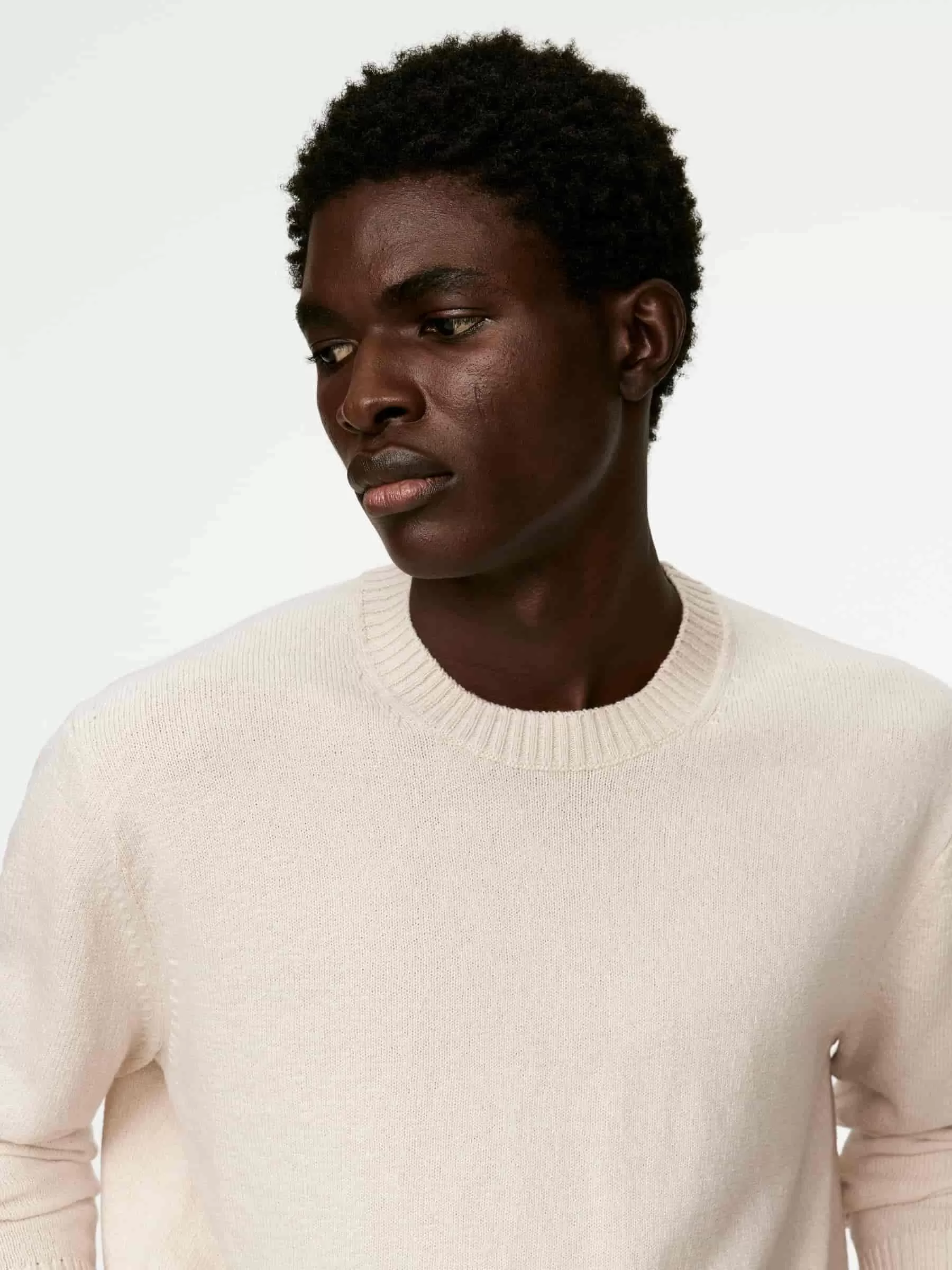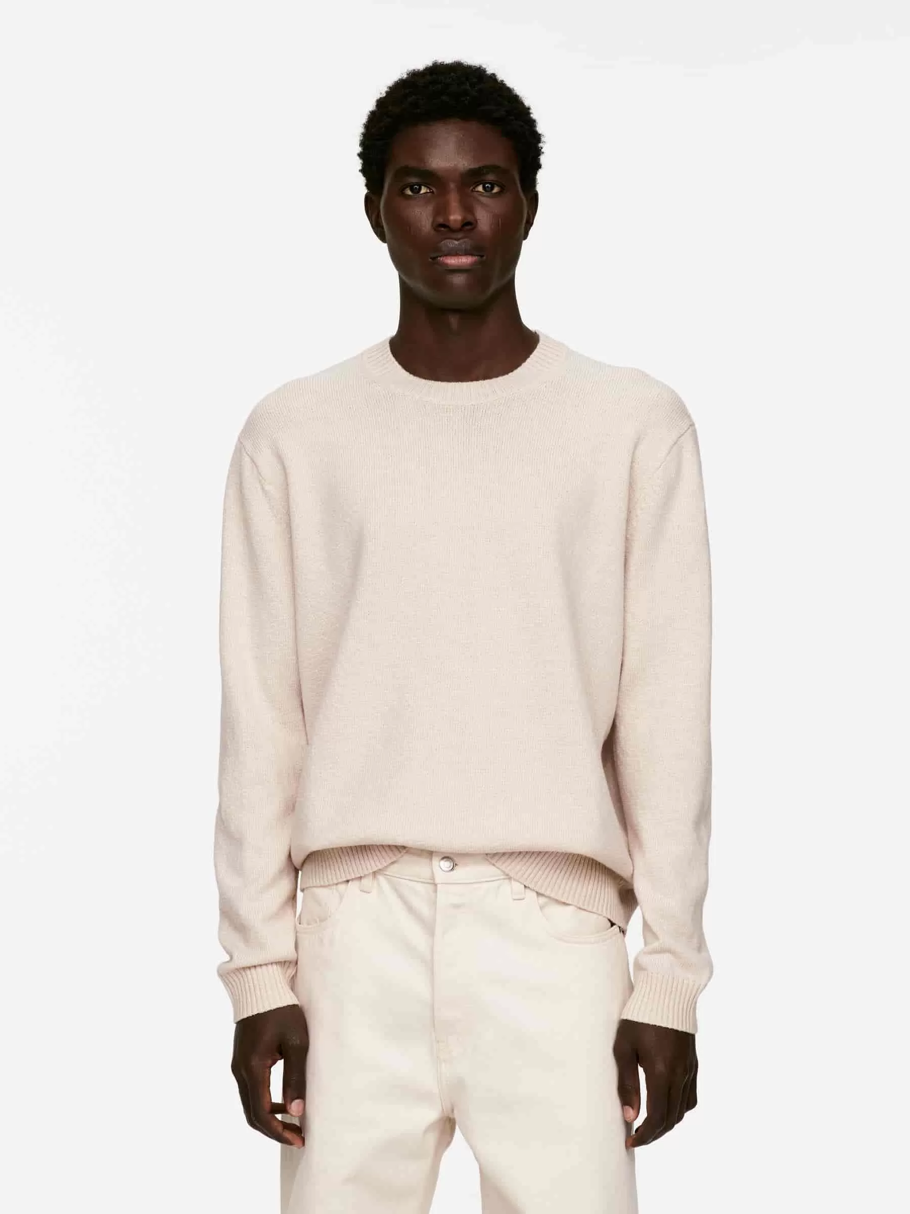 Jersey de cuello redondo confeccionado en punto liso con hilo de lana y algodón de textura ligeramente irregular. Ribetes acanalados. Ajuste regular. El modelo contiene 60 % lana RWS (TE-00047206). Los productos certificados según el Estándar de Lana Responsable (RWS) contienen fibra de lana procedente de granjas certificadas de forma independiente según los requisitos de bienestar animal y gestión de la tierra.