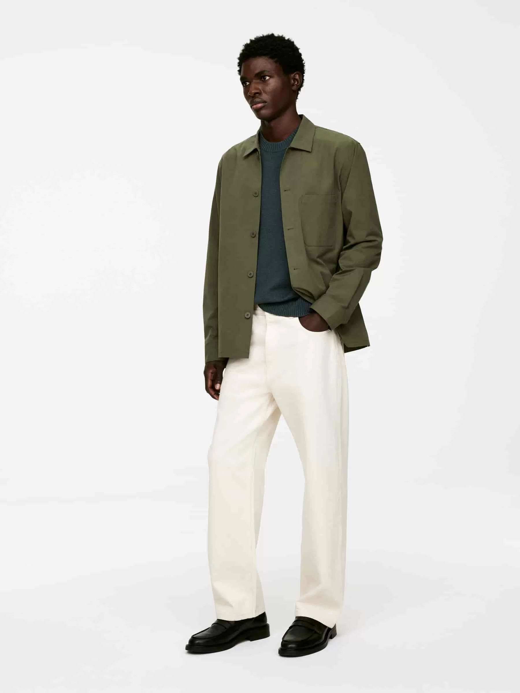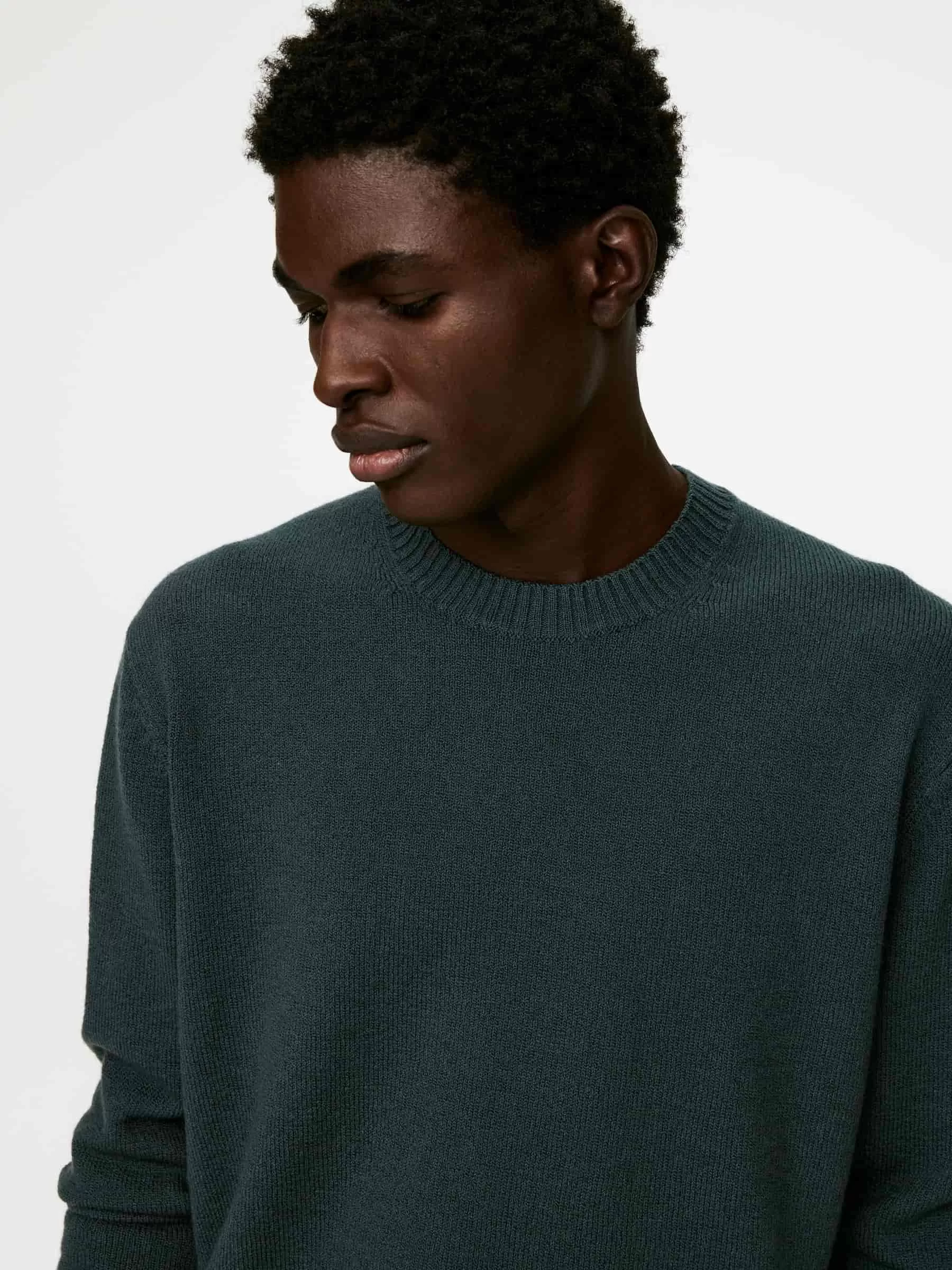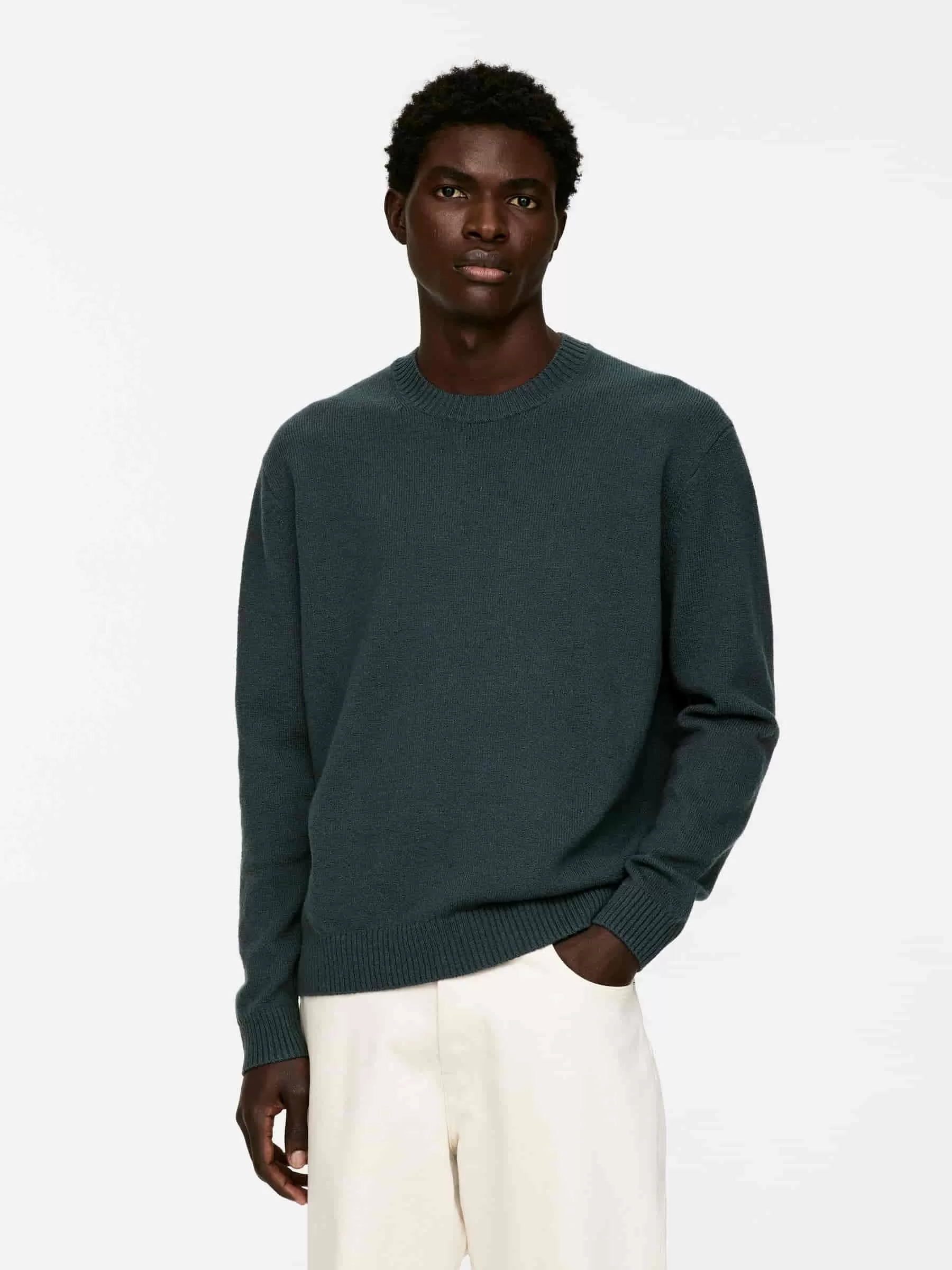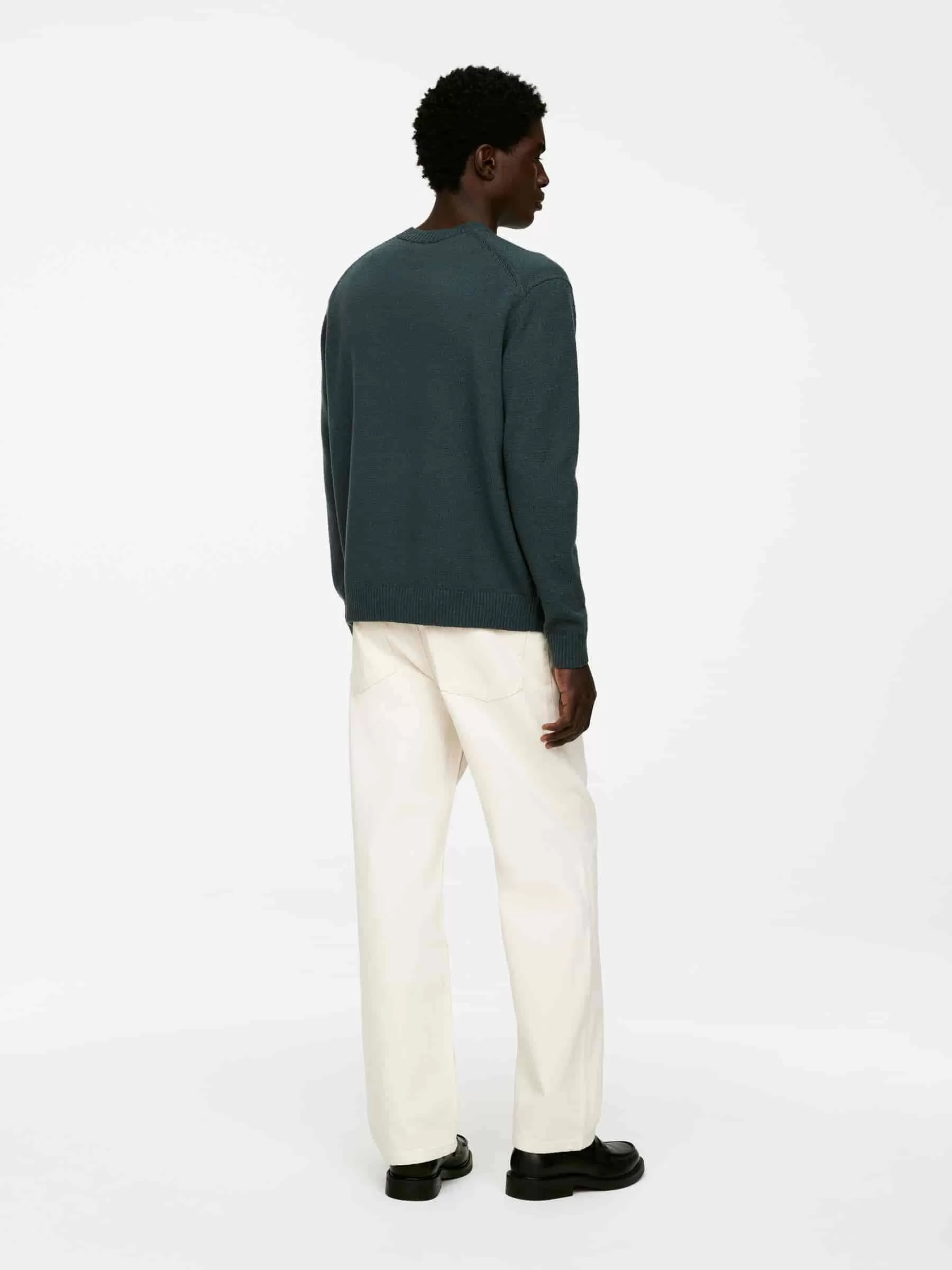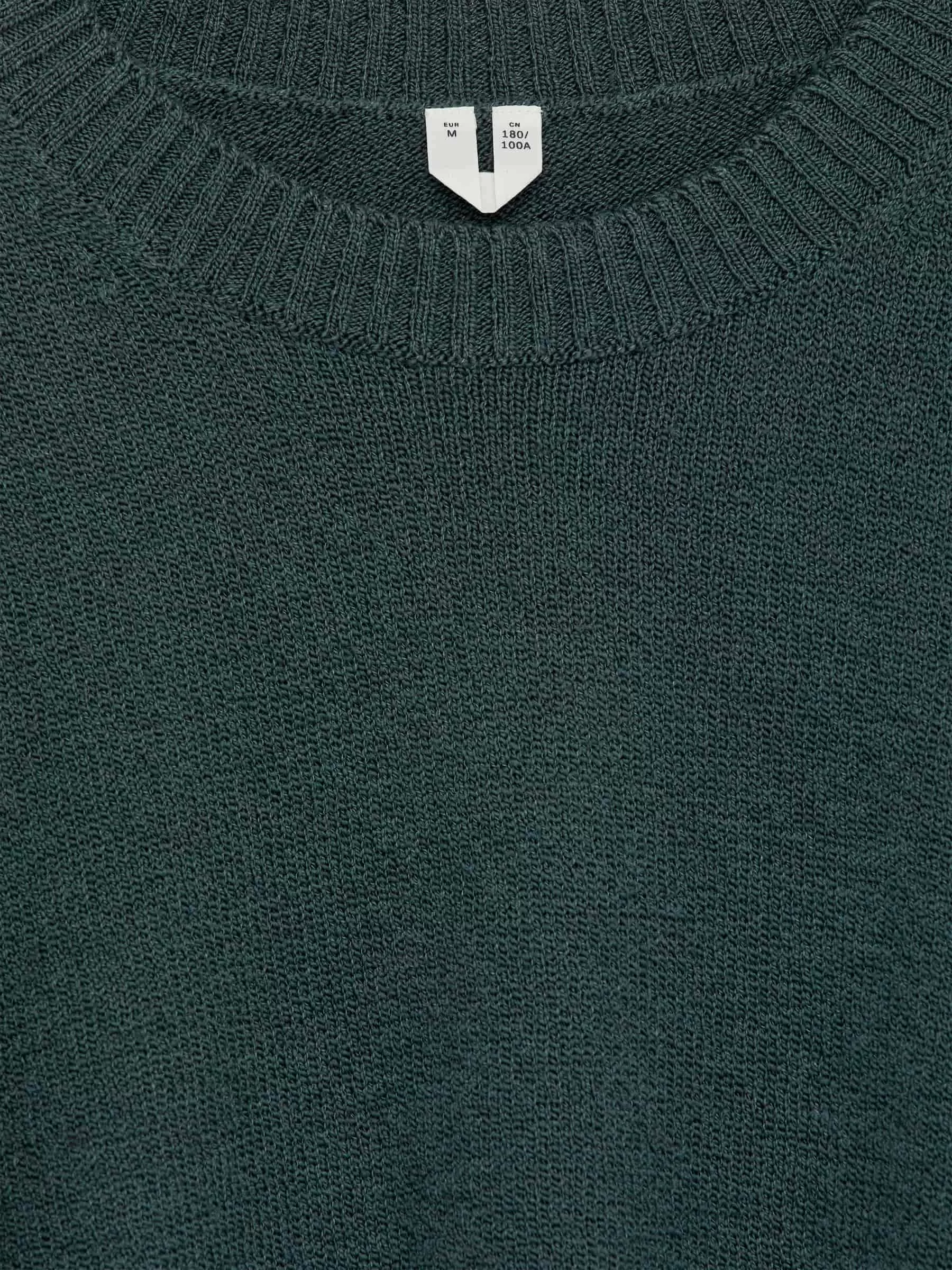 Jersey de cuello redondo confeccionado en punto liso con hilo de lana y algodón de textura ligeramente irregular. Ribetes acanalados. Ajuste regular. El modelo contiene 60 % lana RWS (TE-00047206). Los productos certificados según el Estándar de Lana Responsable (RWS) contienen fibra de lana procedente de granjas certificadas de forma independiente según los requisitos de bienestar animal y gestión de la tierra.