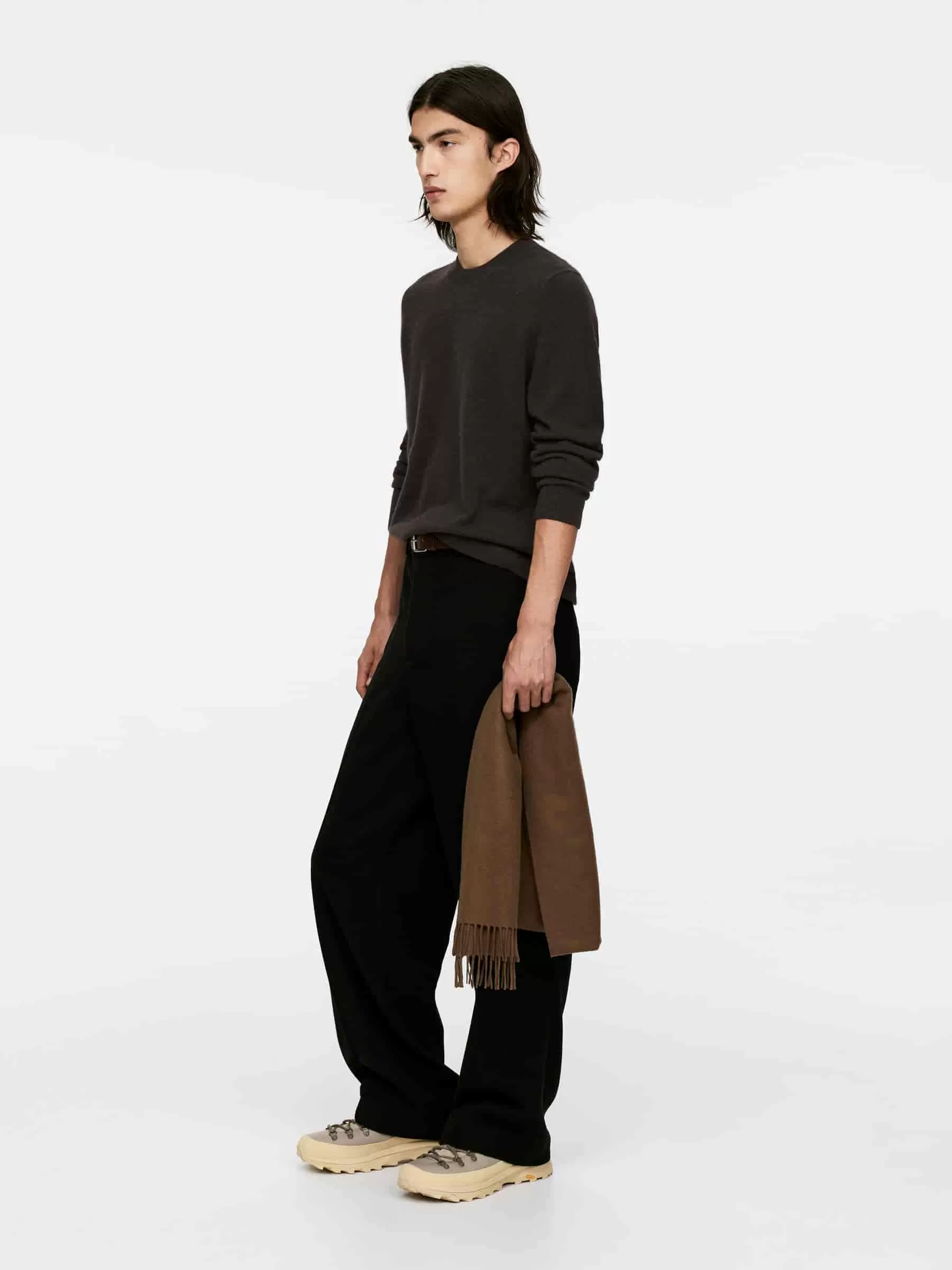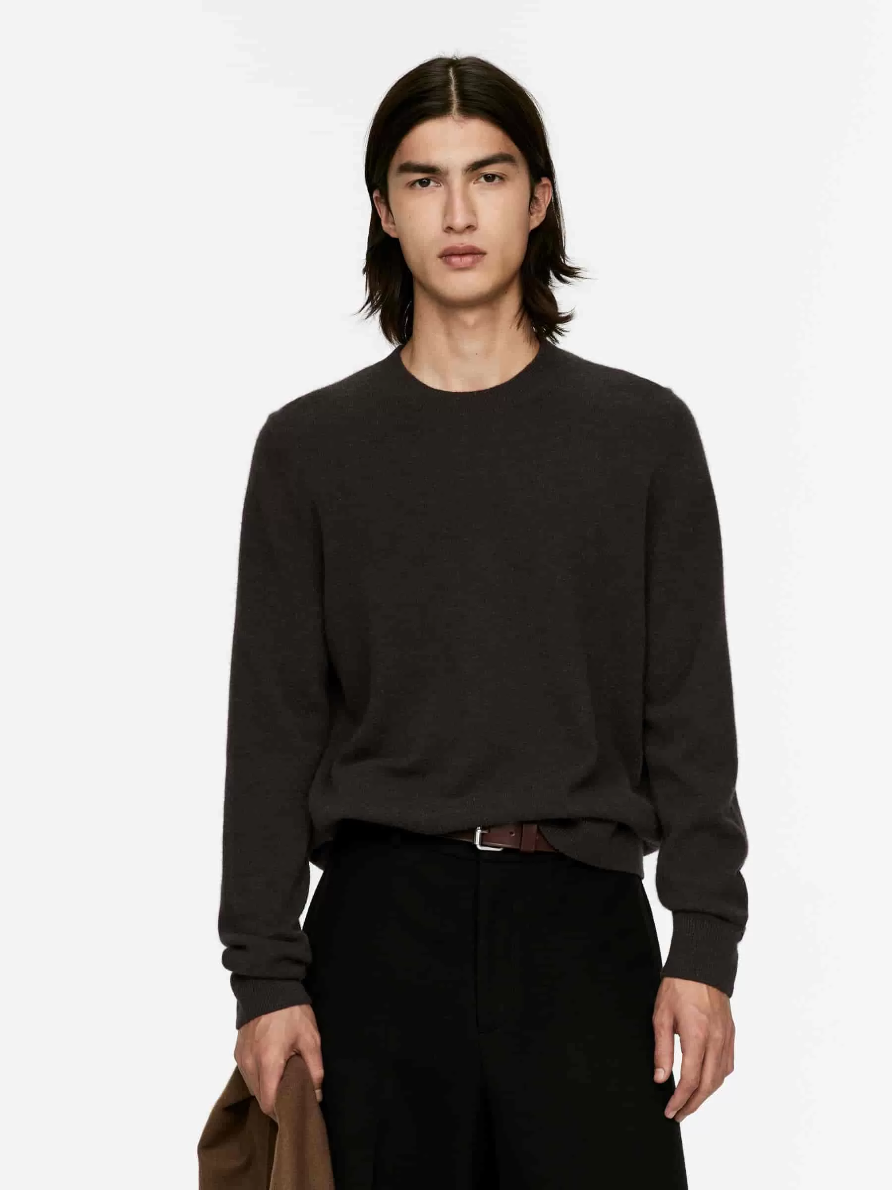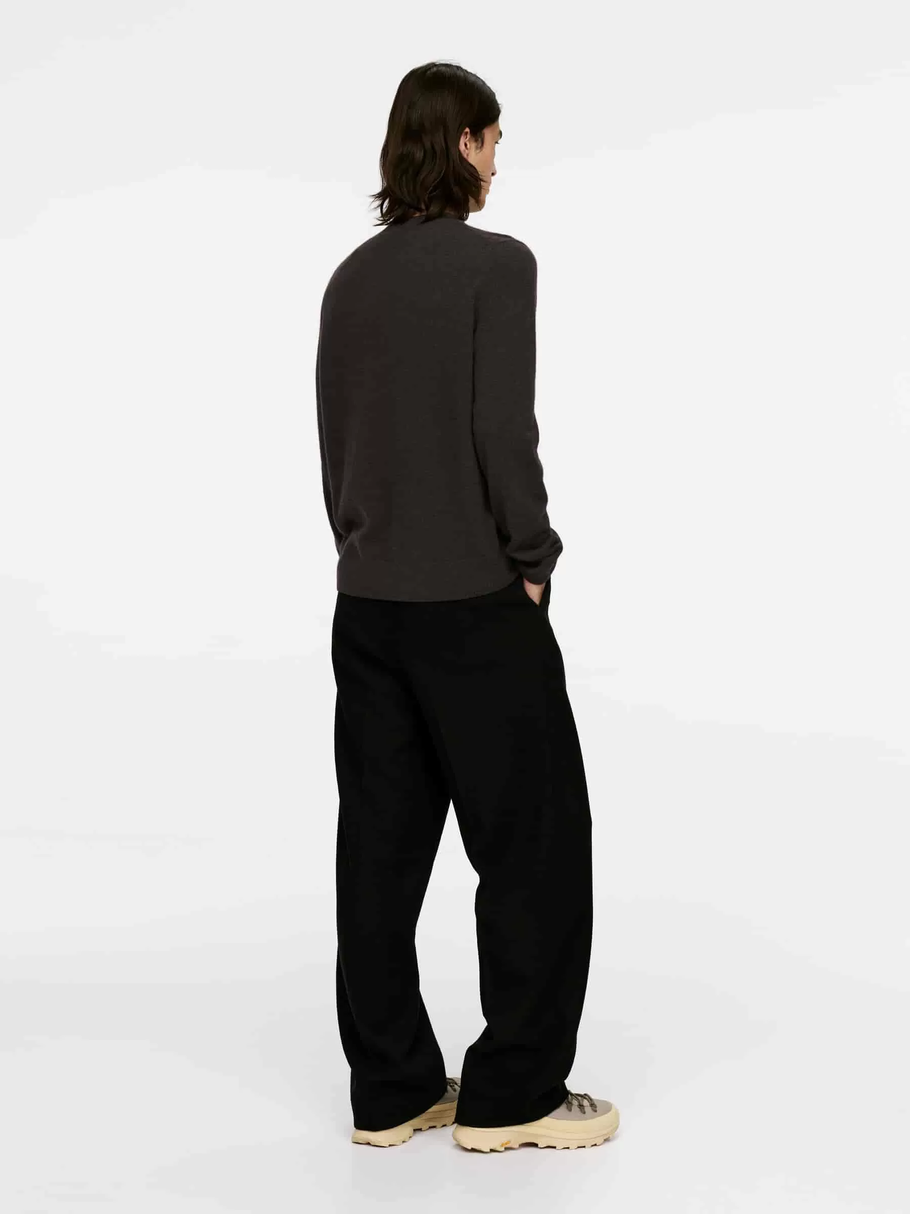 Jersey en punto fino confeccionado en una suave mezcla de cachemira y lana. Un modelo clásico de cuello redondo con corte estándar y ribetes de punto acanalado. Este estilo contiene un 25 % de lana RWS, certificada por el sindicato de control 815347. Los productos certificados según el Estándar de lana responsable (RWS) contienen fibra de lana de granjas certificadas de forma independiente según los requisitos de bienestar animal y gestión de la tierra.