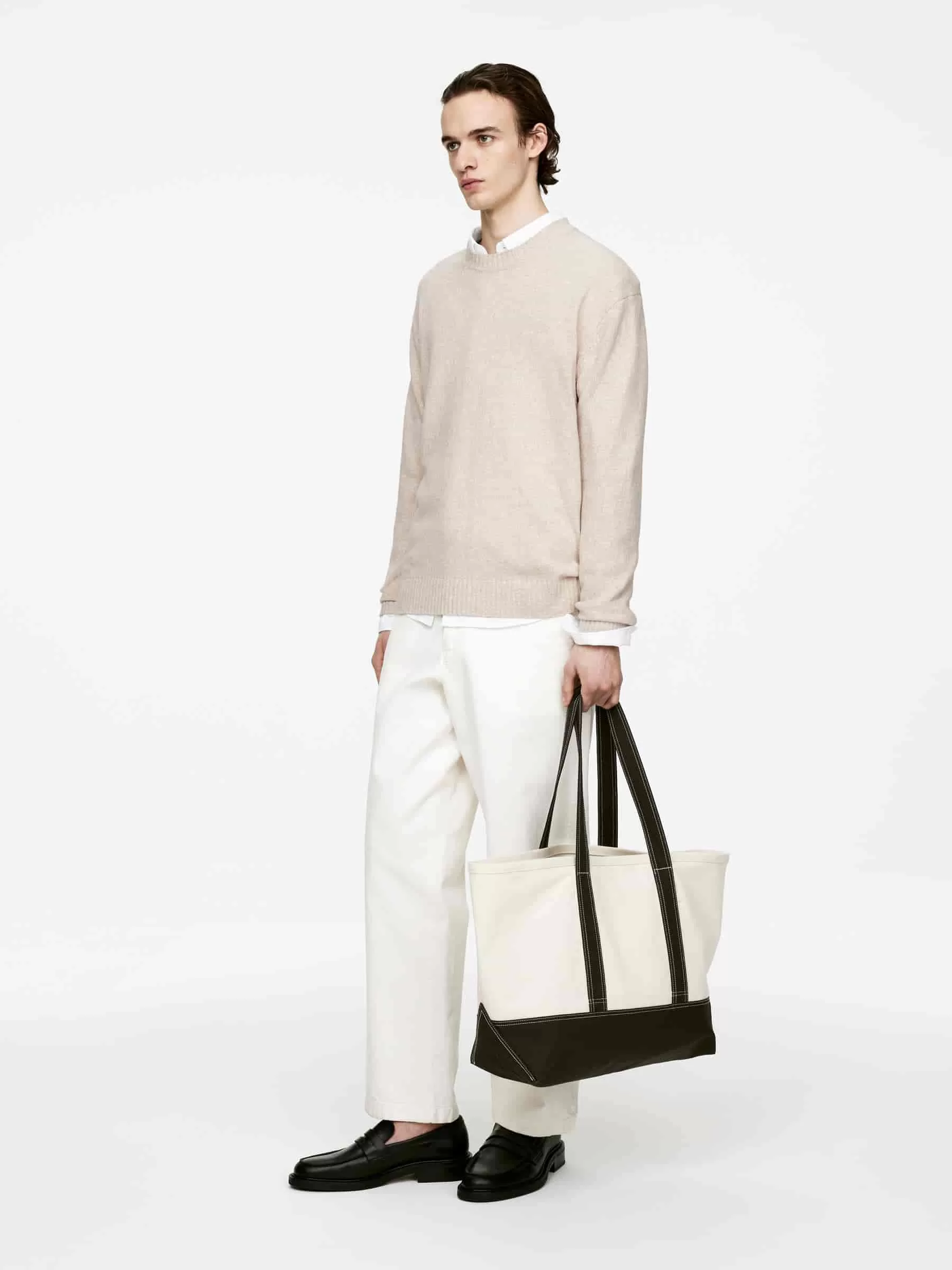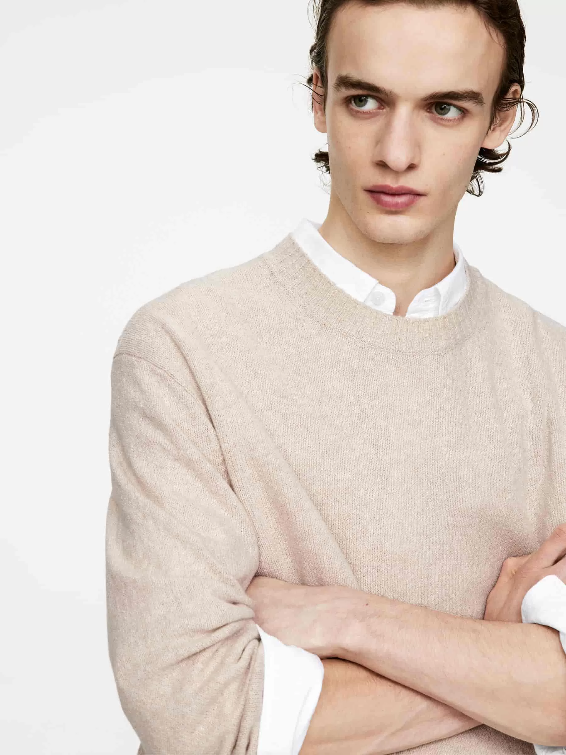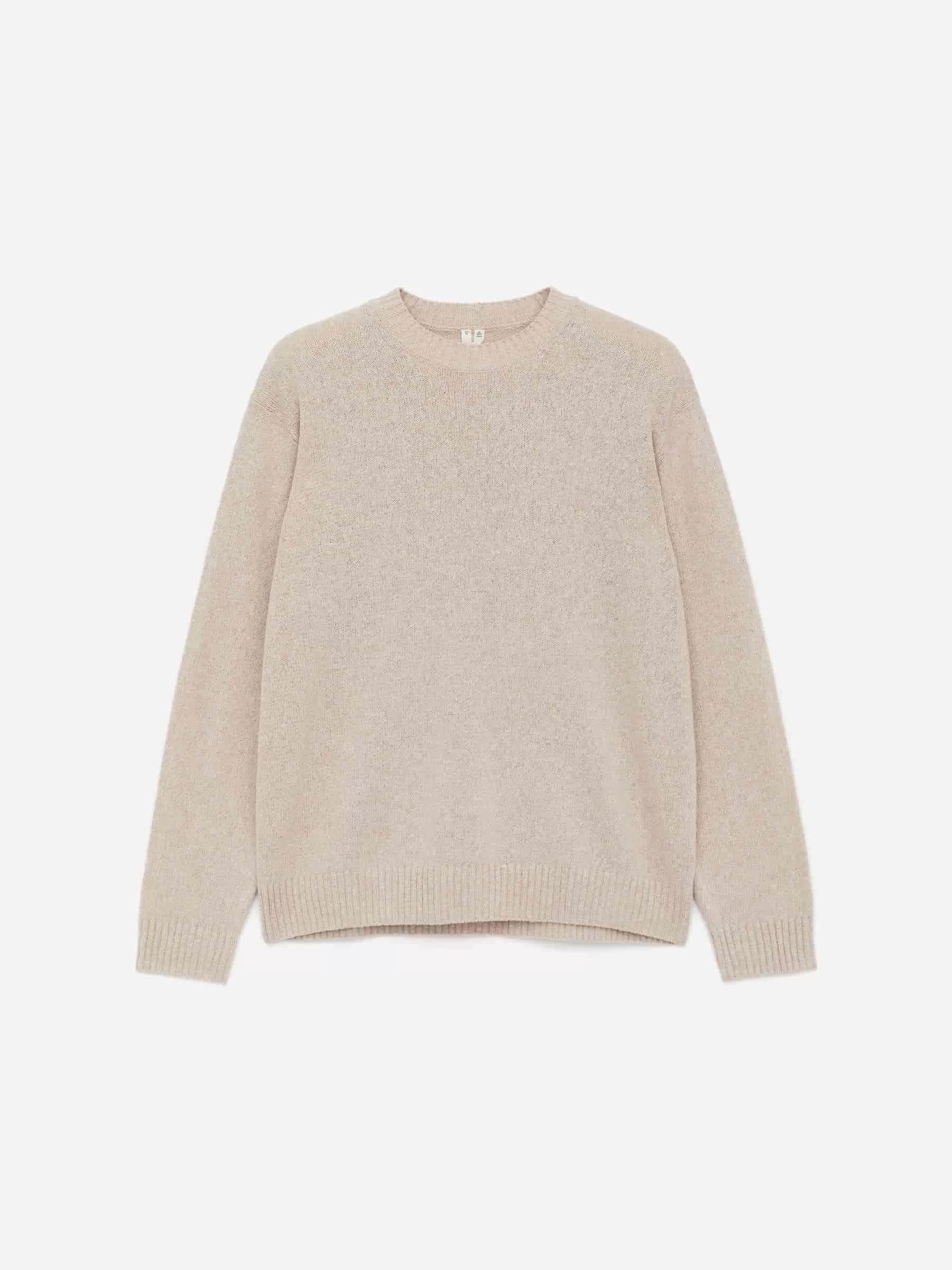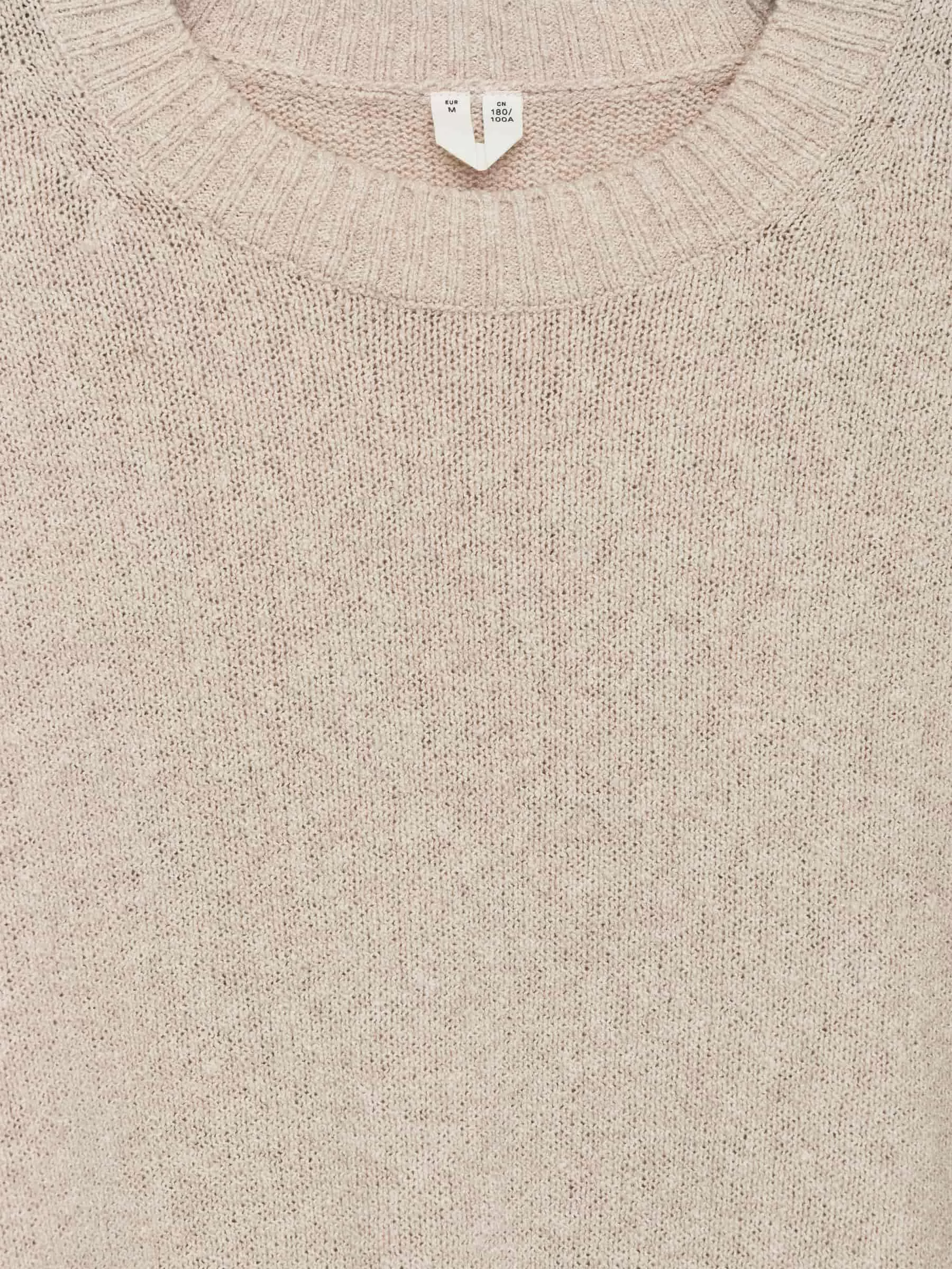 Jersey de cuello redondo con hombros ligeramente caídos y terminaciones de canalé en puños, cuello y bajo. Confeccionado con una lujosa mezcla de algodón, poliéster, lino y seda de morera.