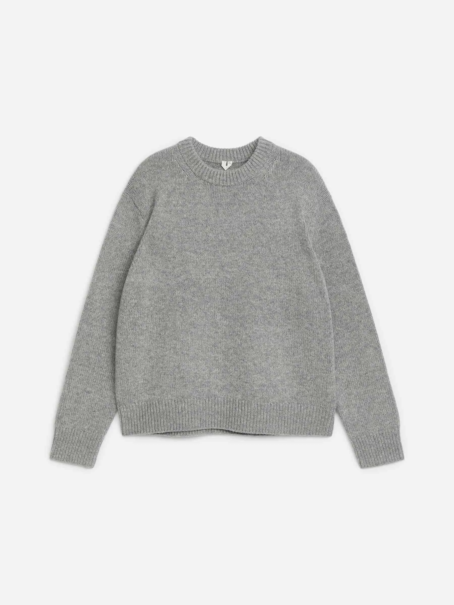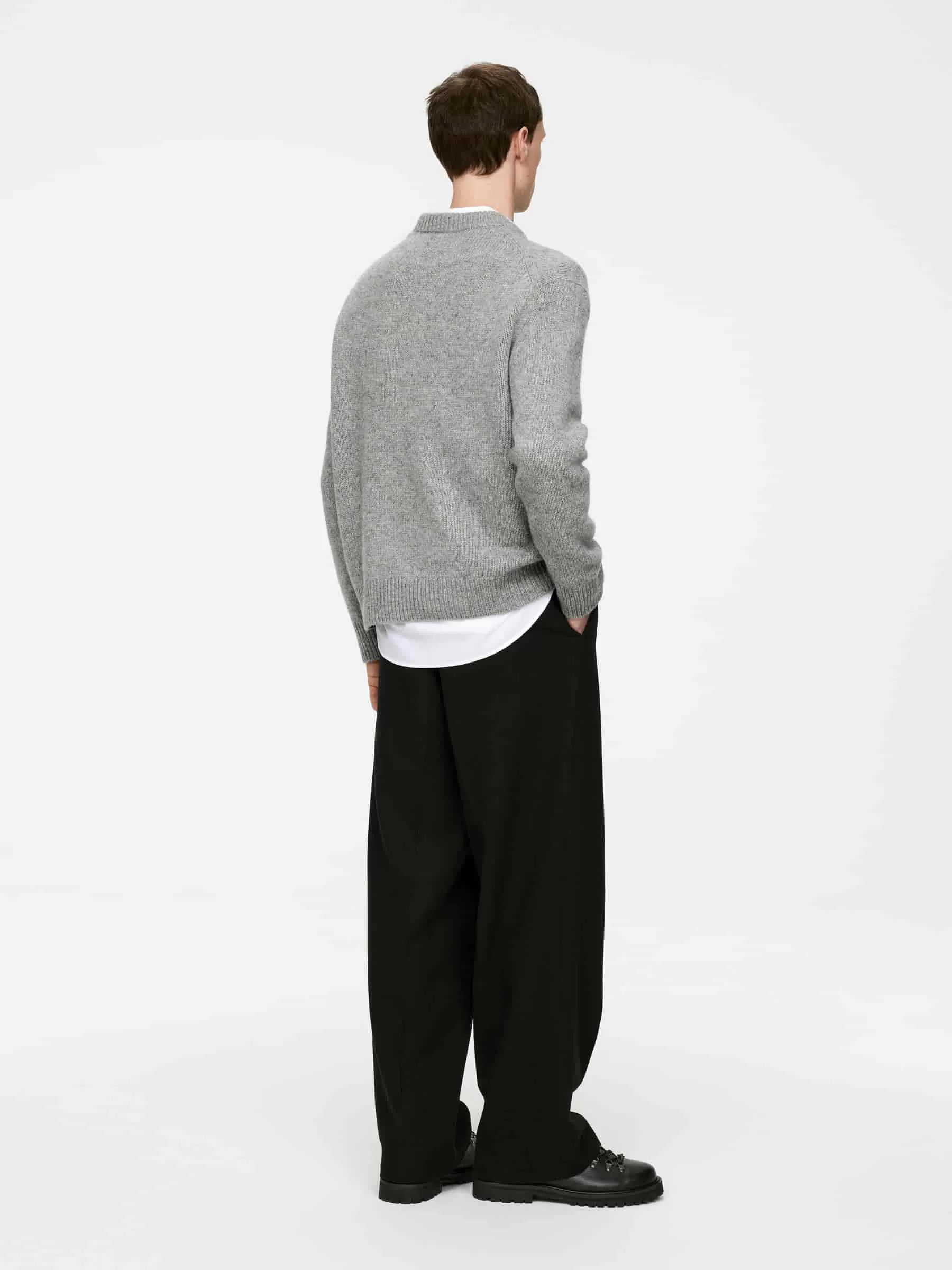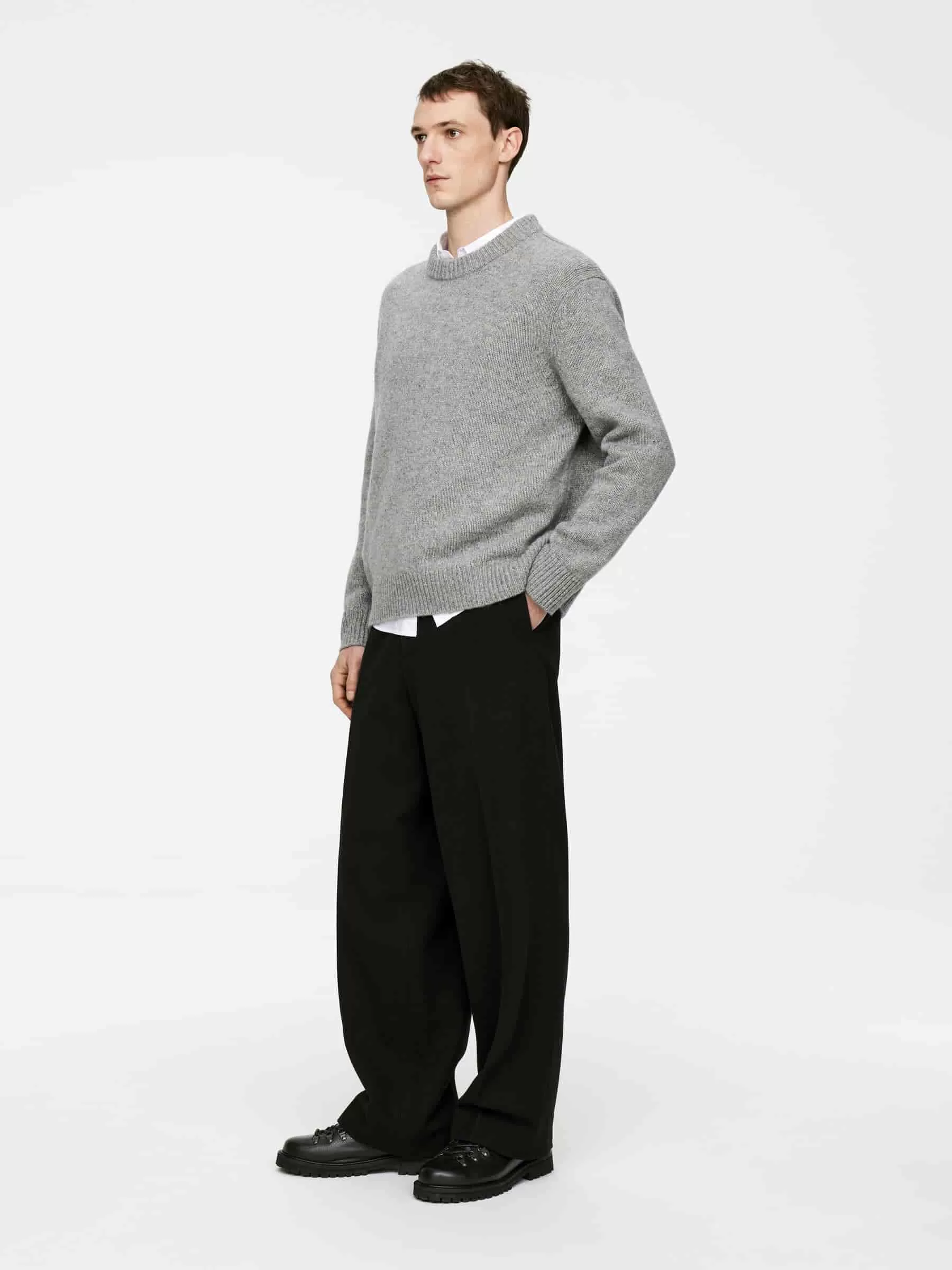 Jersey grueso tejido en punto liso y diseñado con un corte oversize y una silueta boxy. Confeccionado con lana suave y nailon añadido para una sensación de ligereza. Un modelo de cuello redondo con ribetes de punto acanalado.