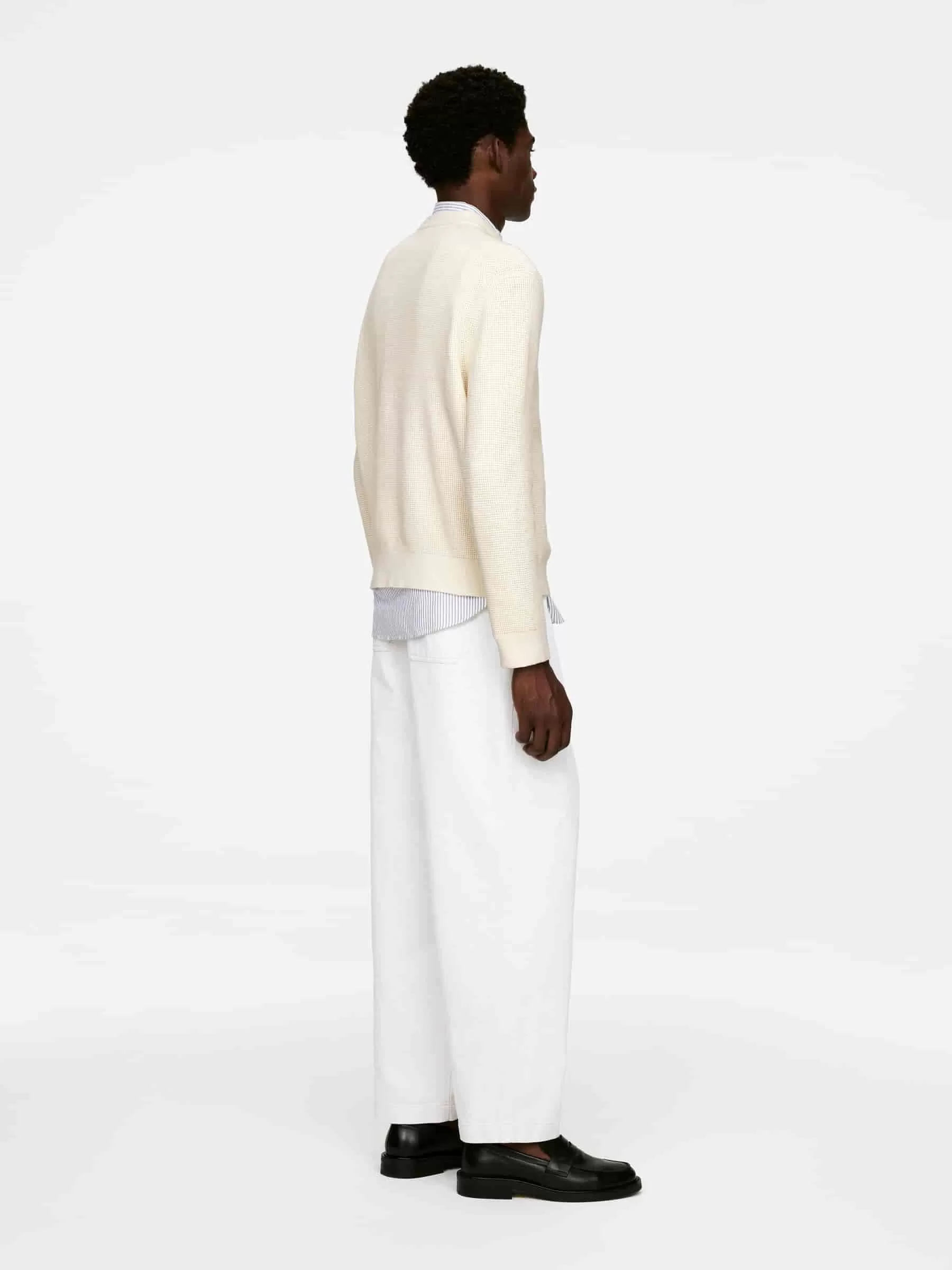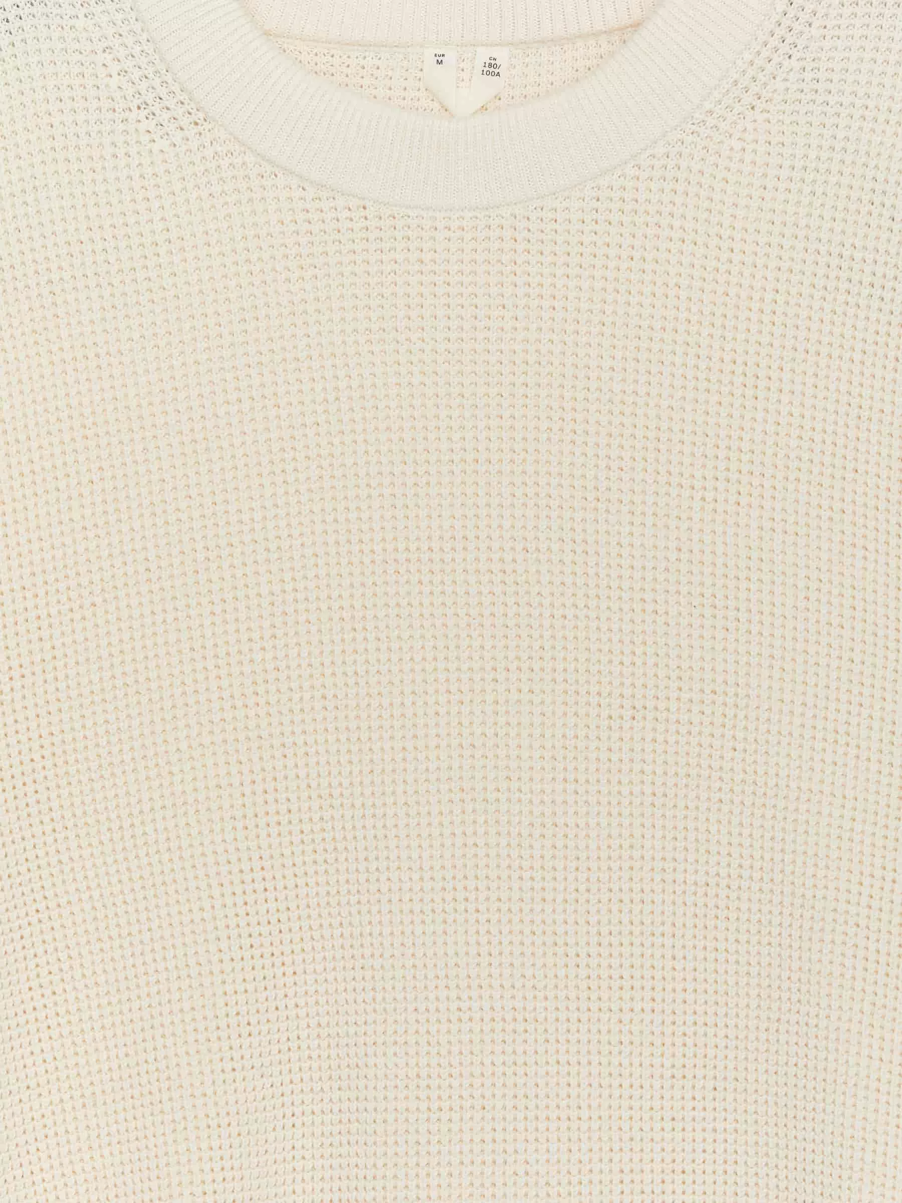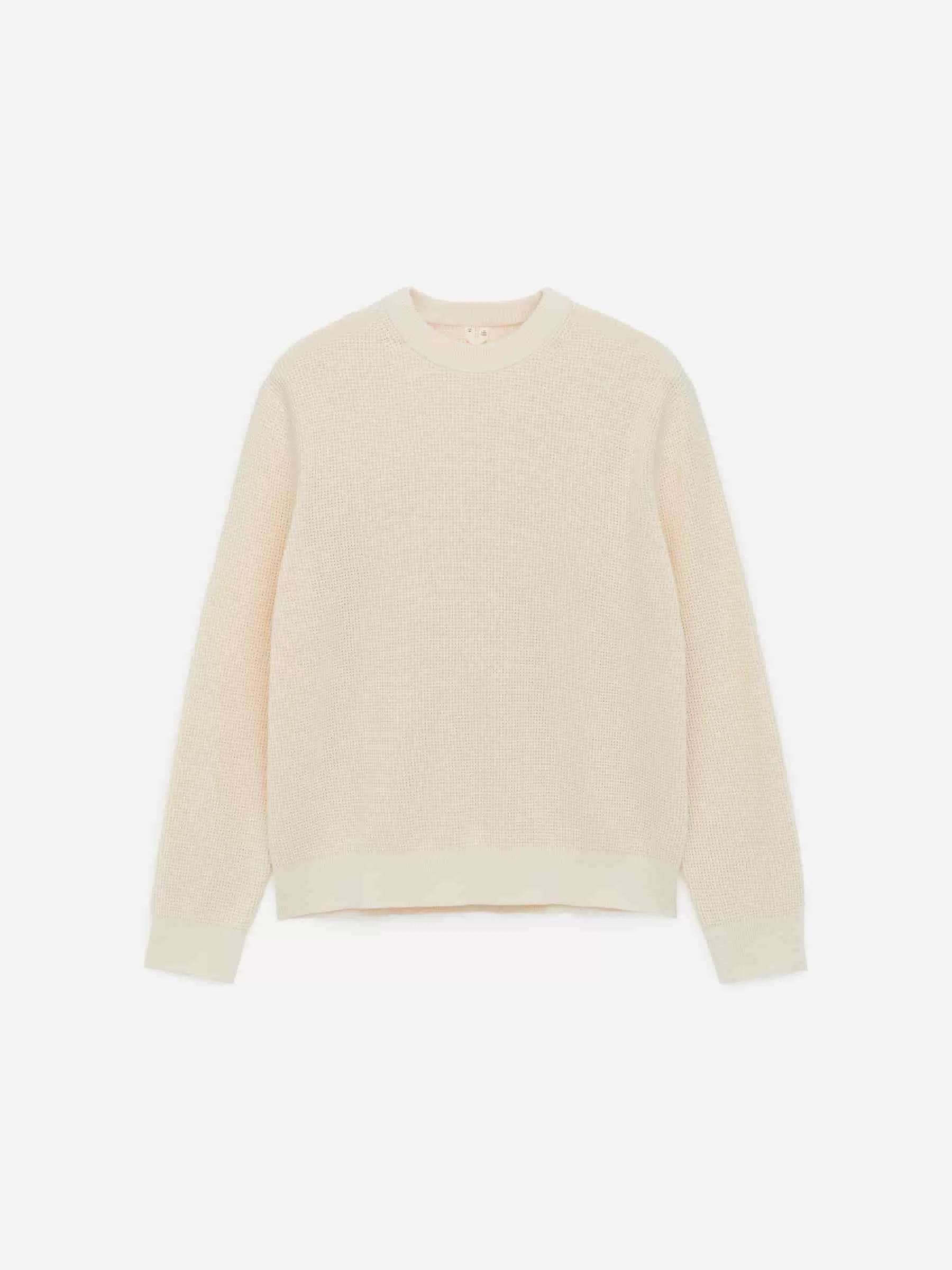Jersey confeccionado en mezcla de algodón y lino, tejido con textura gofre. Un modelo de cuello redondo con corte regular. Pasamanería de punto canalé.