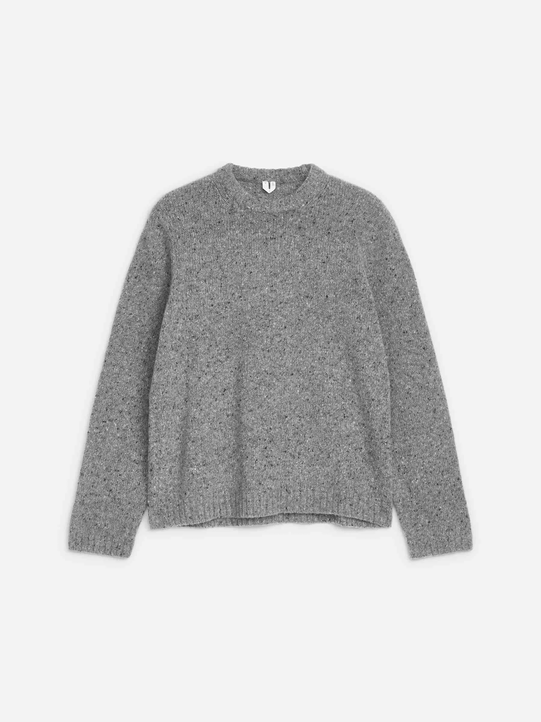 Jersey de corte recto confeccionado con hilo de lana y alpaca, lo que lo hace cálido y suave al tacto. La textura de neps y los adornos acanalados añaden un acabado táctil.