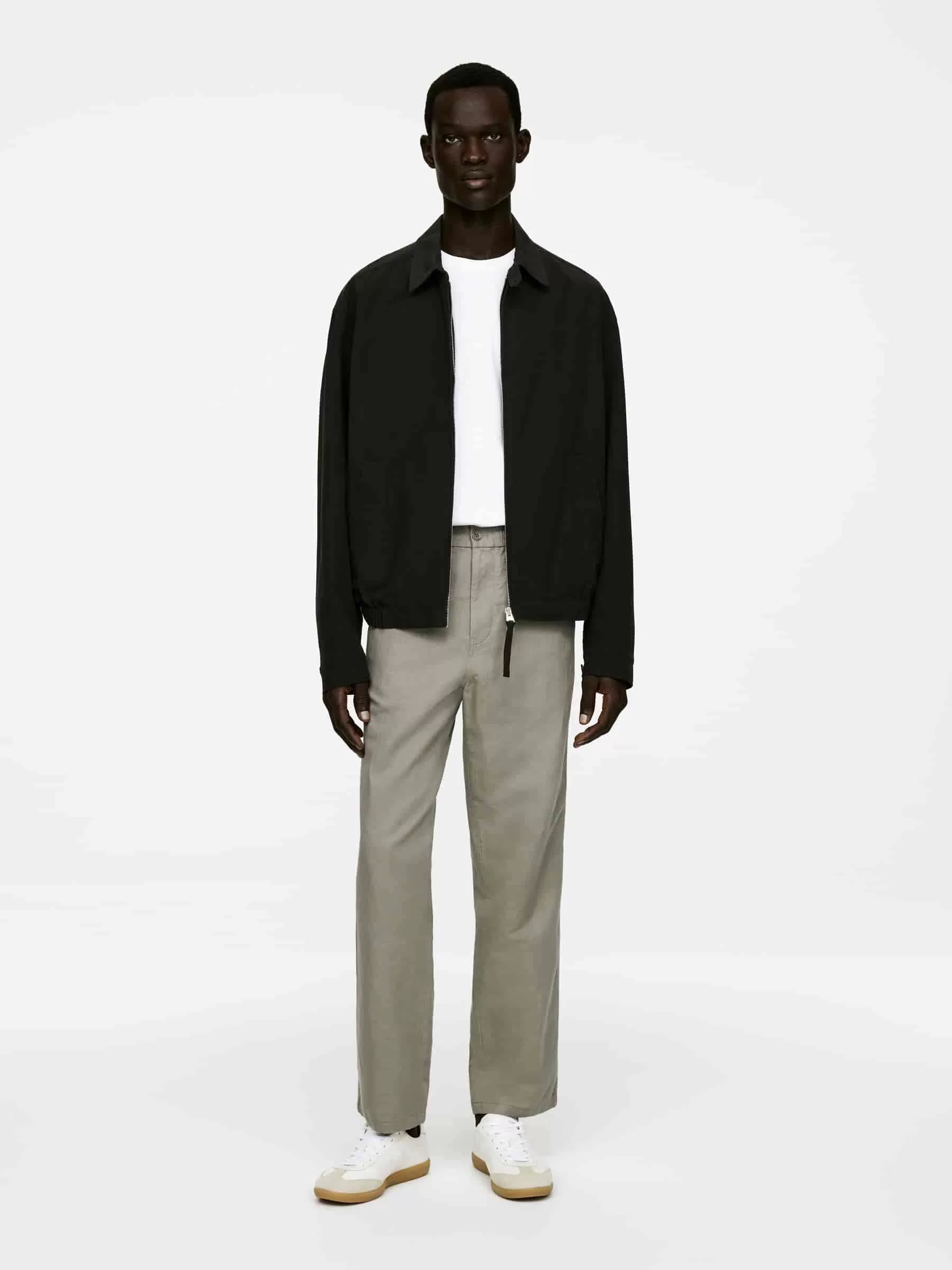 Pantalón confeccionado en mezcla de lino. Detallado con cinturilla elástica con cordón en el interior, cierre de botón y bragueta con cremallera. Bolsillos franceses en la parte delantera y bolsillos de ribete en la parte trasera. Ajuste regular.