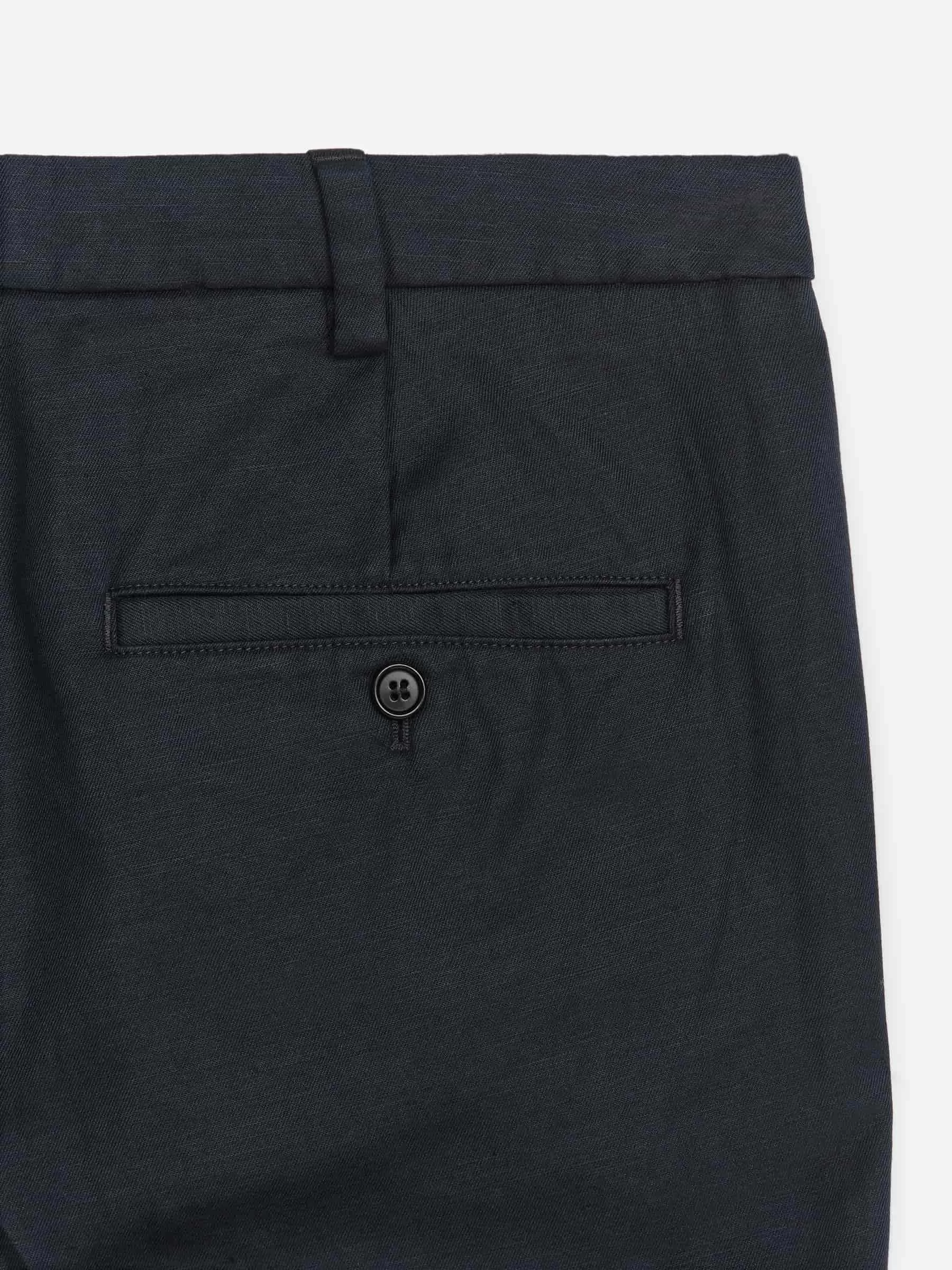 Pantalón de sarga confeccionado en una mezcla de lino y algodón. Un estilo cropped con corte regular, detallado con bolsillos laterales inclinados y bolsillos ribeteados con botones en la parte trasera. El bolsillo derecho alberga un bolsillo oculto para monedas. Trabillas para cinturón y bragueta con cremallera. Pliegues prensados.
