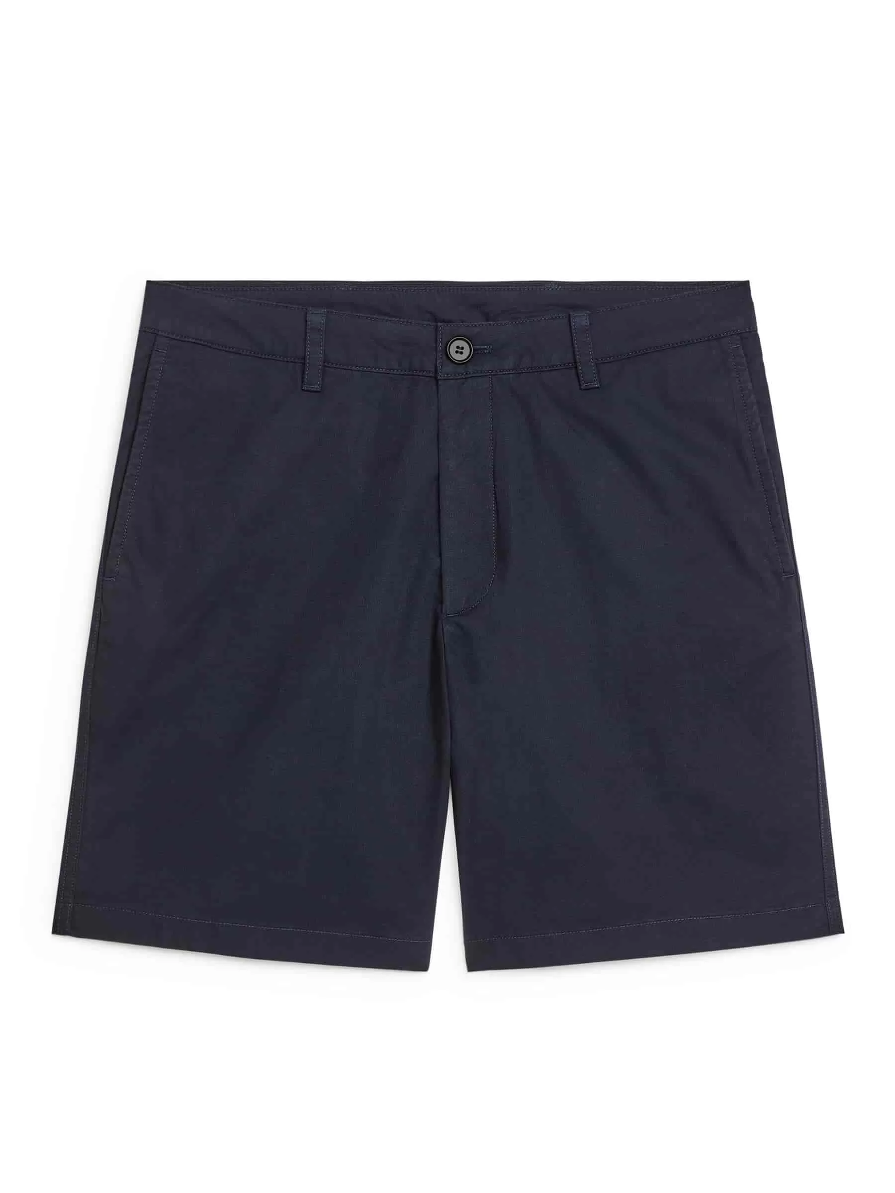 Shorts de algodón estilo chino con corte que llega hasta la mitad del muslo. Un estilo ligeramente entallado pero informal que viene con bolsillos laterales inclinados y dos bolsillos ribeteados en la parte trasera. Bolsillo para monedas en el interior del bolsillo delantero derecho. Bragueta con cremallera. Botón de corozo, elaborado a partir de nueces de tagua.