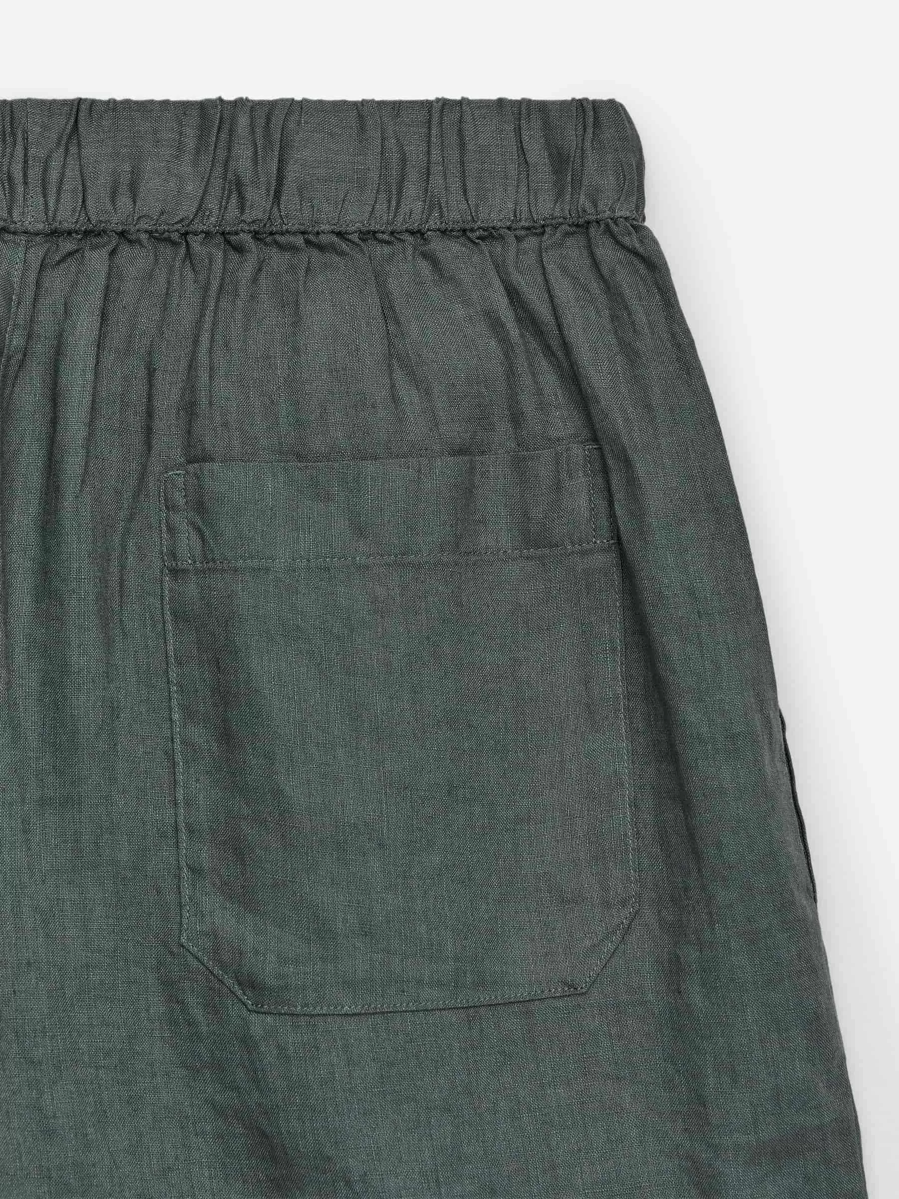 Shorts de lino con corte estándar. Un modelo sin cierre con elásticos y cordón de ajuste en la cintura, bolsillos en las costuras laterales y un único bolsillo de parche en la parte trasera. Bragueta de botones.