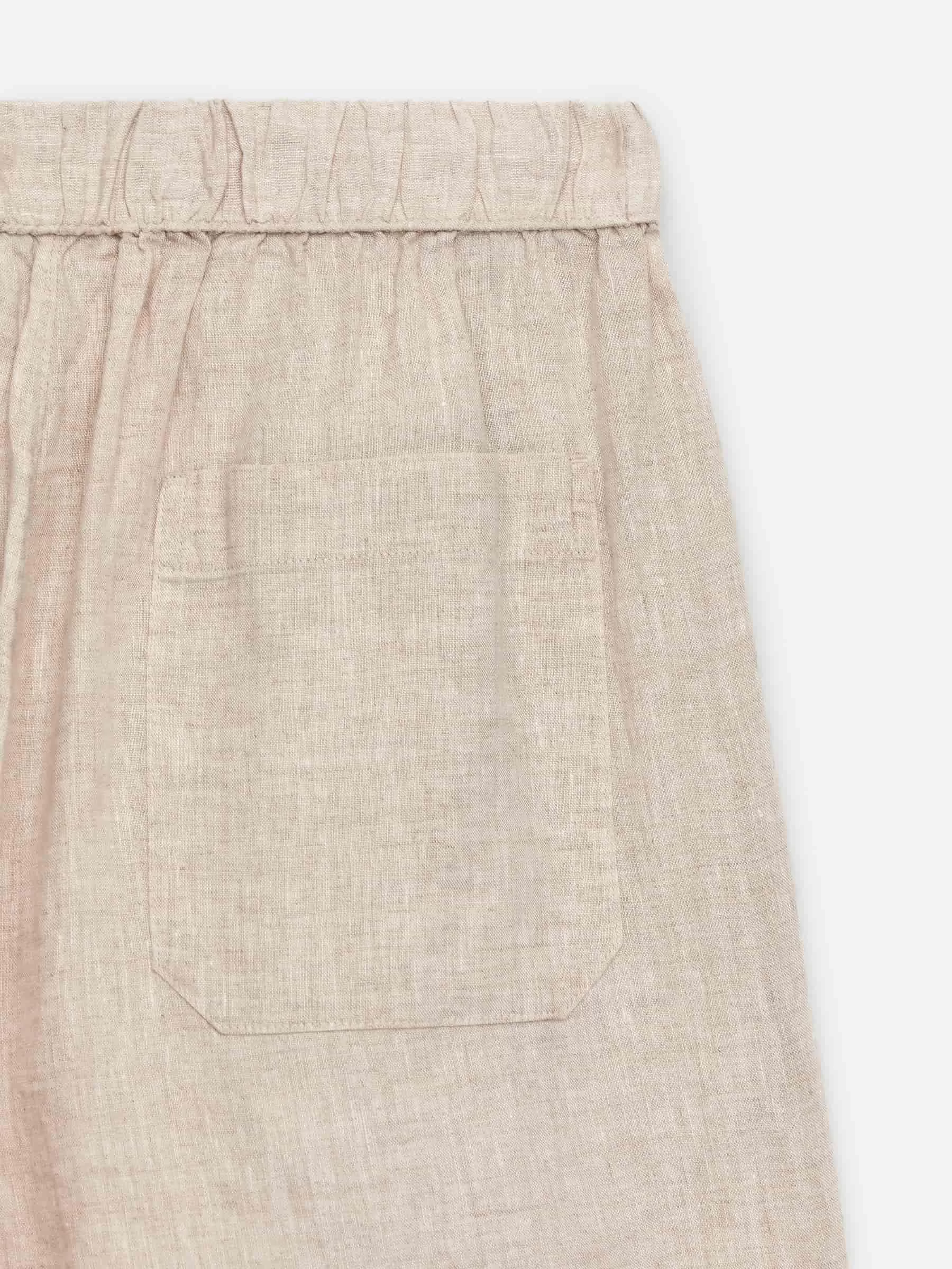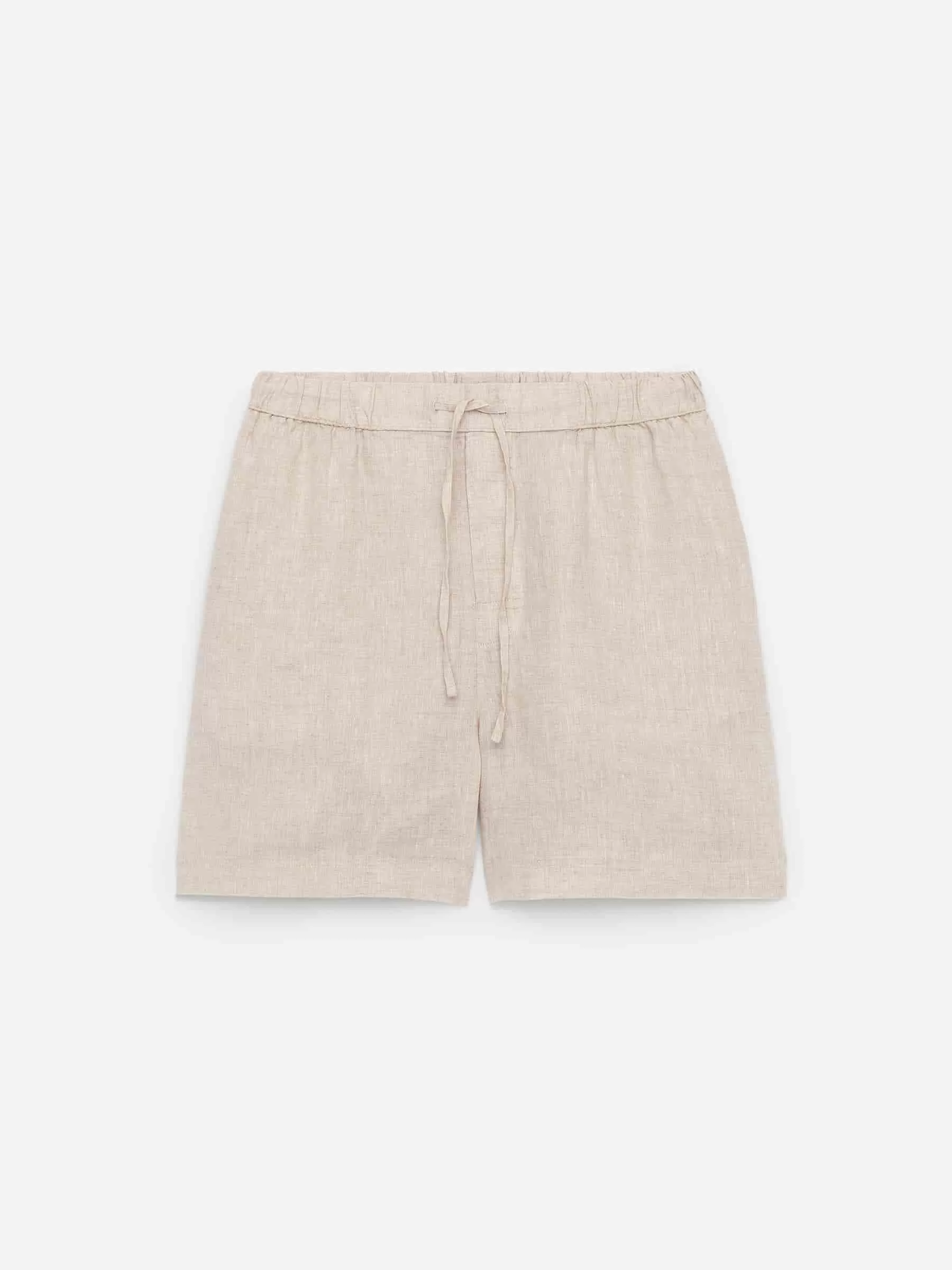 Shorts de lino con corte estándar. Un modelo sin cierre con elásticos y cordón de ajuste en la cintura, bolsillos en las costuras laterales y un único bolsillo de parche en la parte trasera. Bragueta de botones.