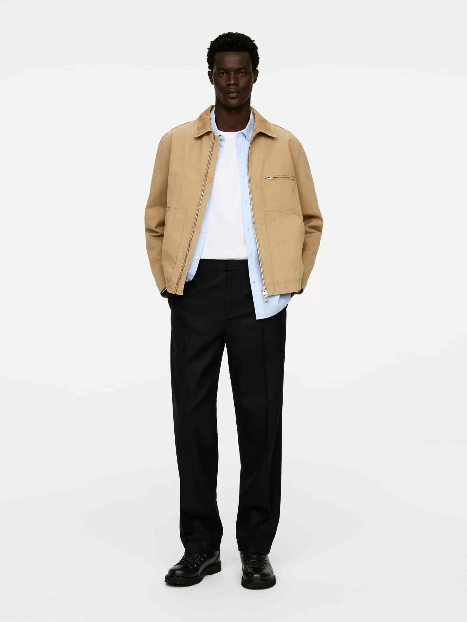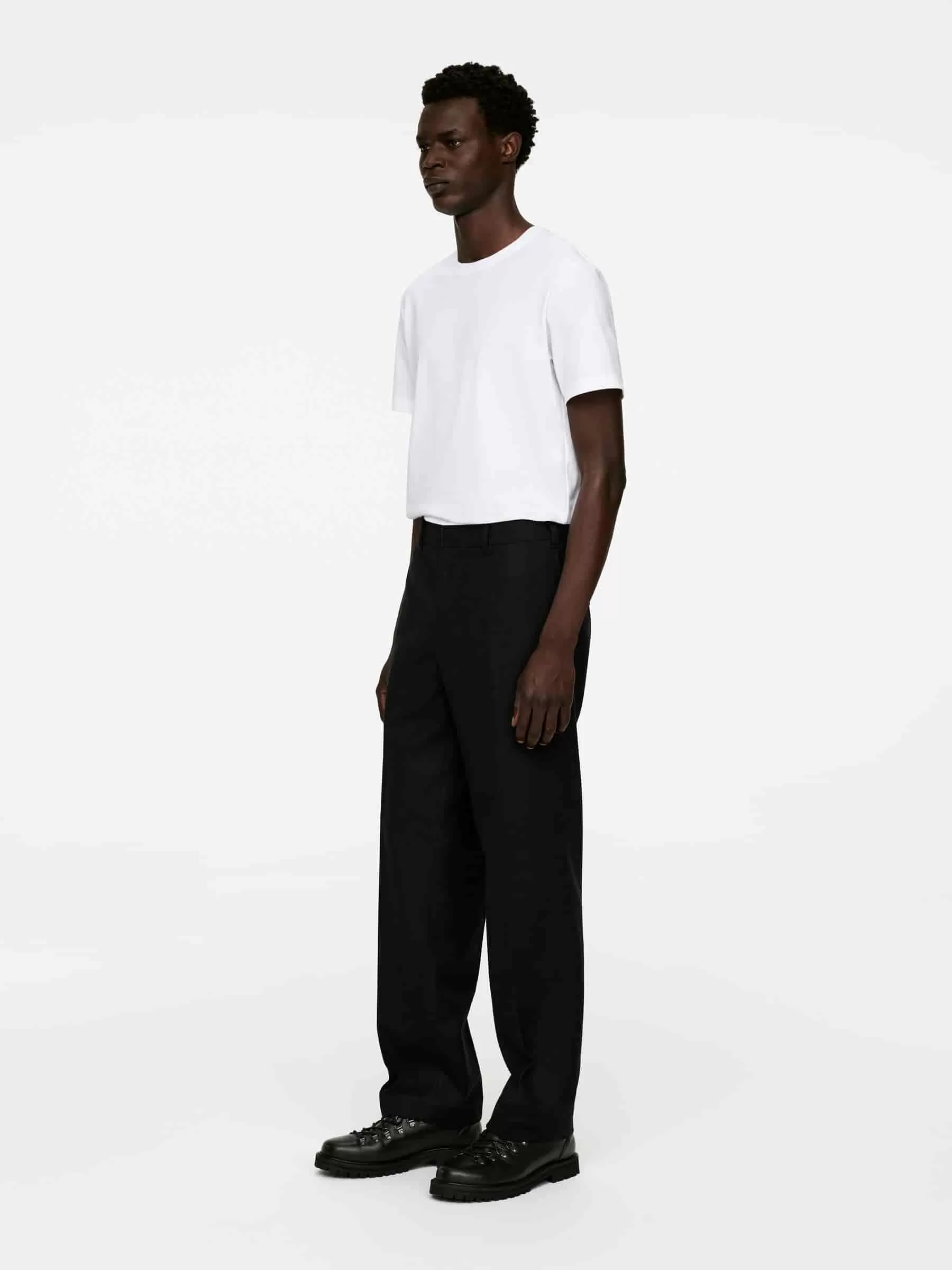 Pantalón confeccionado en lana RWS. Corte regular fit con raya a presión, bolsillos en las costuras laterales y dos bolsillos de ribete en la parte trasera. Cinturilla con trabillas, cierre de corchete y bragueta con cremallera. El producto contiene 100% lana RWS (TE-00047206). Los productos certificados según el Estándar de Lana Responsable (RWS) contienen fibra de lana procedente de granjas certificadas de forma independiente según los requisitos de bienestar animal y gestión de la tierra.