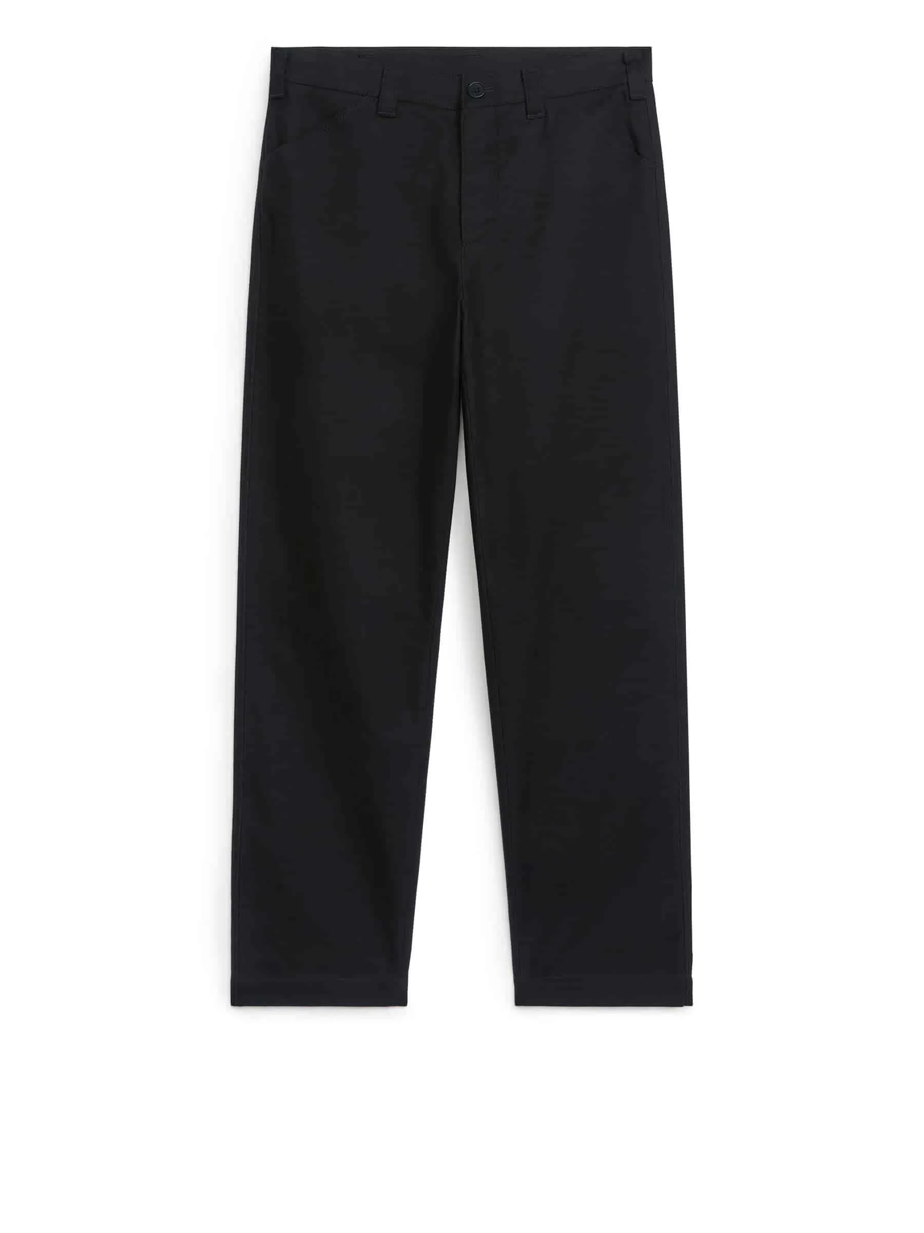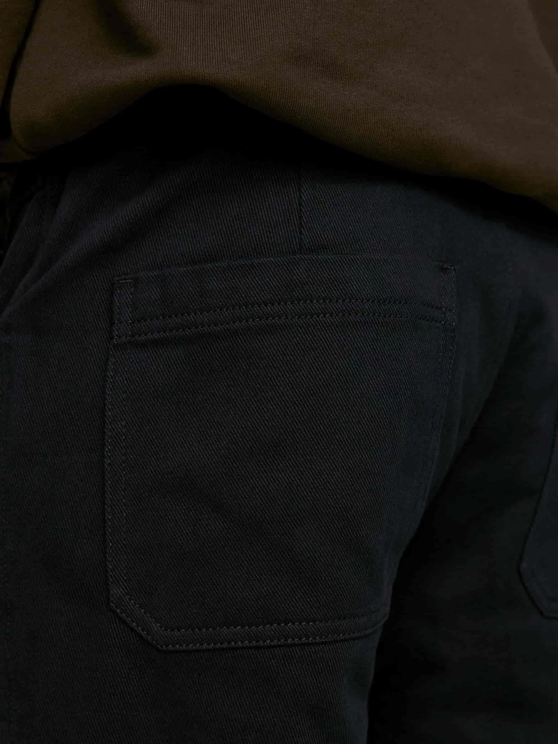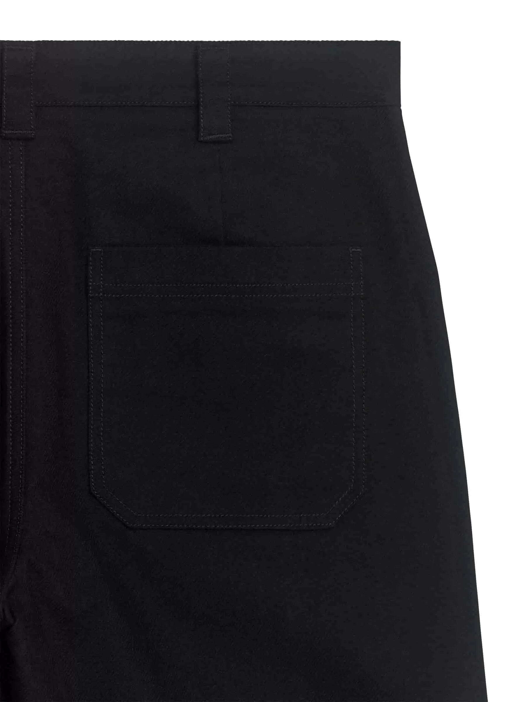 Pantalón de sarga de topo de algodón con bolsillos franceses en la parte delantera y bolsillos de parche en la parte trasera. Cierre con botón y bragueta con cremallera.