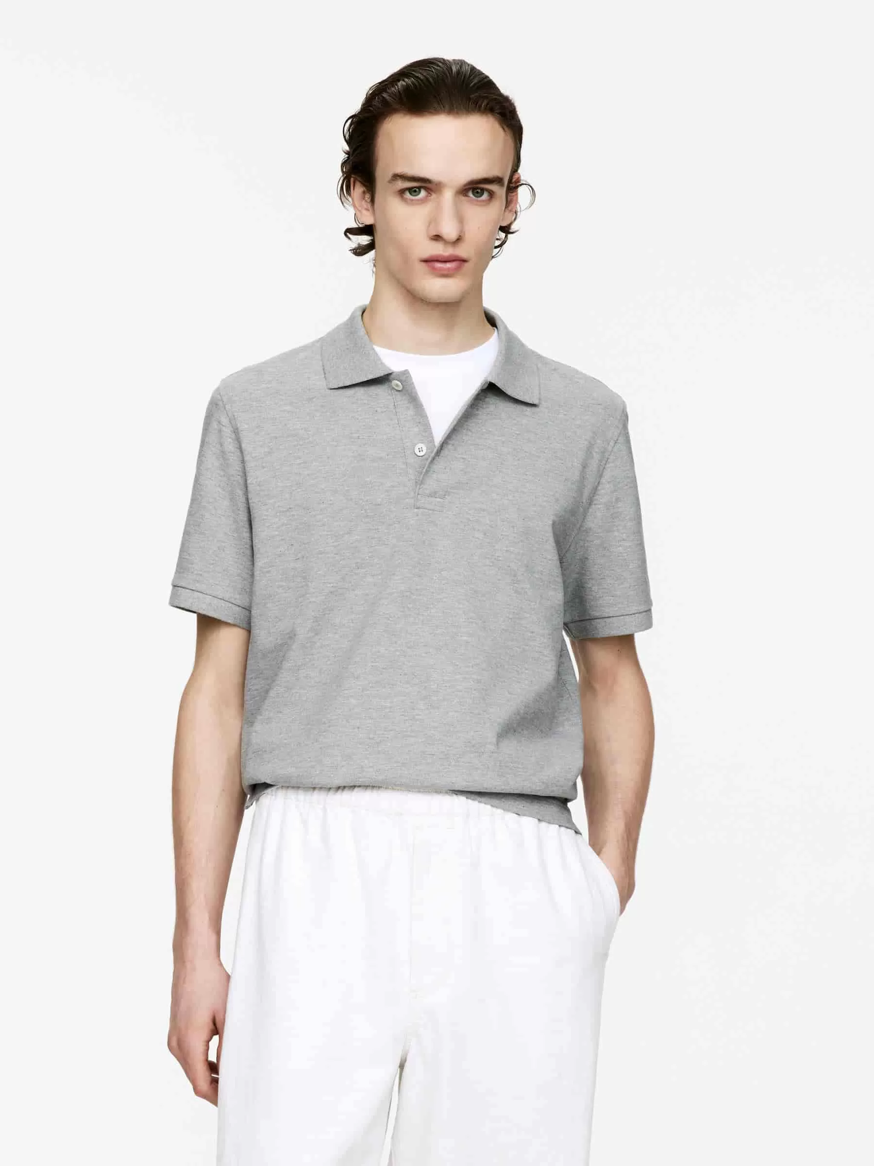 Este polo de manga corta, confeccionado en punto piqué de algodón supima, presenta detalles clásicos como cuello y puños de canalé y media tapeta abotonada. Corte regular fit con aberturas cortas en las costuras laterales.