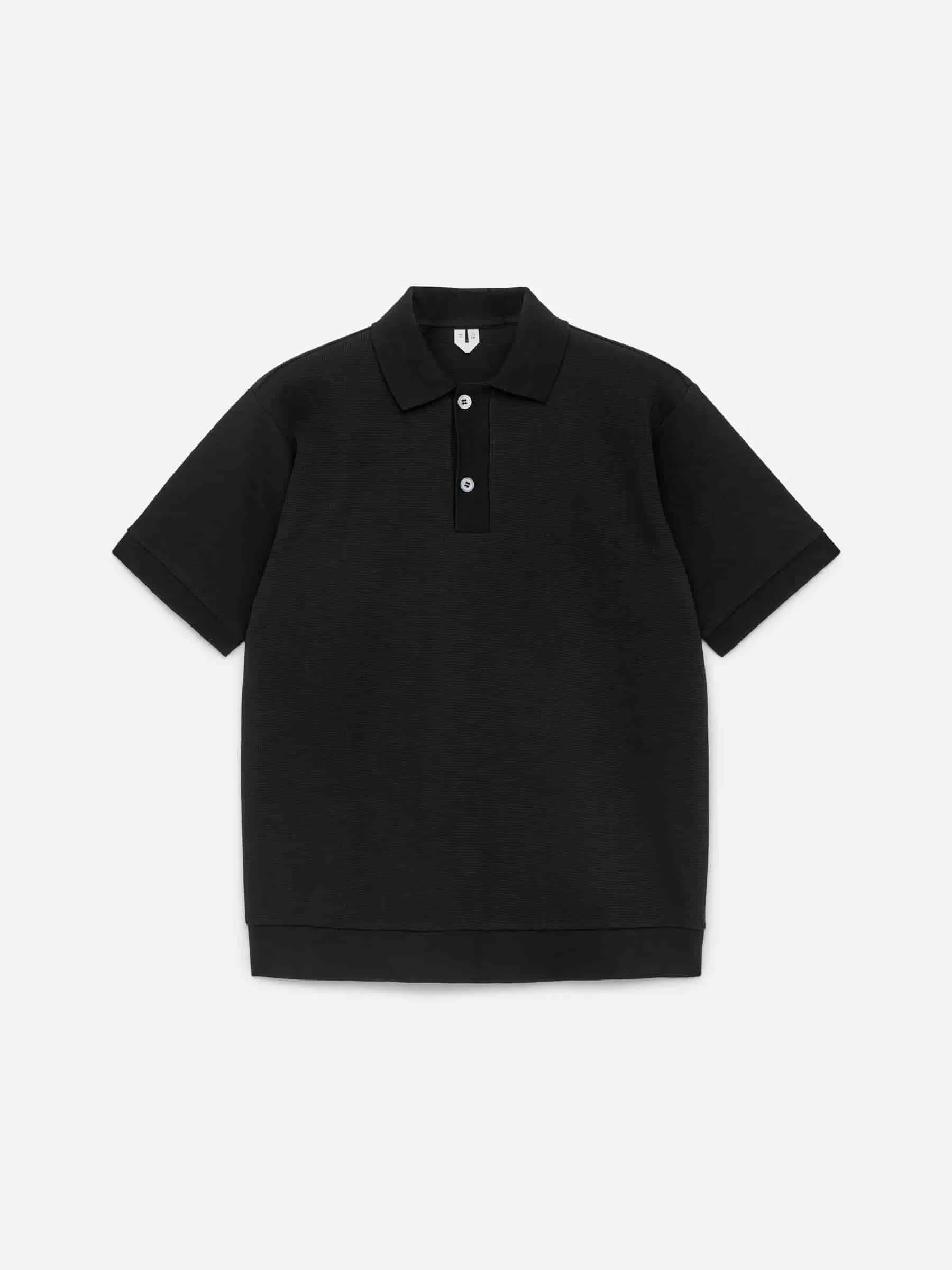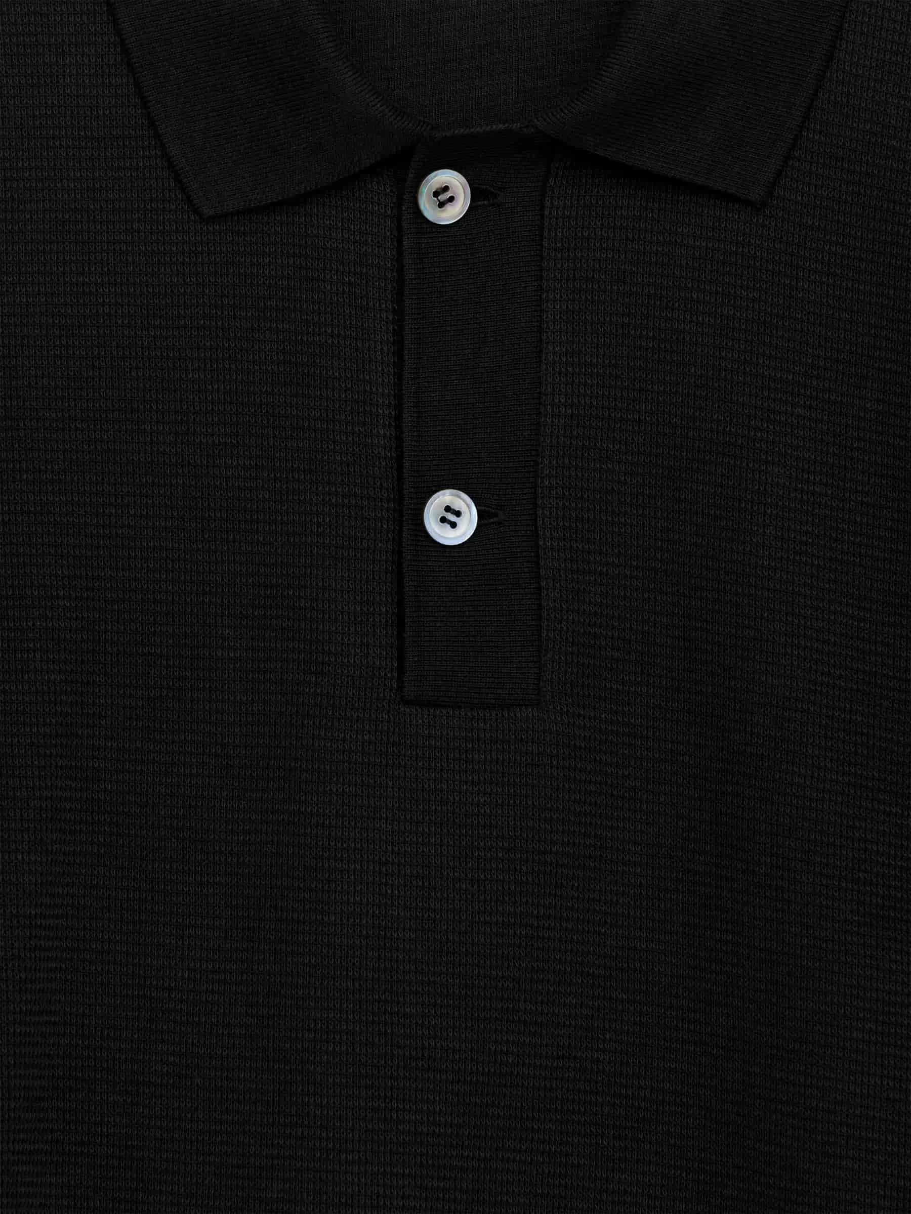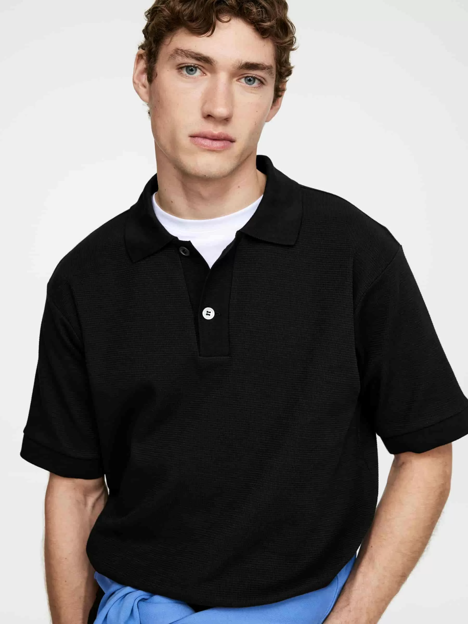 Polo de manga corta confeccionado en punto de algodón con textura tipo gofre. Corte para un ajuste relajado con hombros ligeramente caídos. Pasamanería de punto canalé. Botones de nácar, lo que significa que este producto contiene material de origen animal.