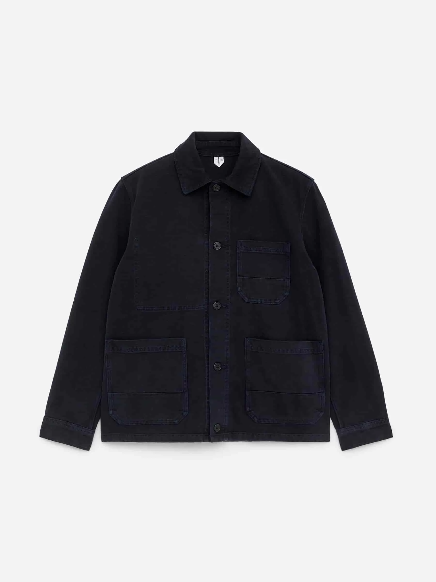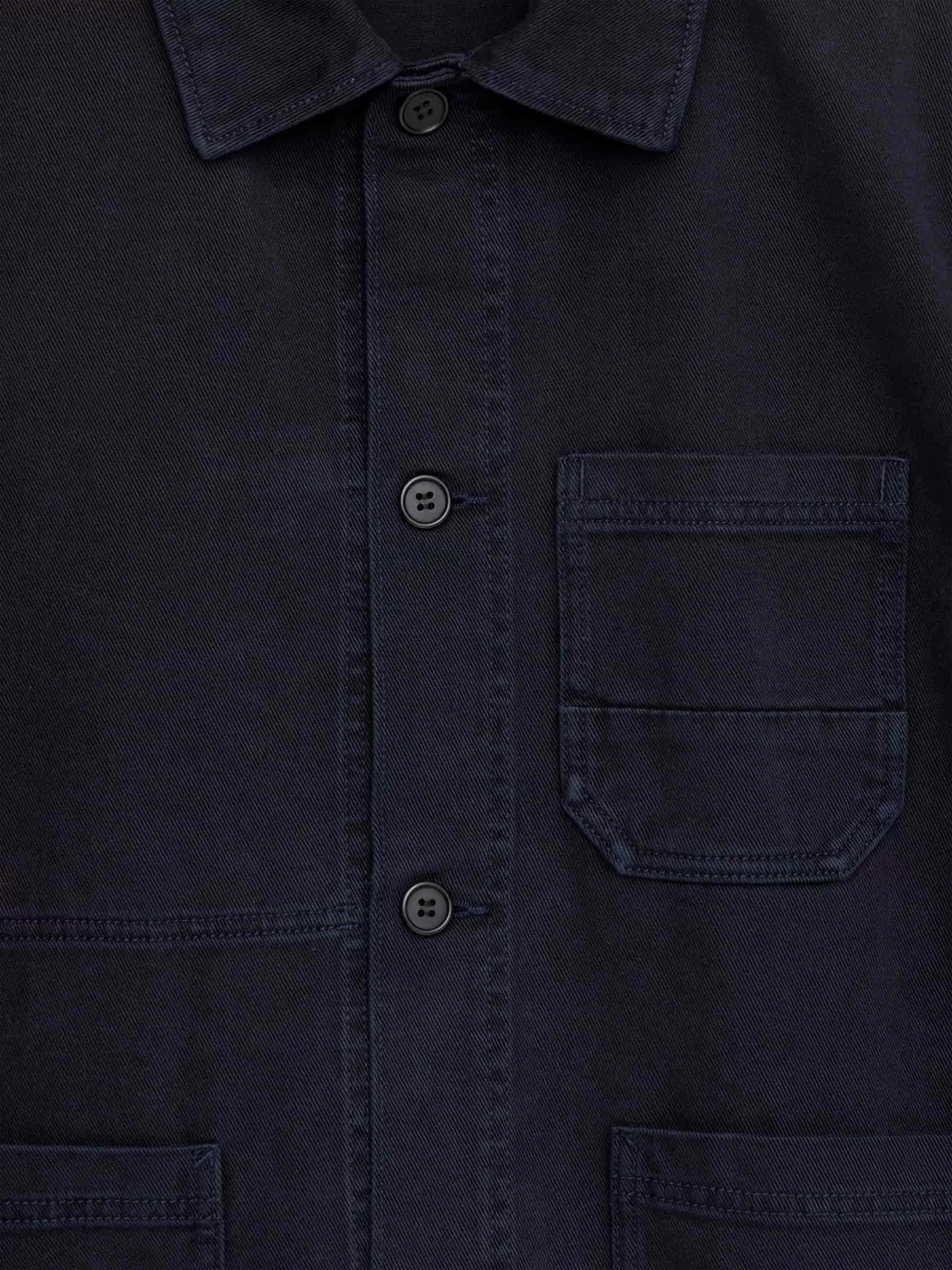 Esta sobrecamisa, confeccionada en sarga de algodón cepillada a la izquierda, está inspirada en el estilo de ropa de trabajo francesa. Con un corte ligeramente cuadrado y un frente abotonado, esta versión tiene una apariencia sobreteñida.