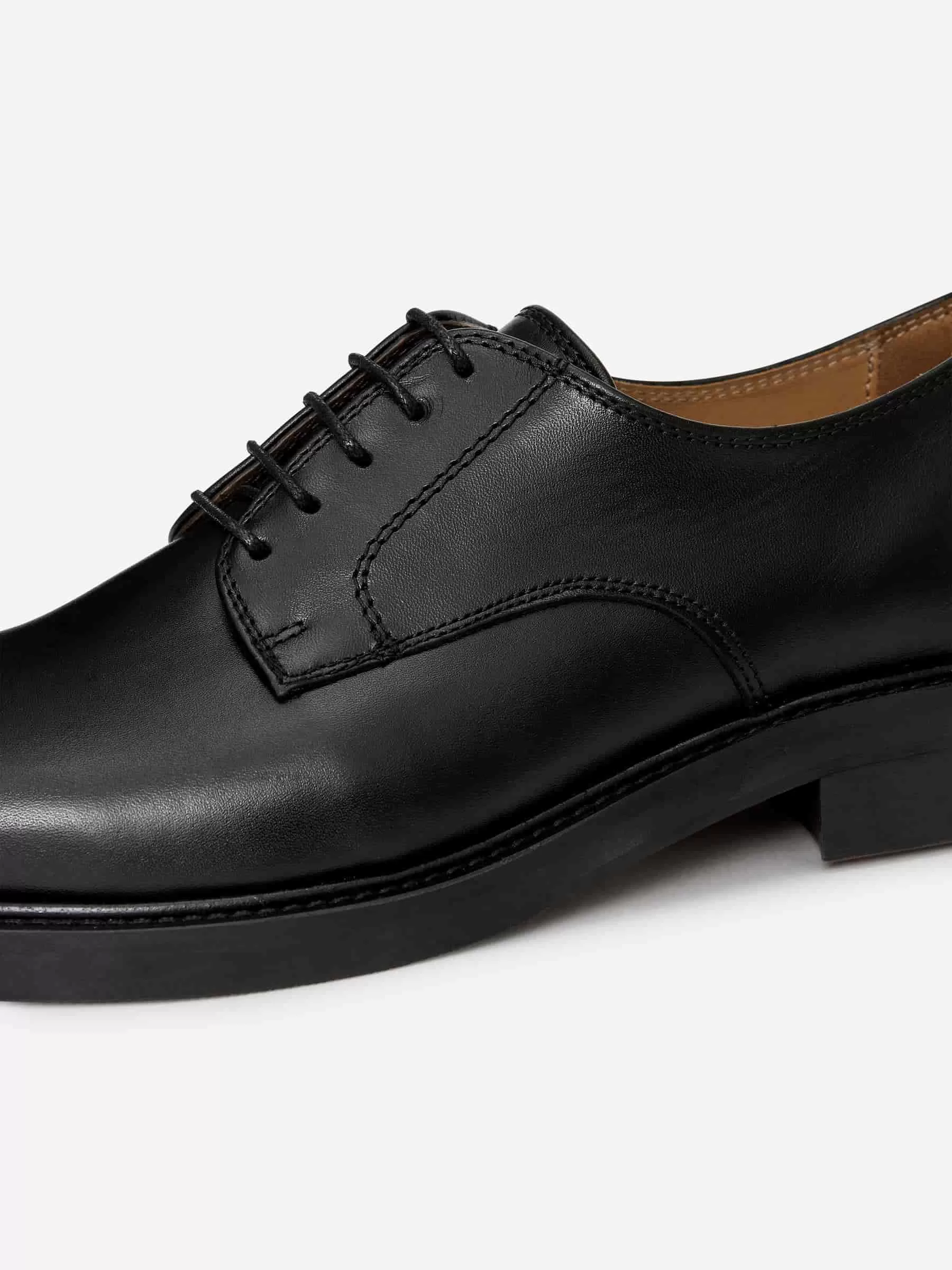 Zapatos derby clásicos con suela de piel soldada, cinco ojales y tacón de piel. Forro de piel y cordones de algodón encerado.