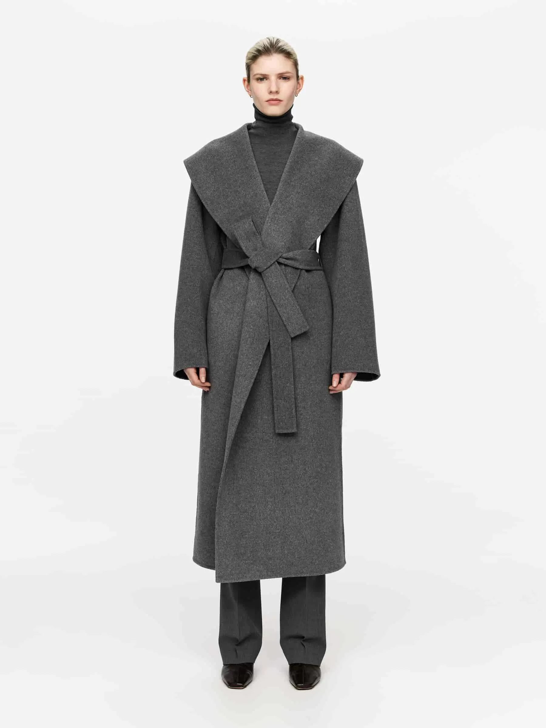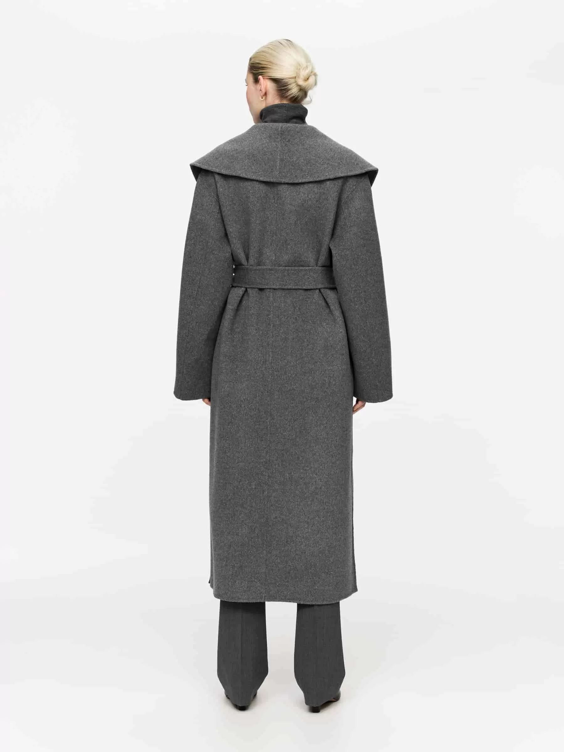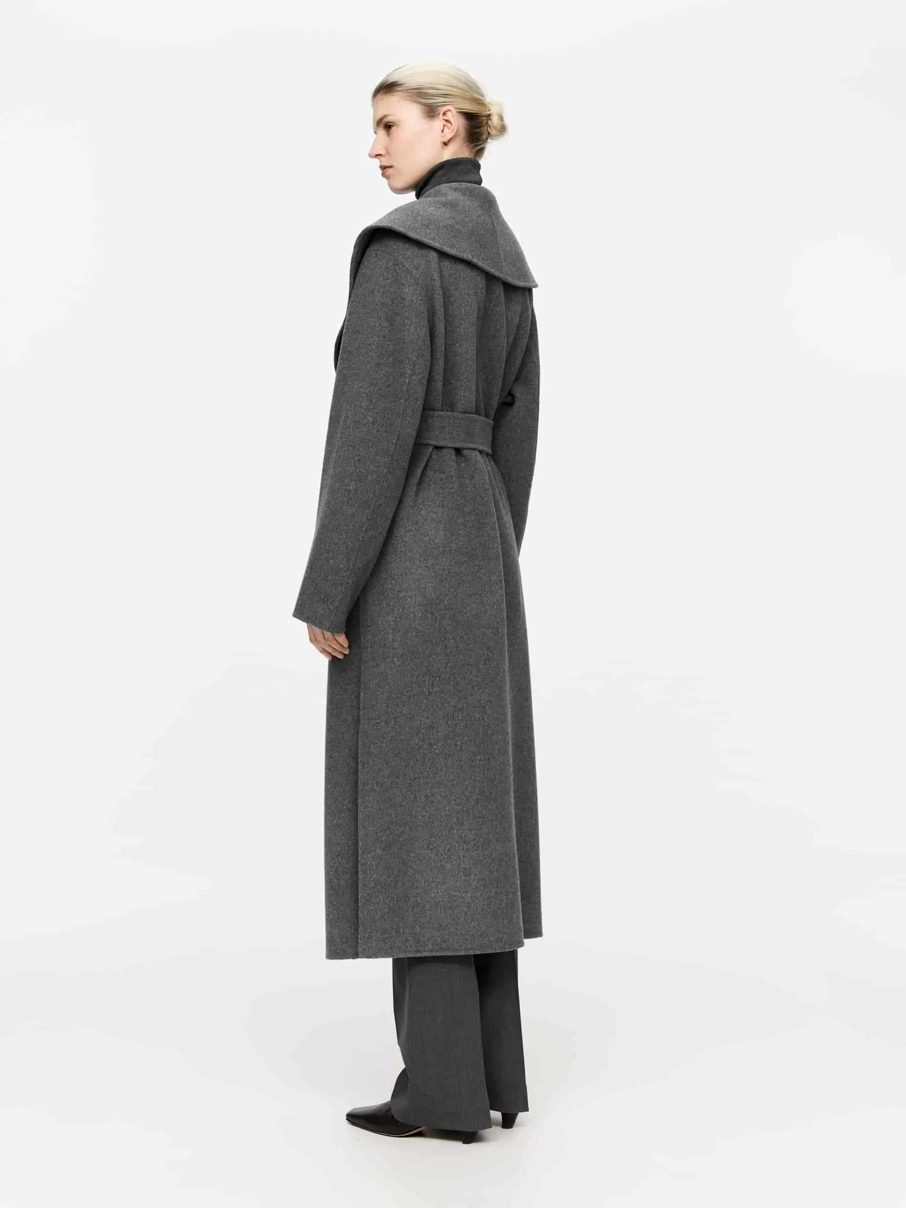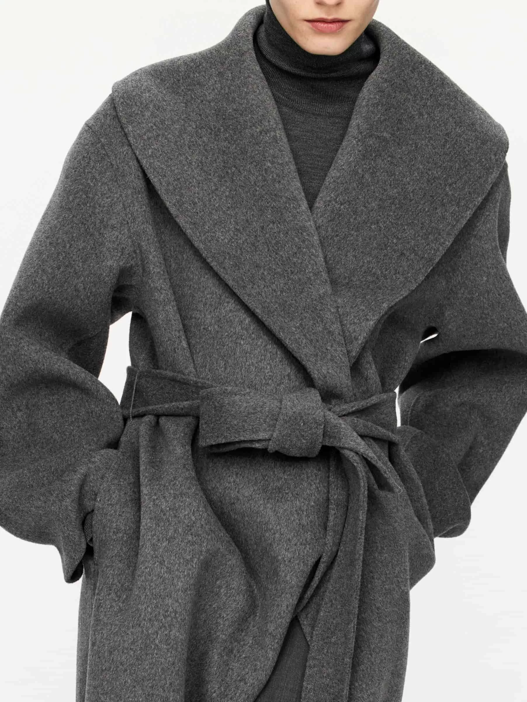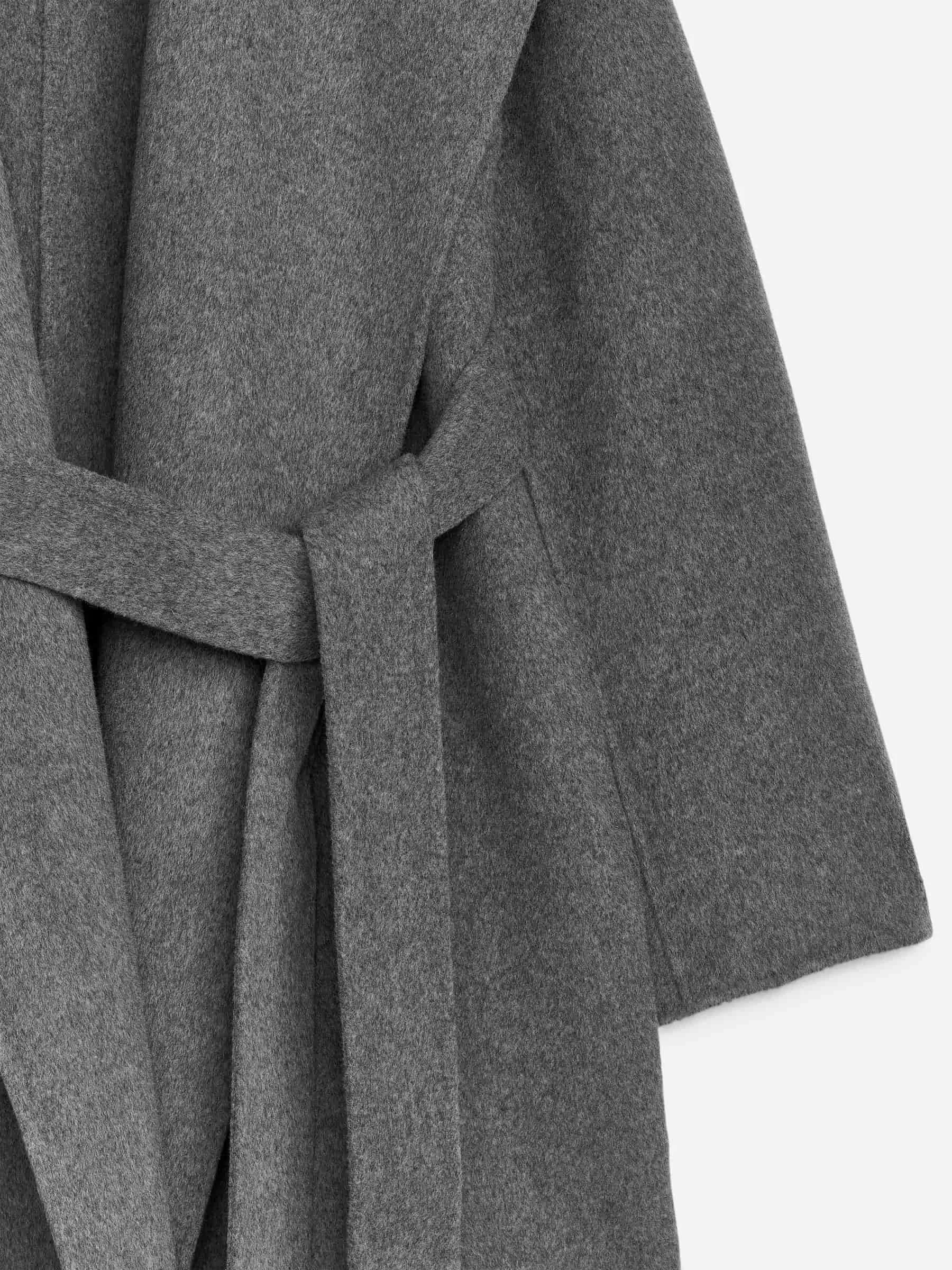 Abrigo con cuello chal confeccionado en tejido mezcla de lana de doble cara. Modelo con cinturón, bolsillos en las costuras laterales y abertura en la espalda. El tejido exterior contiene un 80 % de lana RWS (TE-00047206). Los productos certificados según el Estándar de Lana Responsable (RWS) contienen fibra de lana procedente de granjas certificadas de forma independiente según los requisitos de bienestar animal y gestión de la tierra.