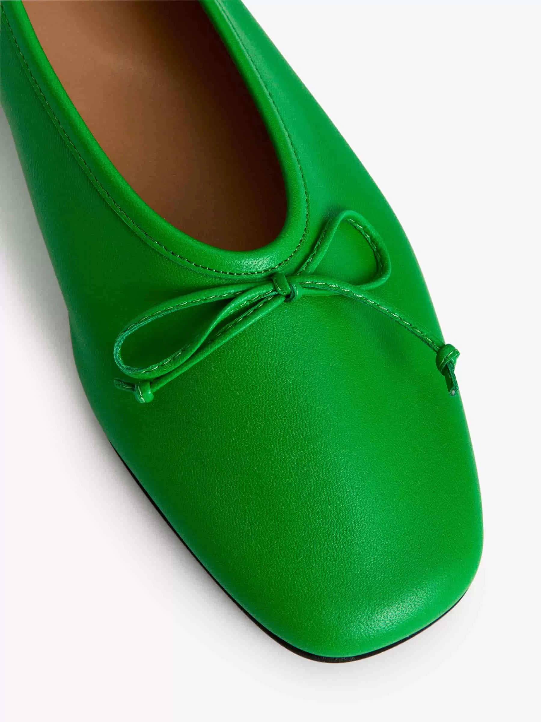 Bailarina confeccionada en piel suave sometida a un proceso de curtido sin metales. Diseñado con una línea superior alta y un detalle de lazo de cuero. Forro de piel y planta de cuero.