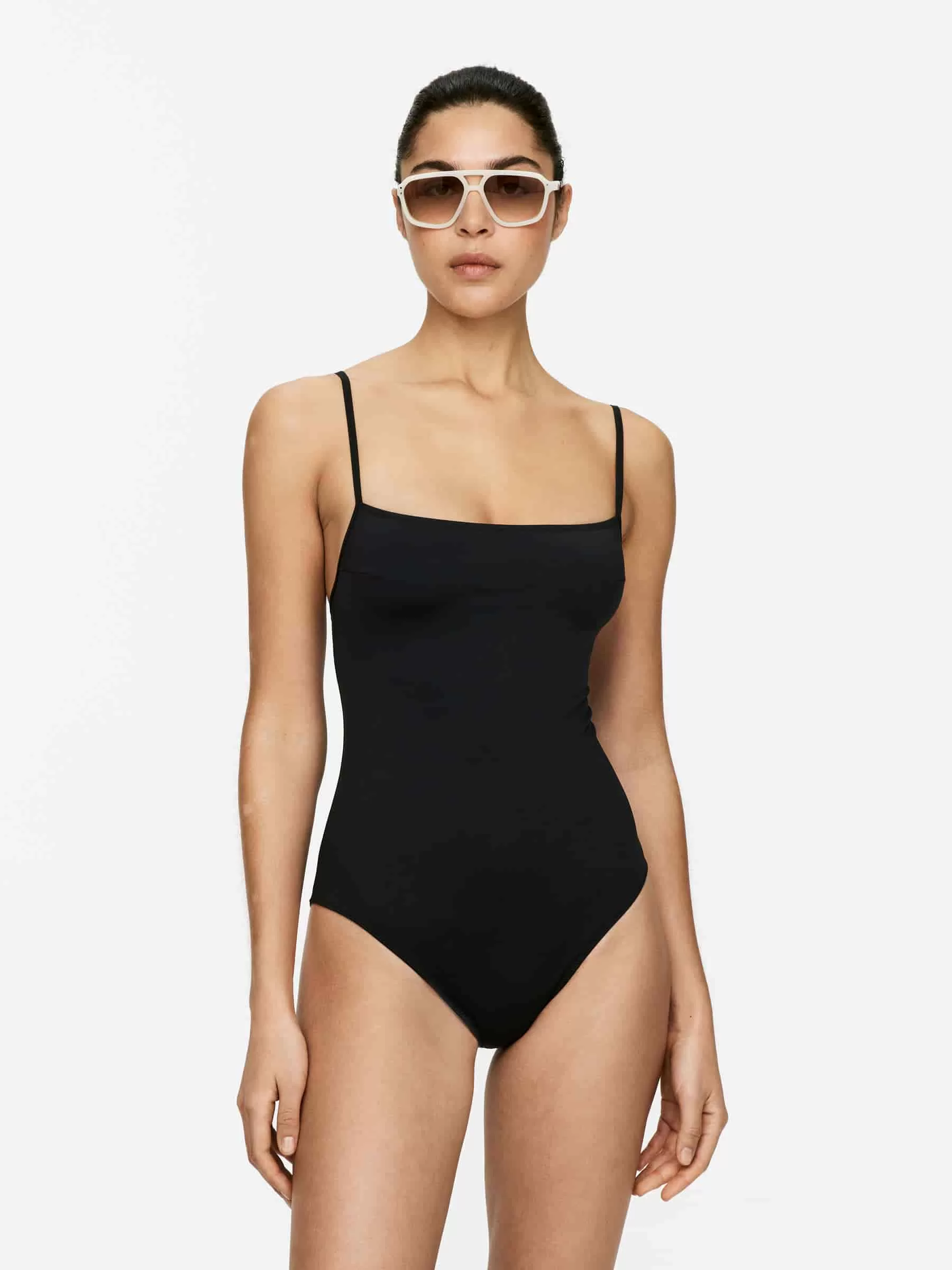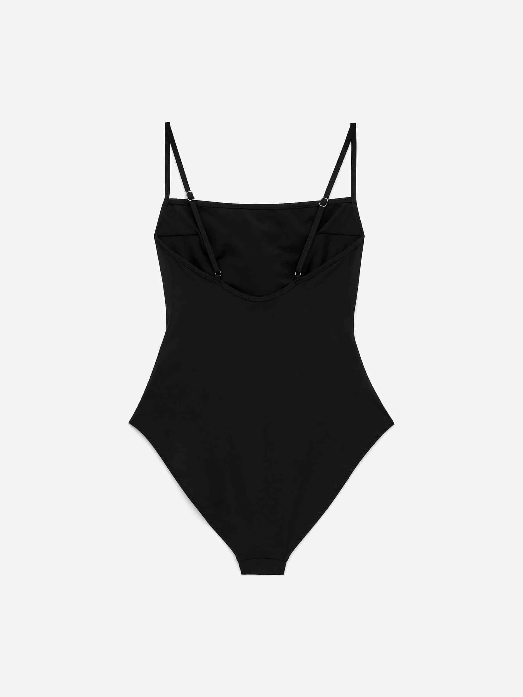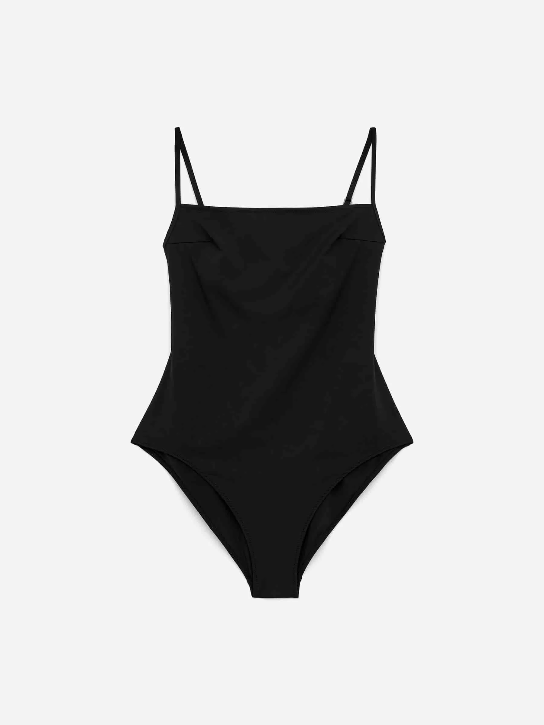 Traje de baño con escote recto, tirantes finos ajustables y pinzas en el pecho para una forma suave y un ajuste perfecto. Totalmente forrado.