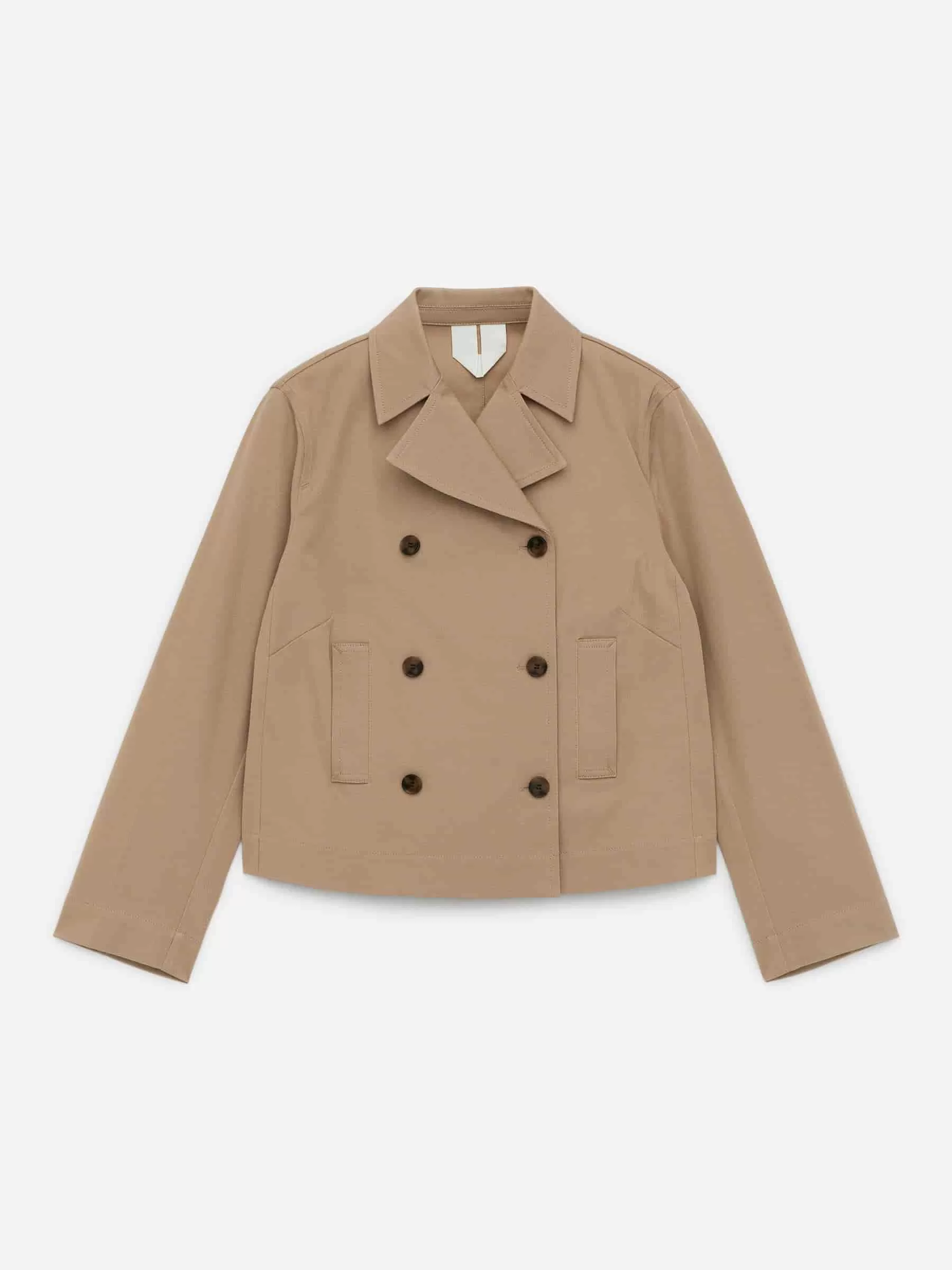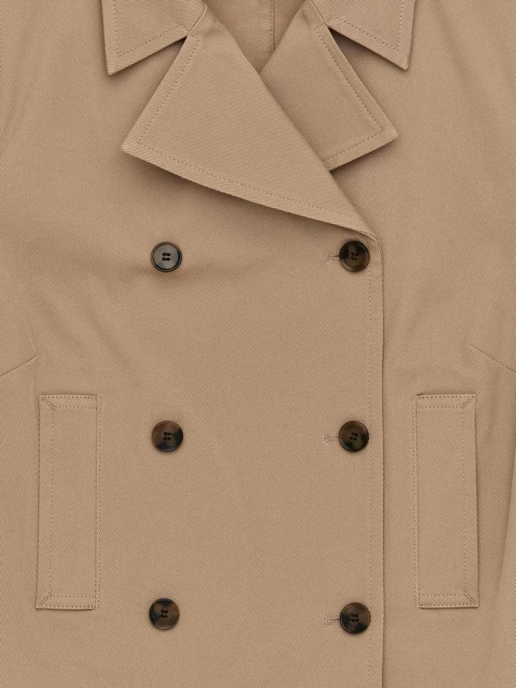 Blazer entallado confeccionado en sarga de algodón elástico. Un elegante estilo cruzado con botones y bolsillos en la parte delantera. Sin forro.