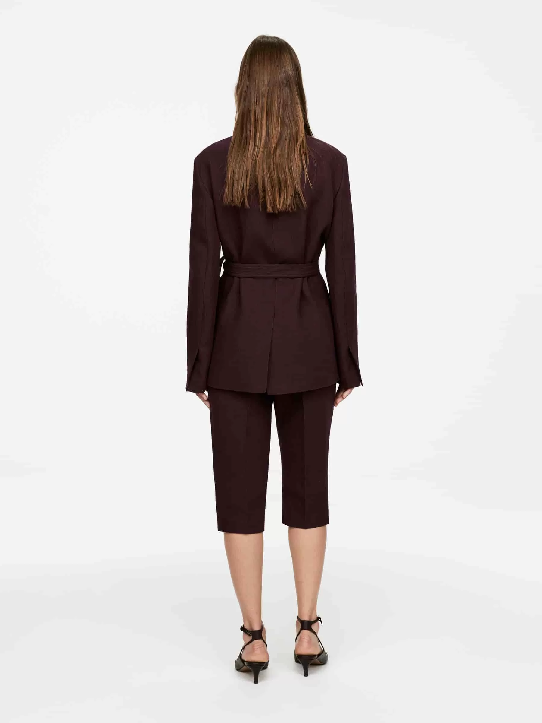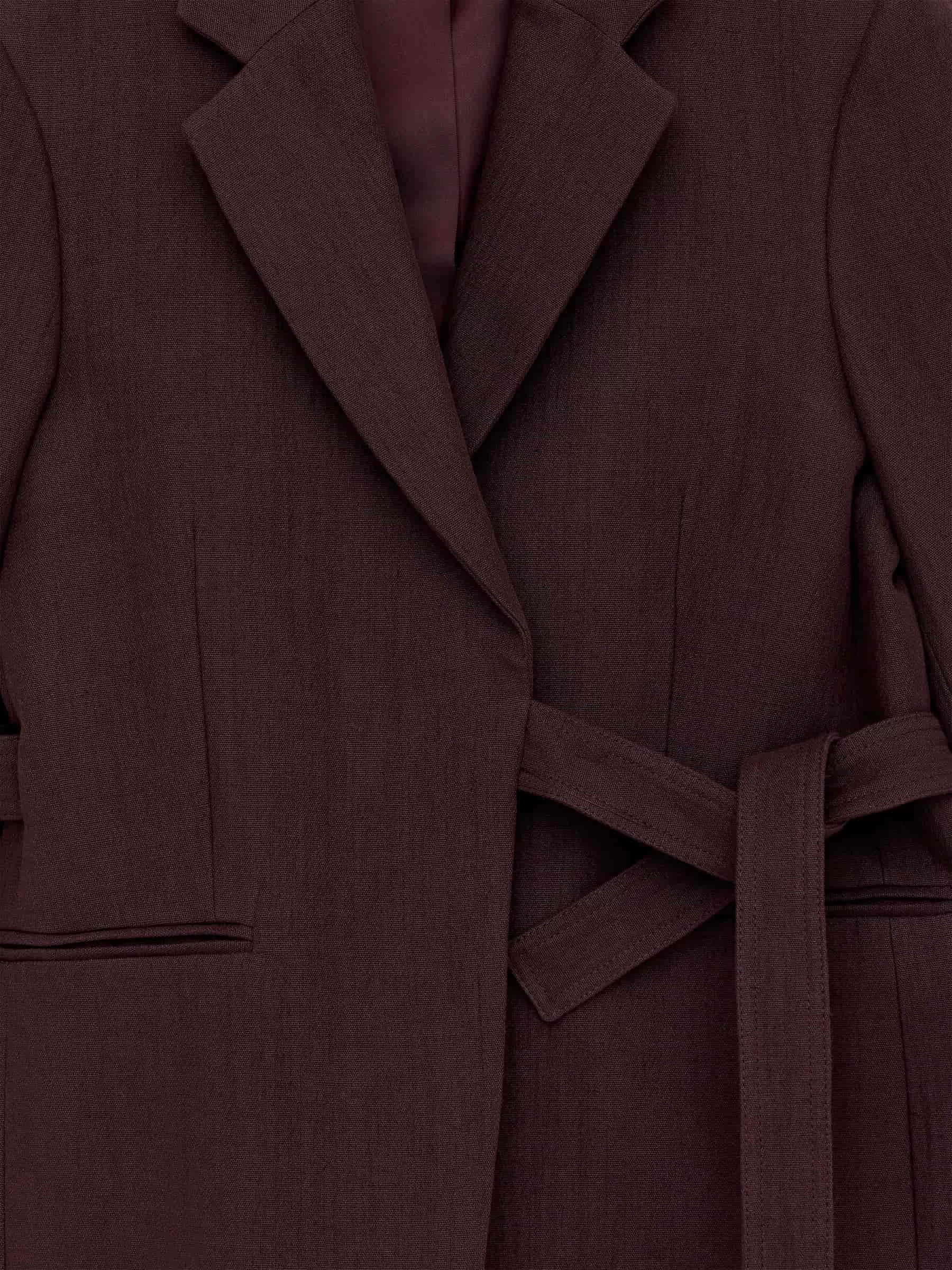 Blazer confeccionado en una mezcla de algodón y lino. Un modelo extragrande totalmente forrado con solapa de muesca, bolsillos ribeteados dobles y una correa para atar para cerrar. Ventilación en el centro de la espalda y en los dobladillos de las mangas.
