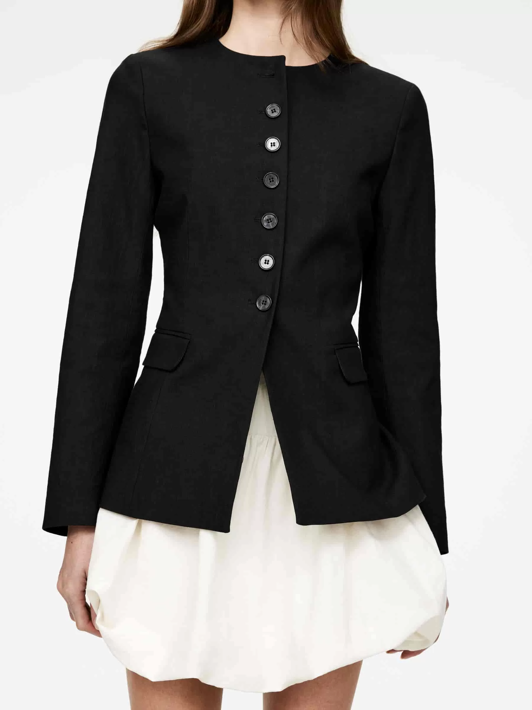 Blazer sin cuello con cierre de botones, detalle de pinzas y bolsillos con solapa. Este estilo forrado tiene un corte entallado.