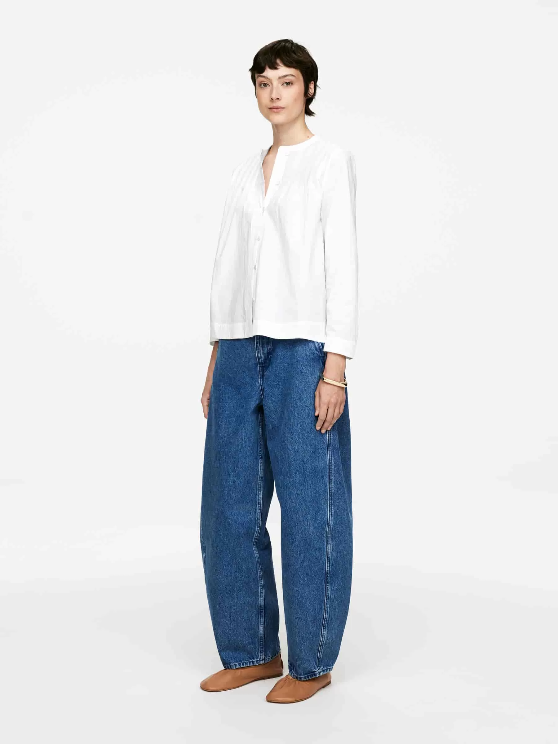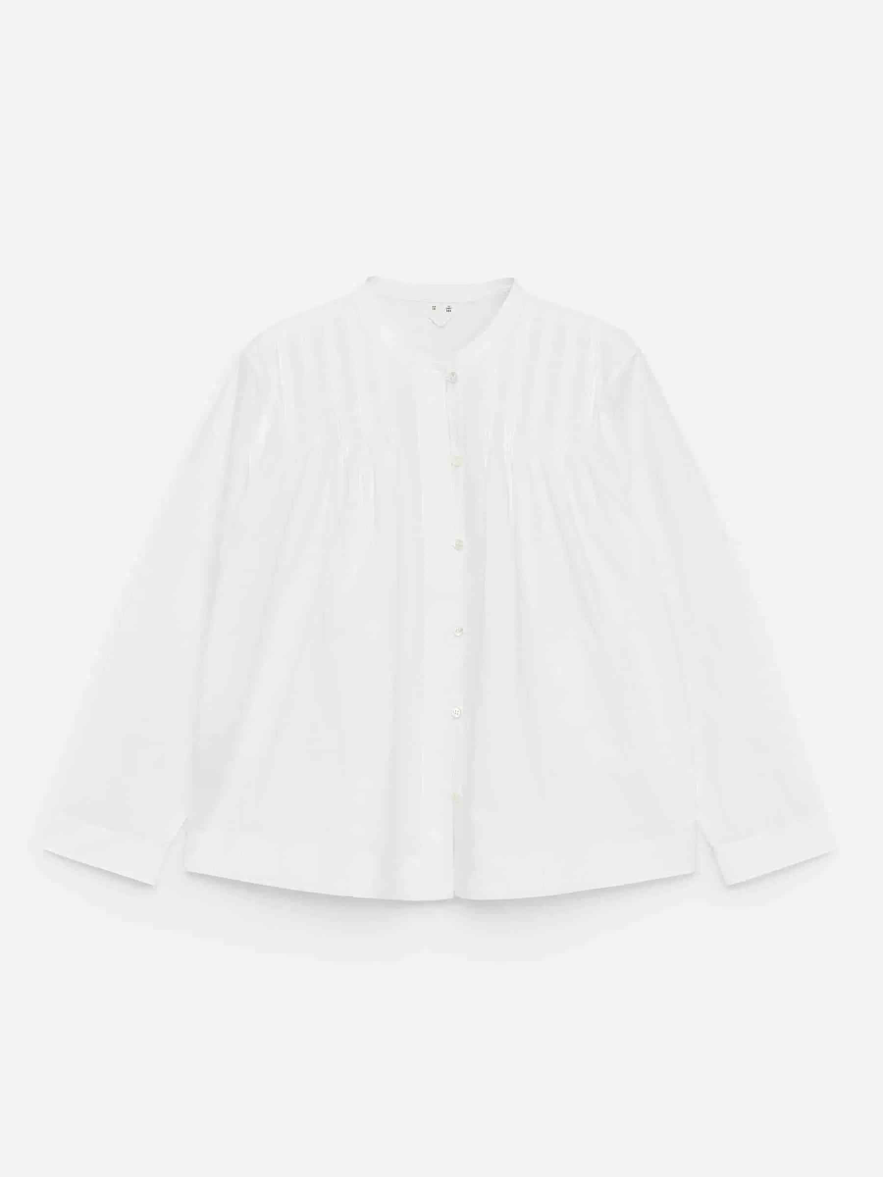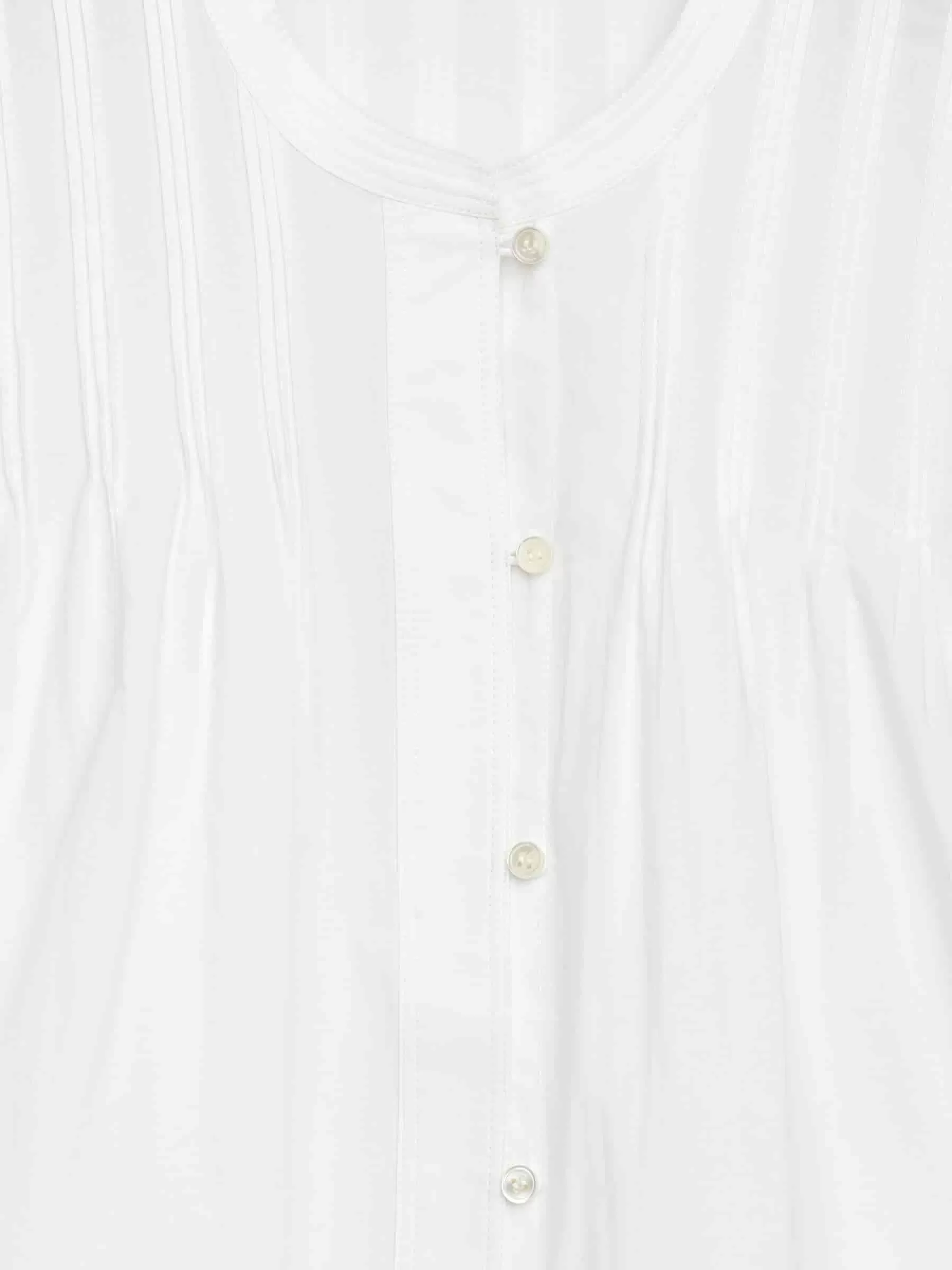 Blusa en tejido de algodón con detalle de pliegues en el pecho. Escote redondeado y parte delantera abotonada.